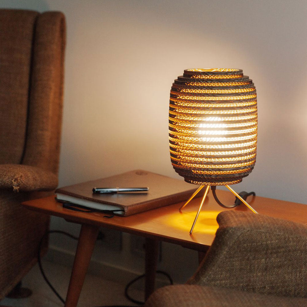 Texture and organic gallery style merge to offer an inspired look in the Ausi Table Lamp from Graypants. Ideal for illuminating a bedroom or living space with glowing light, this table lamp features a visually pleasing silhouette with a shade handcrafted of recycled cardboard with laser-cut horizontal striping emitting light through its porous surface. A subtle, slender metal tripod base complements its minimalist look with perfection.