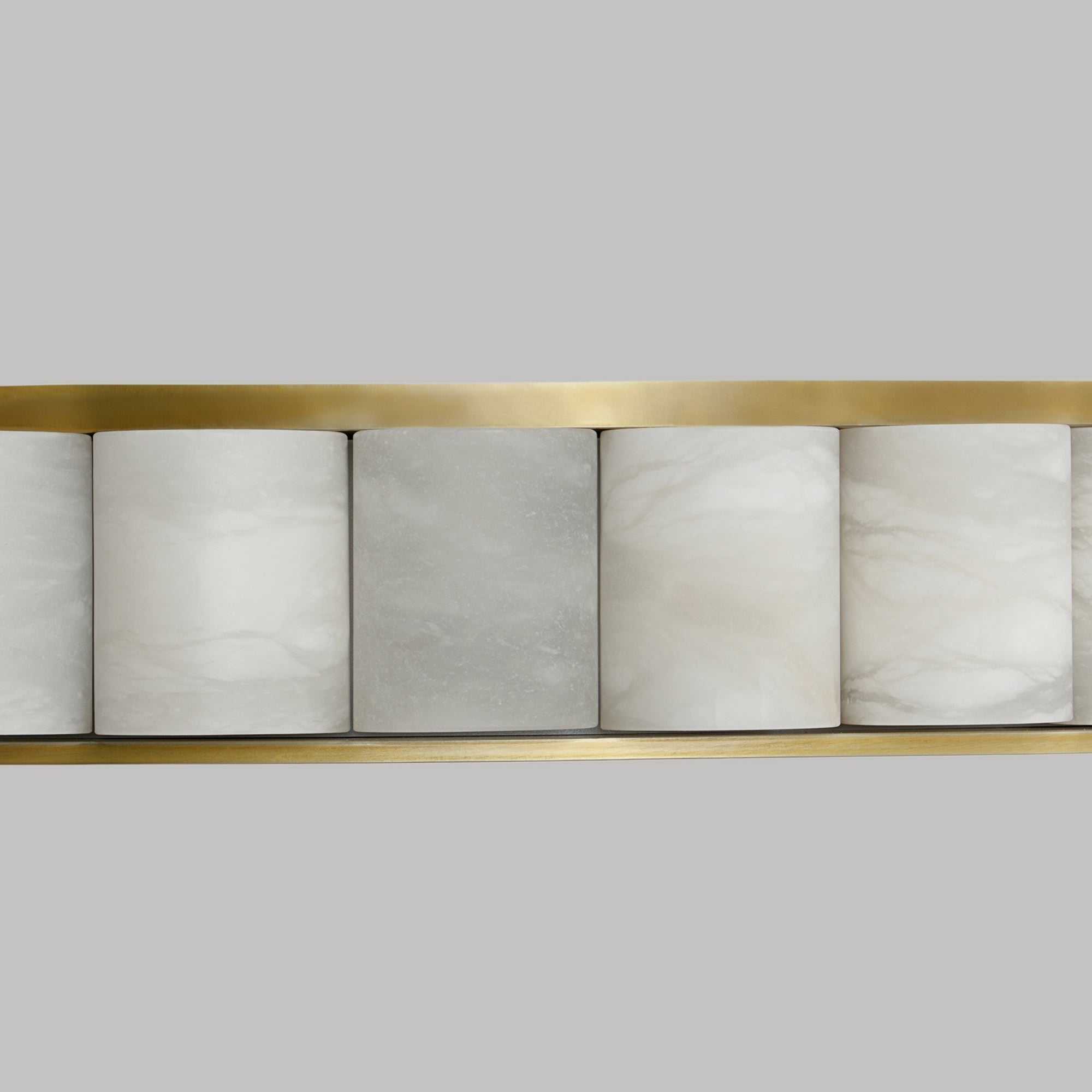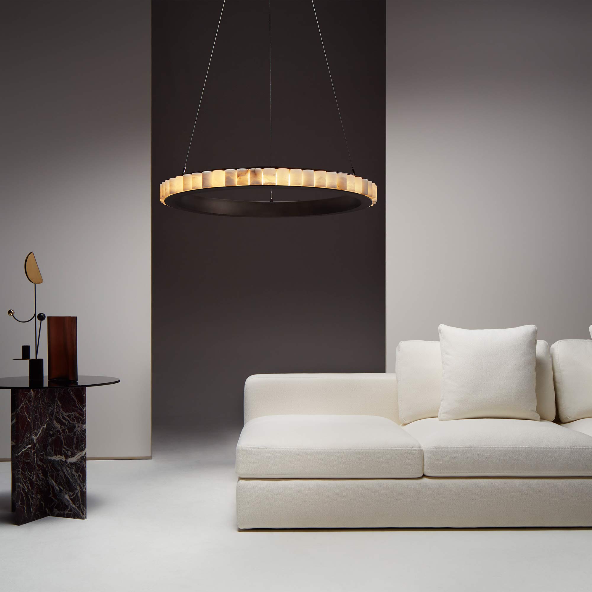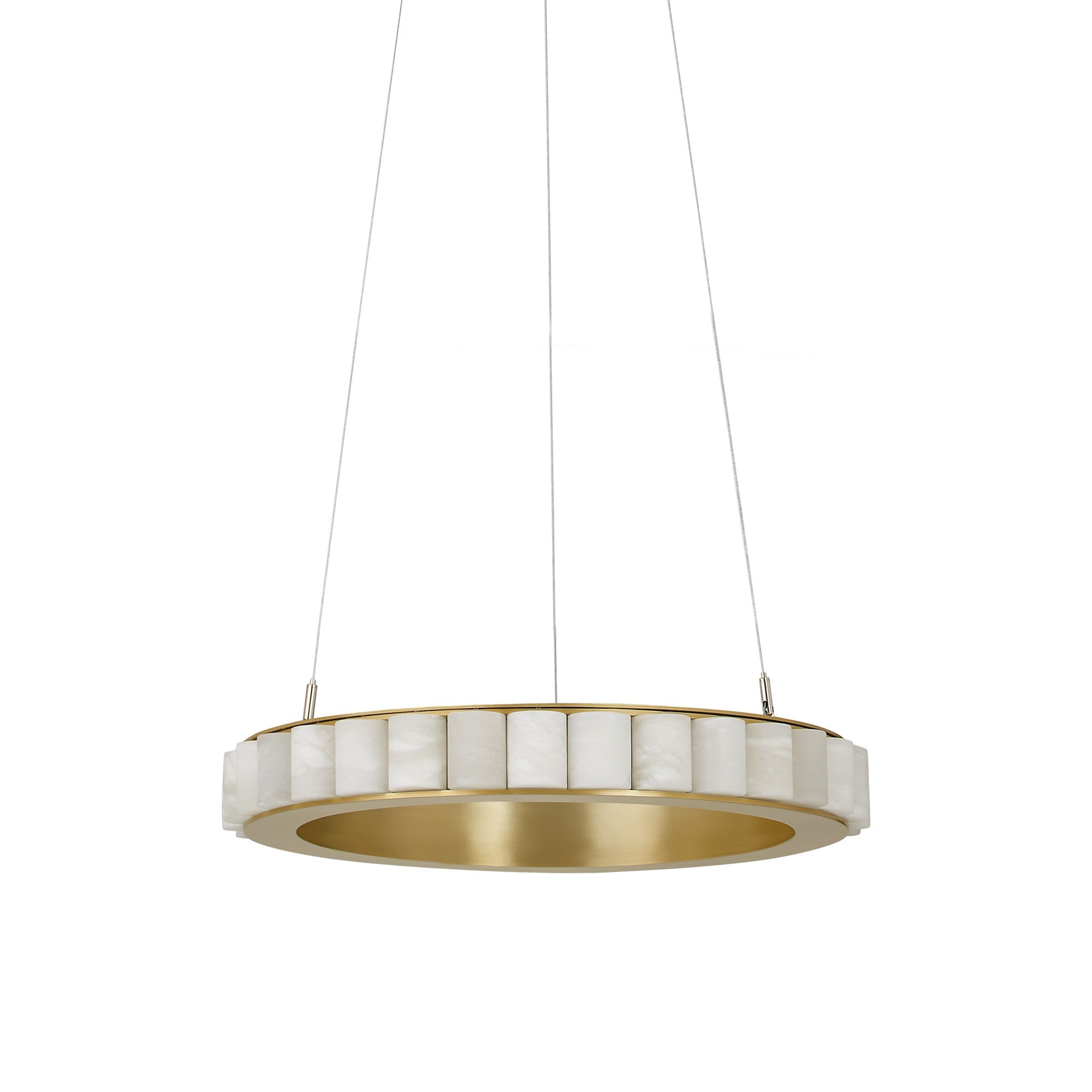 A glam feel follows decadent alabaster lining a metal ring, creating a source of soft, glowing light that changes the mood in a modern space. The Avalon LED Chandelier from CTO Lighting mixes gleaming metal with alabaster to create a simplified silhouette with plenty of decadence. This fixture emits energy-efficient lighting.