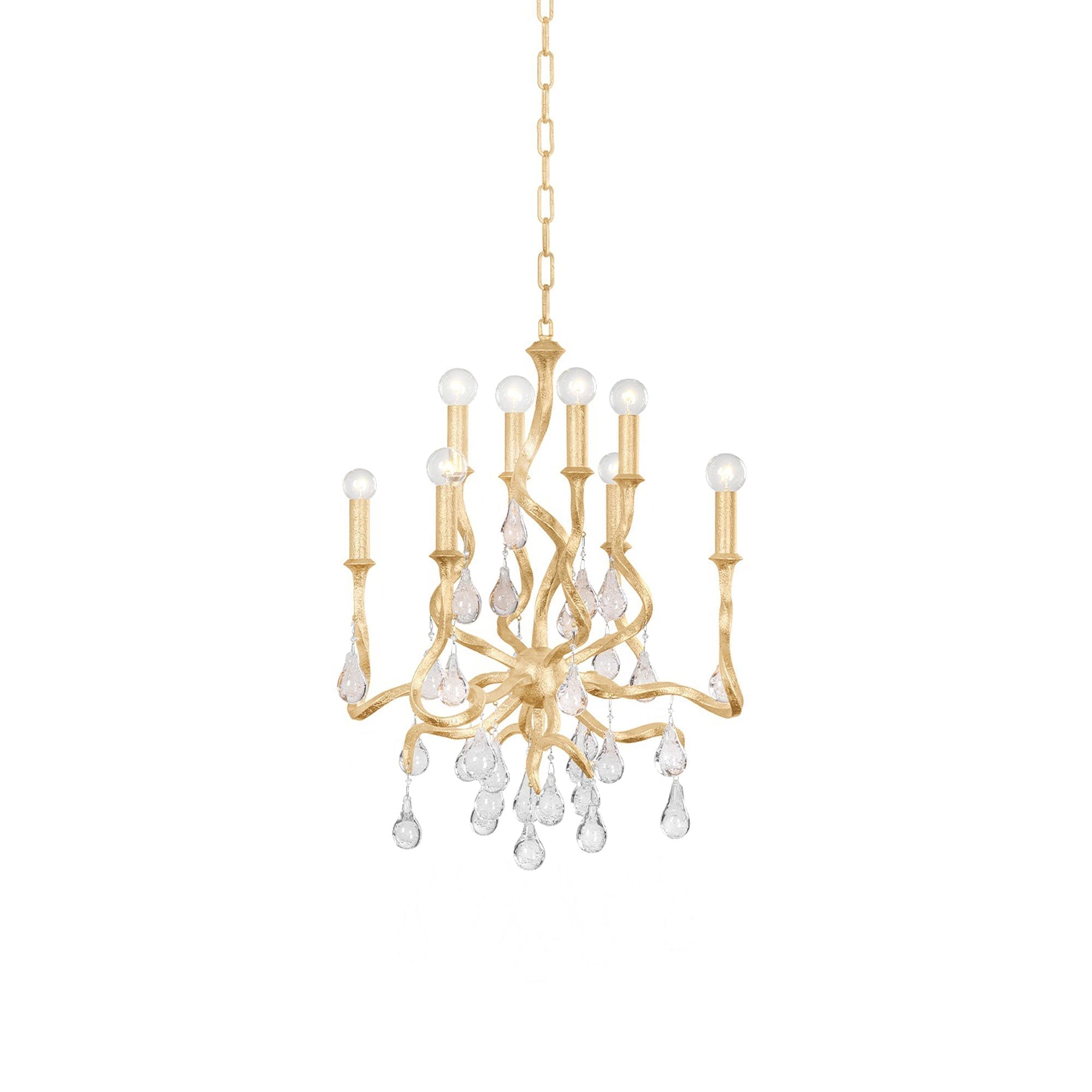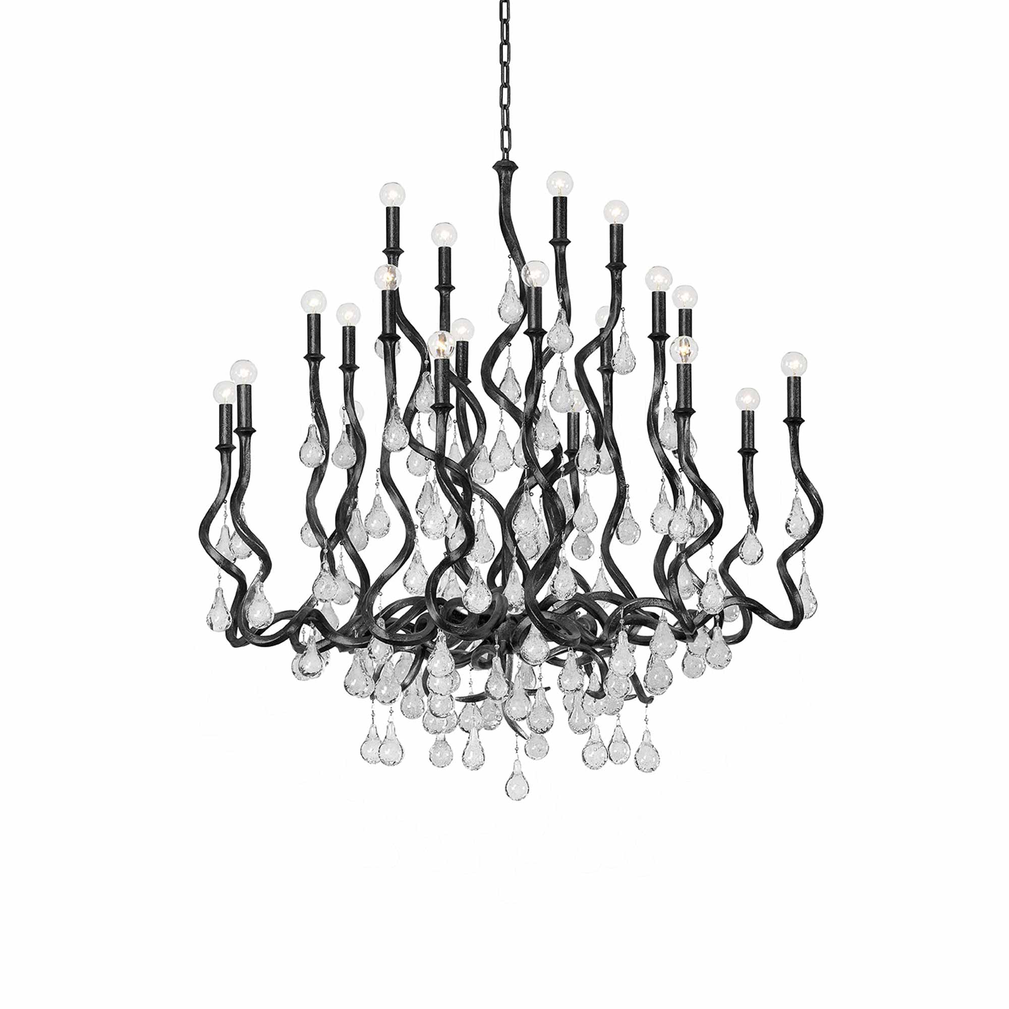 A hearty embrace of chaotic design personality creates a striking quality for adding artistry to custom spaces. Consider the Aveline Chandelier from Corbett Lighting and its twisting rods adding a surprising aesthetic contrast to candelabra style bulb bases. Dangling crystal pieces shore up a glam influence in a fixture that sets itself apart in a modern setting.