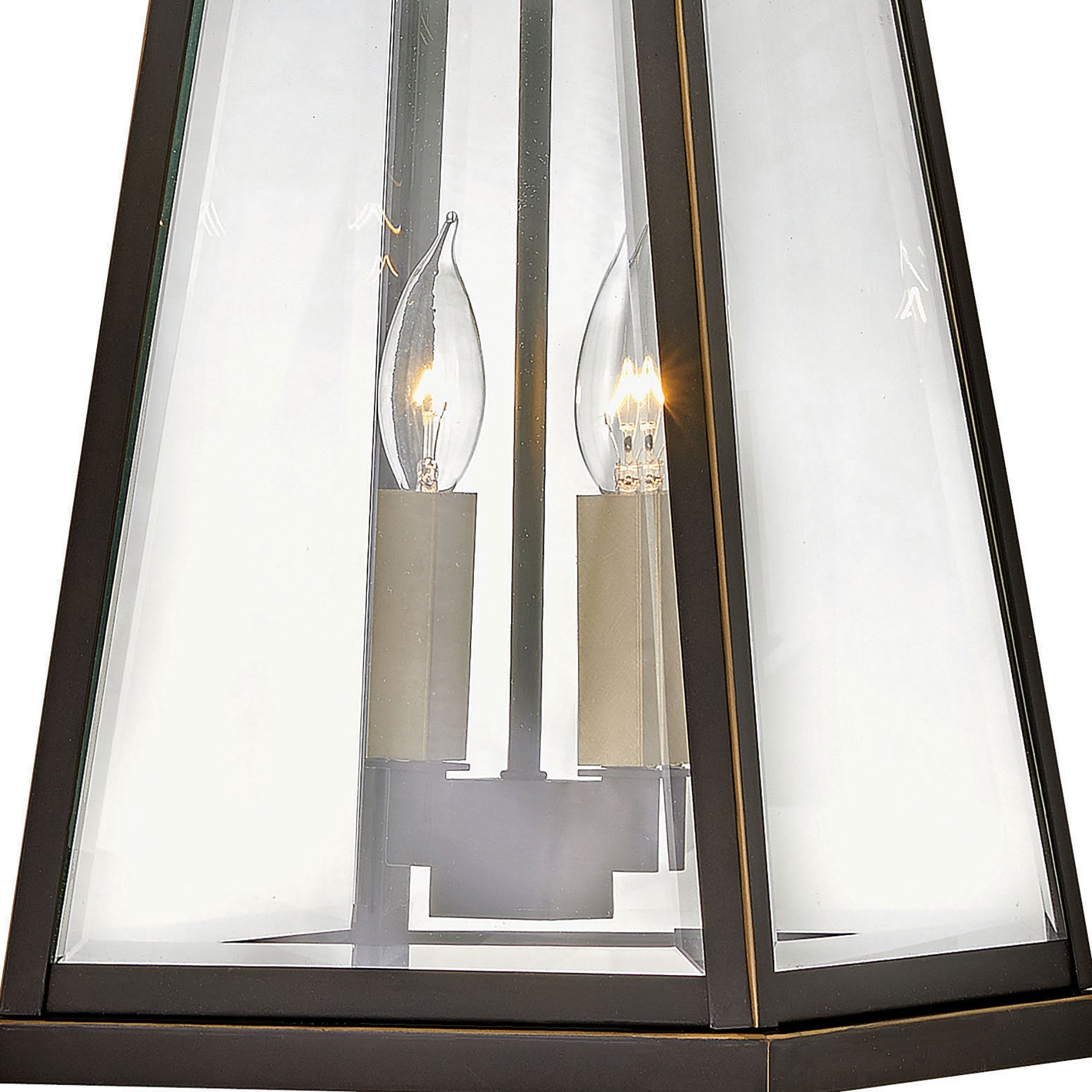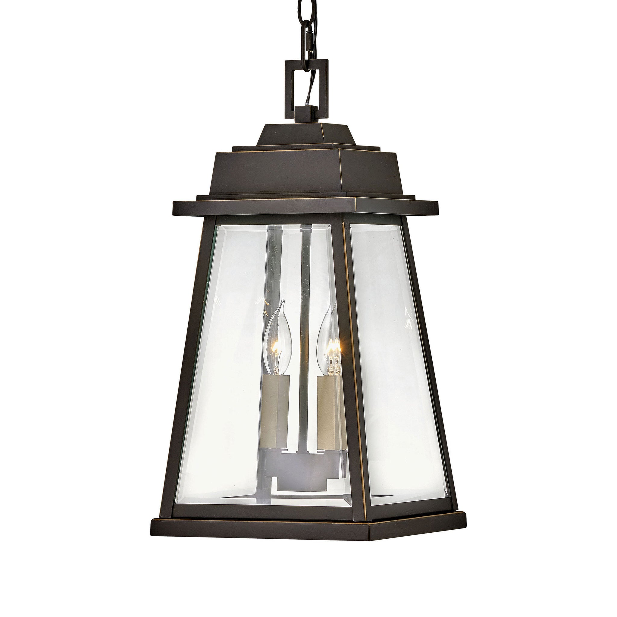 Bainbridge Outdoor Pendant Light seamlessly blends sophisticated traditional details with crisp modern elements. The sleek architectural lines amplify a robust, durable Oil Rubbed Bronze finish, which is complemented by an accent finish of Heritage Brass for a refined, polished presence. The generously scaled four sided beveled glass panels allow maximum illumination and enhance this versatile yet timeless look.