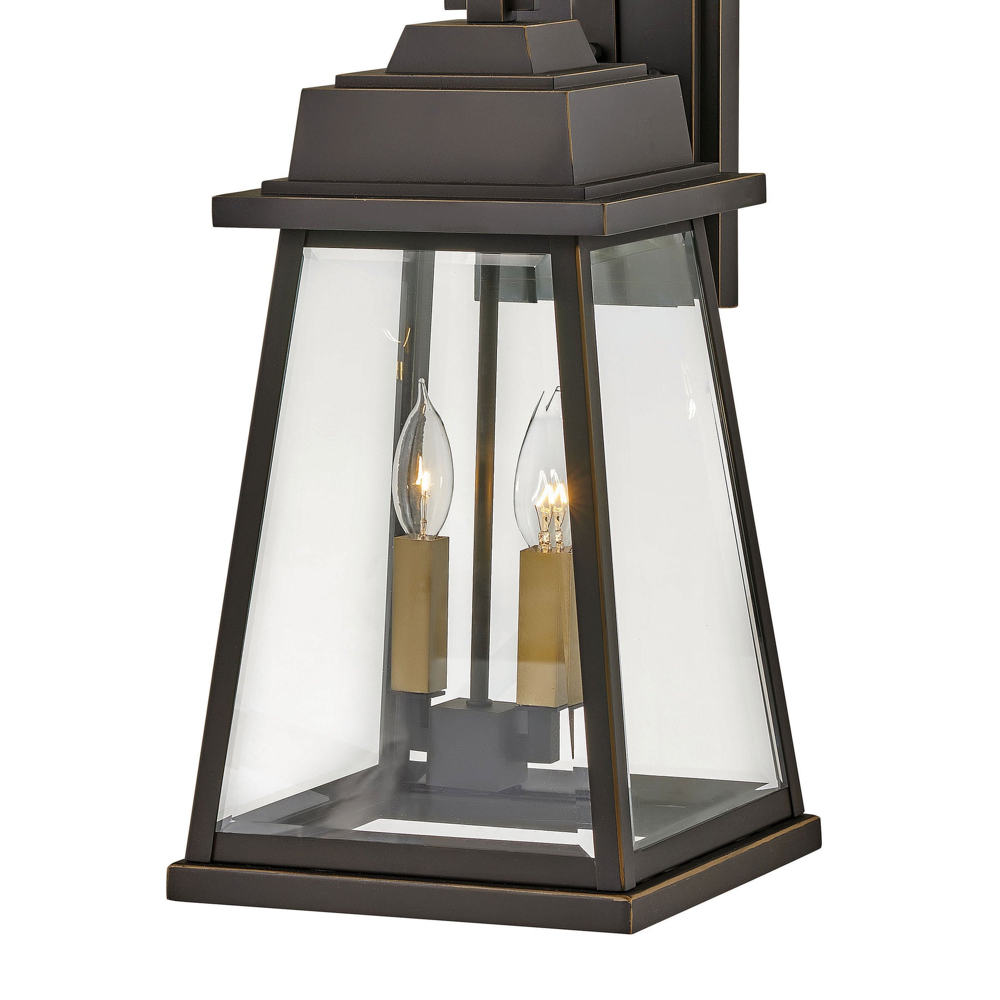 Bainbridge Outdoor Wall Light seamlessly blends sophisticated traditional details with crisp modern elements. The sleek architectural lines amplify a robust, durable Oil Rubbed Bronze finish, which is complemented by an accent finish of Heritage Brass for a refined, polished presence. The generously scaled four sided beveled glass panels allow maximum illumination and enhance this versatile yet timeless look.