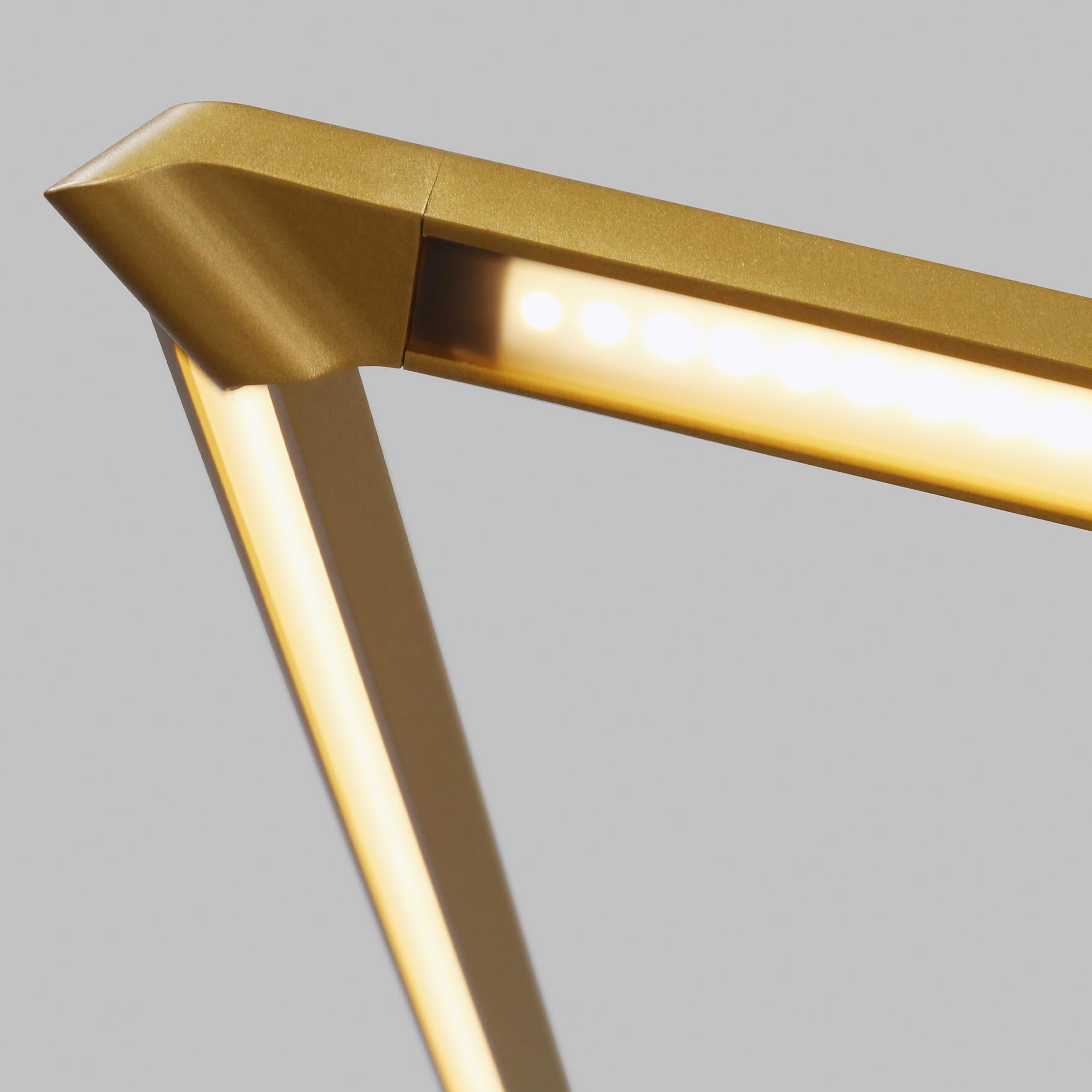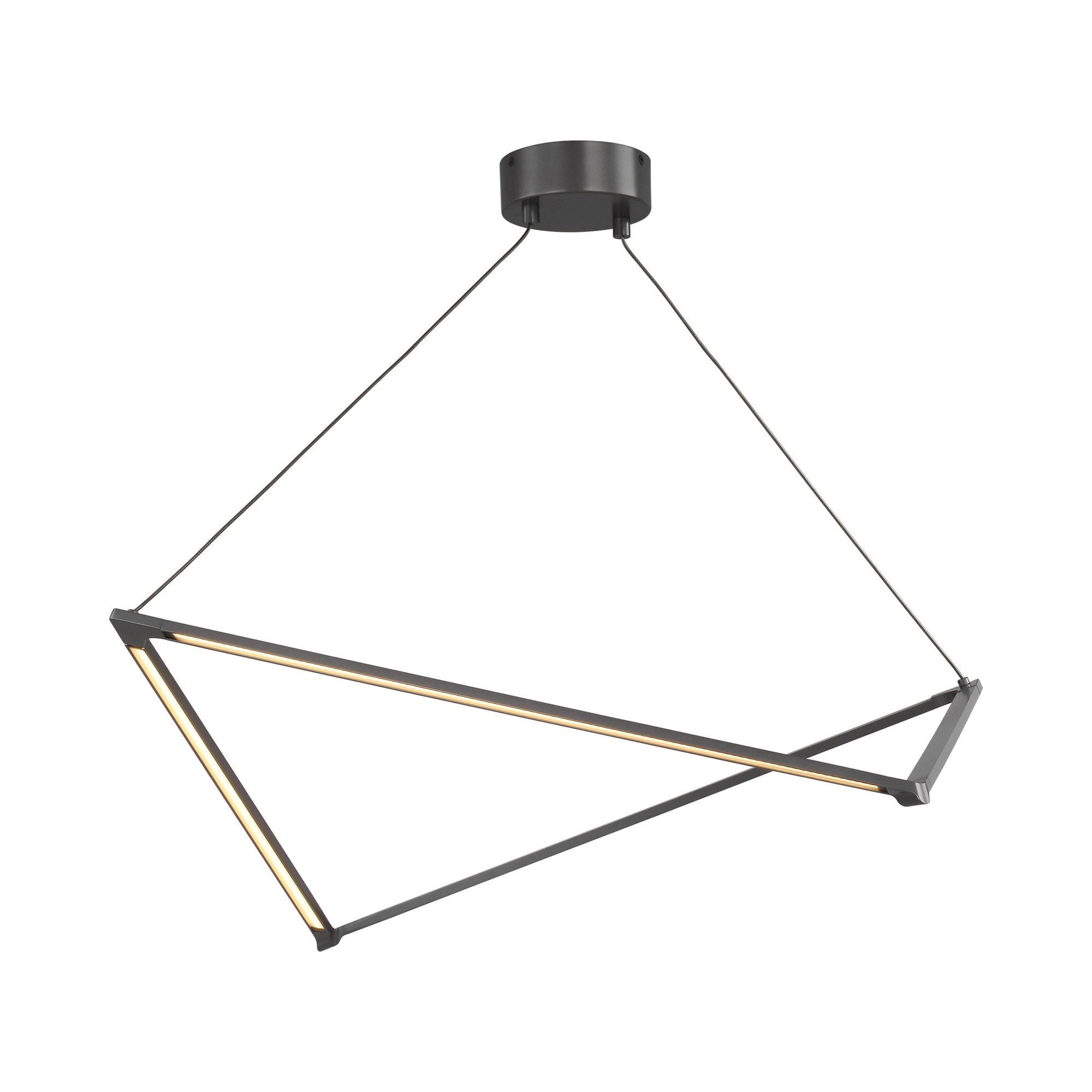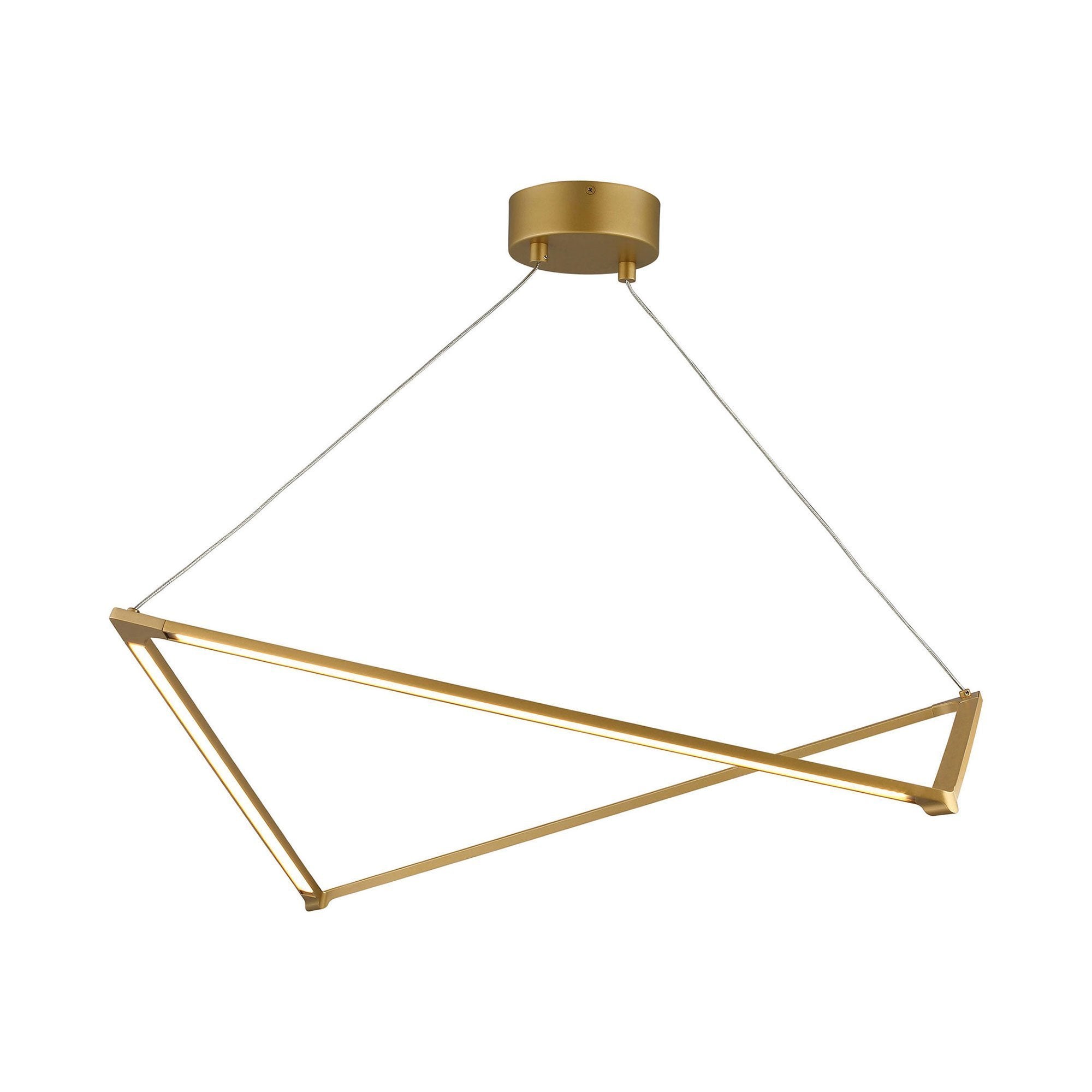 Balto LED Linear Suspension Light by Visual Comfort Modern exudes light from all angels through its interweaving lines. Sleek lines are suspended by distinctive cables forming a triangular shape producing a contemporary geometric silhouette. The fully dimmable integrated LED emits a high lumen output at 3000K while an acrylic lenses diffuser provides softly diffused light onto surfaces below for a glare-free lighting experience. Balto LED Linear Suspension Light is available in two on-trend finish options, Satin Gold and Gun Metal, both colors further enhance its contemporary style. Scaling at 33.9” in length and 35.86” in width the Balto is ideal for dining room lighting, foyer lighting and conference room lighting.