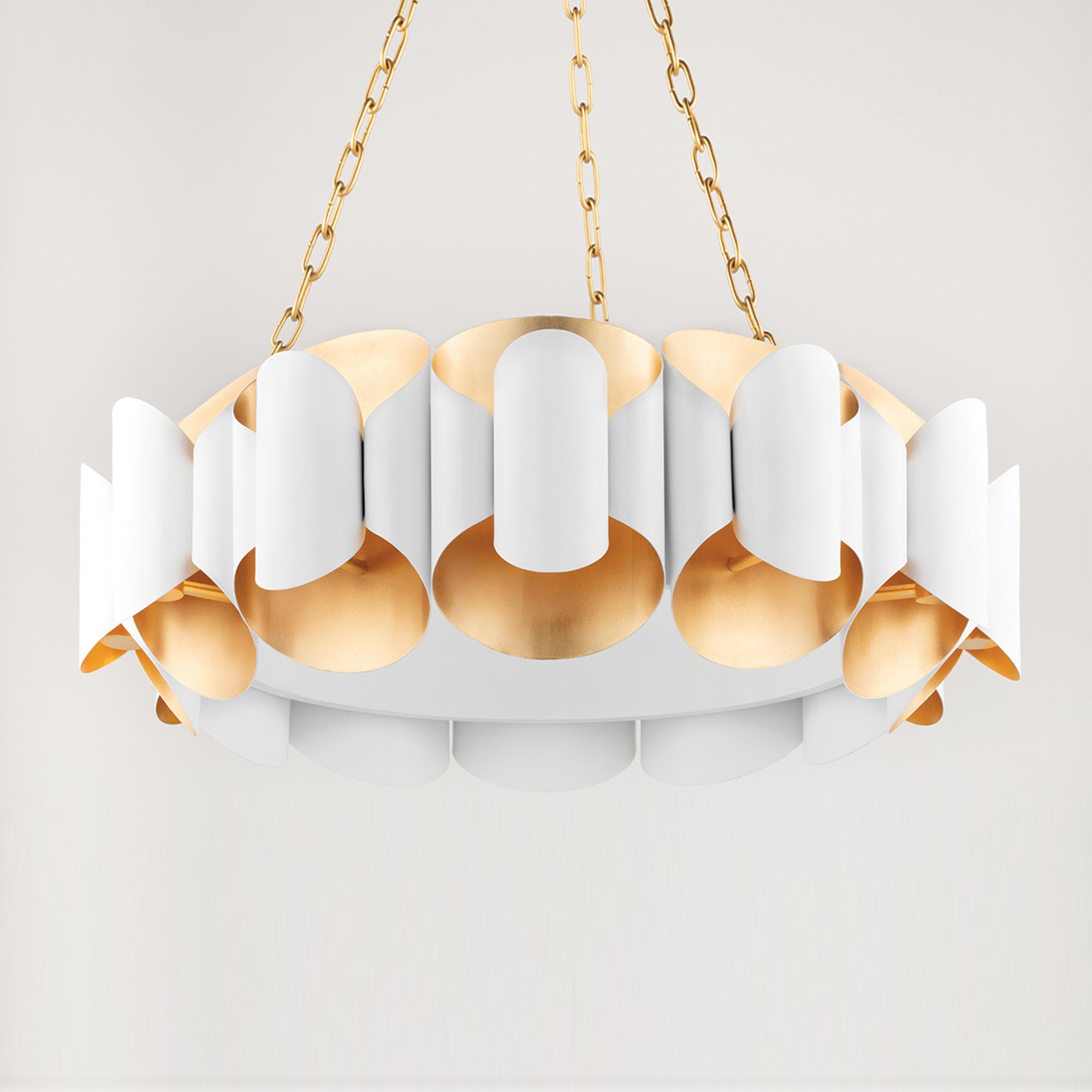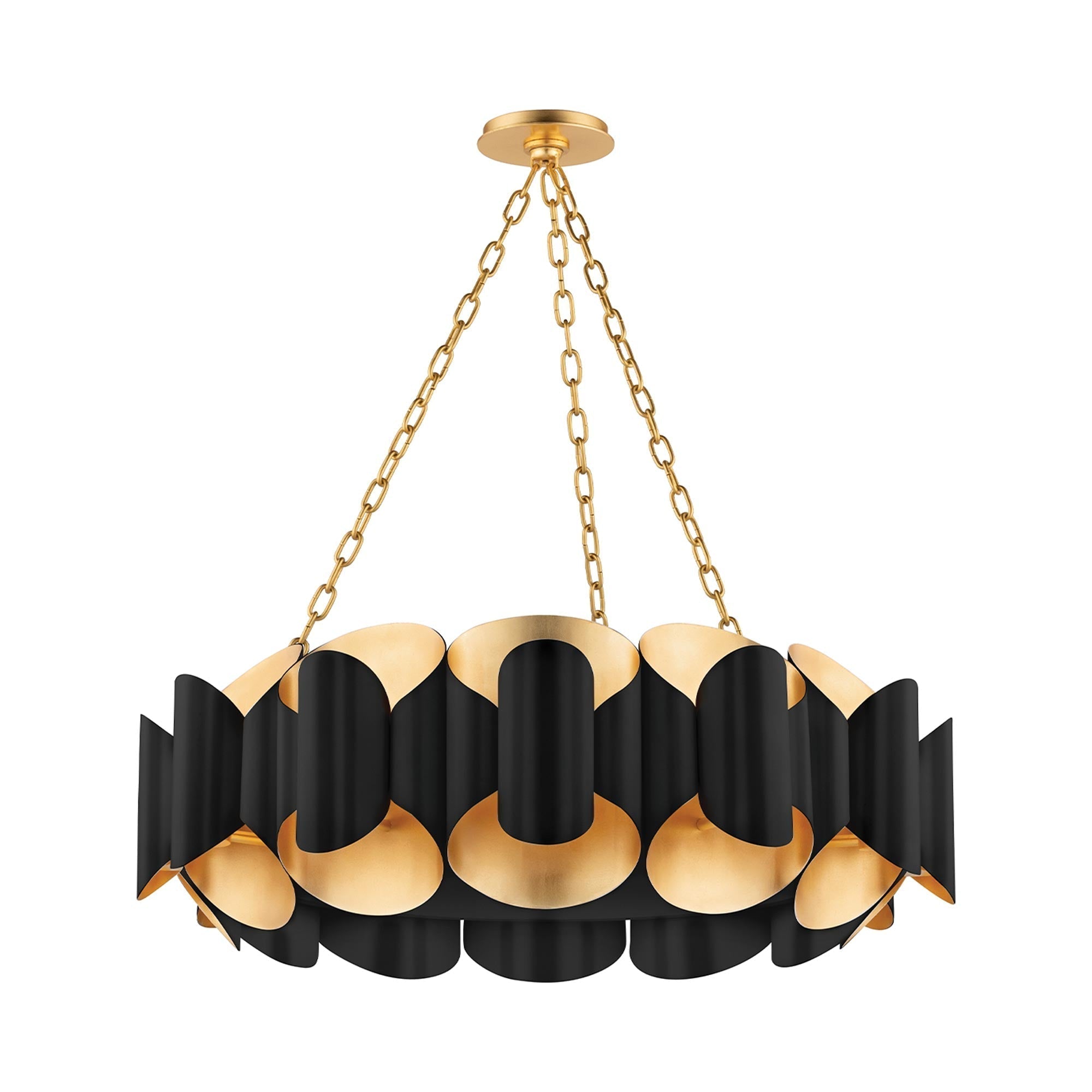 Multidimensional shapes and luxe elements collide in the atomic age-inspired Mid Century modern Banks Chandelier from Hudson Valley Lighting. Designed with interwoven centrifugal shapes and folds, the Banks chandelier makes a breathtaking and whimsical addition hung over a spacious dining table or within an entry foyer. Metallic accents illuminate the space further, creating a soothing dramatic glow.