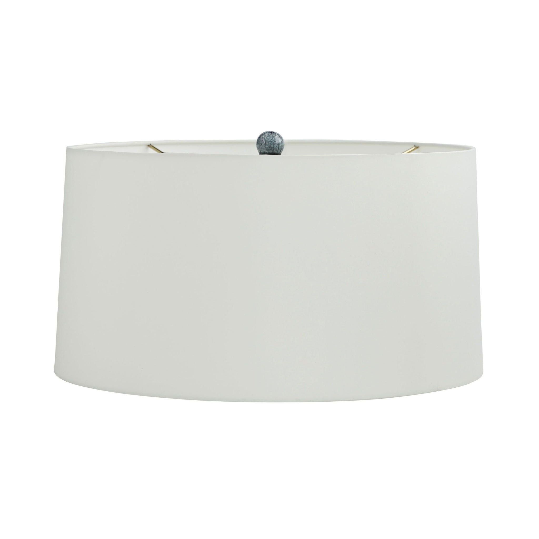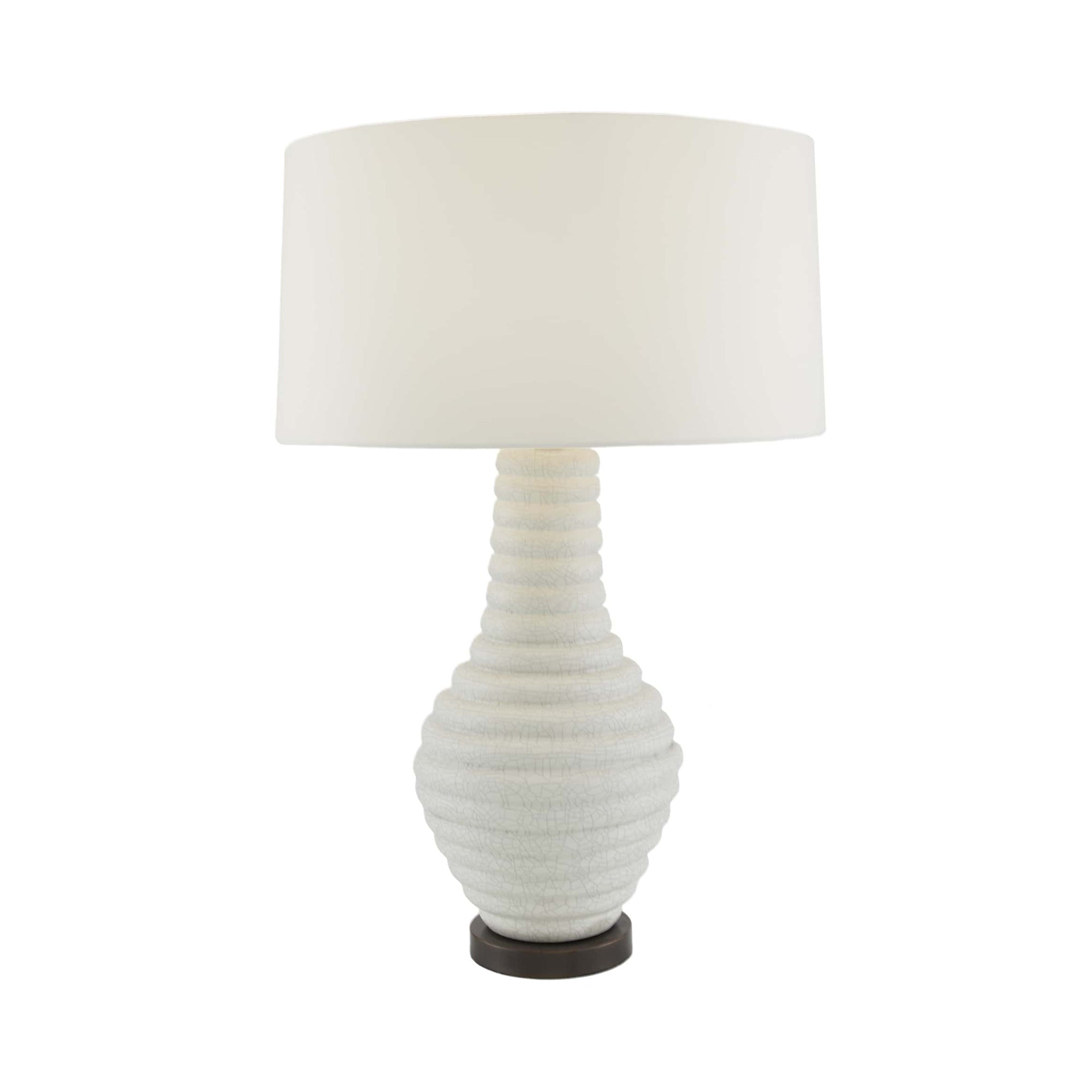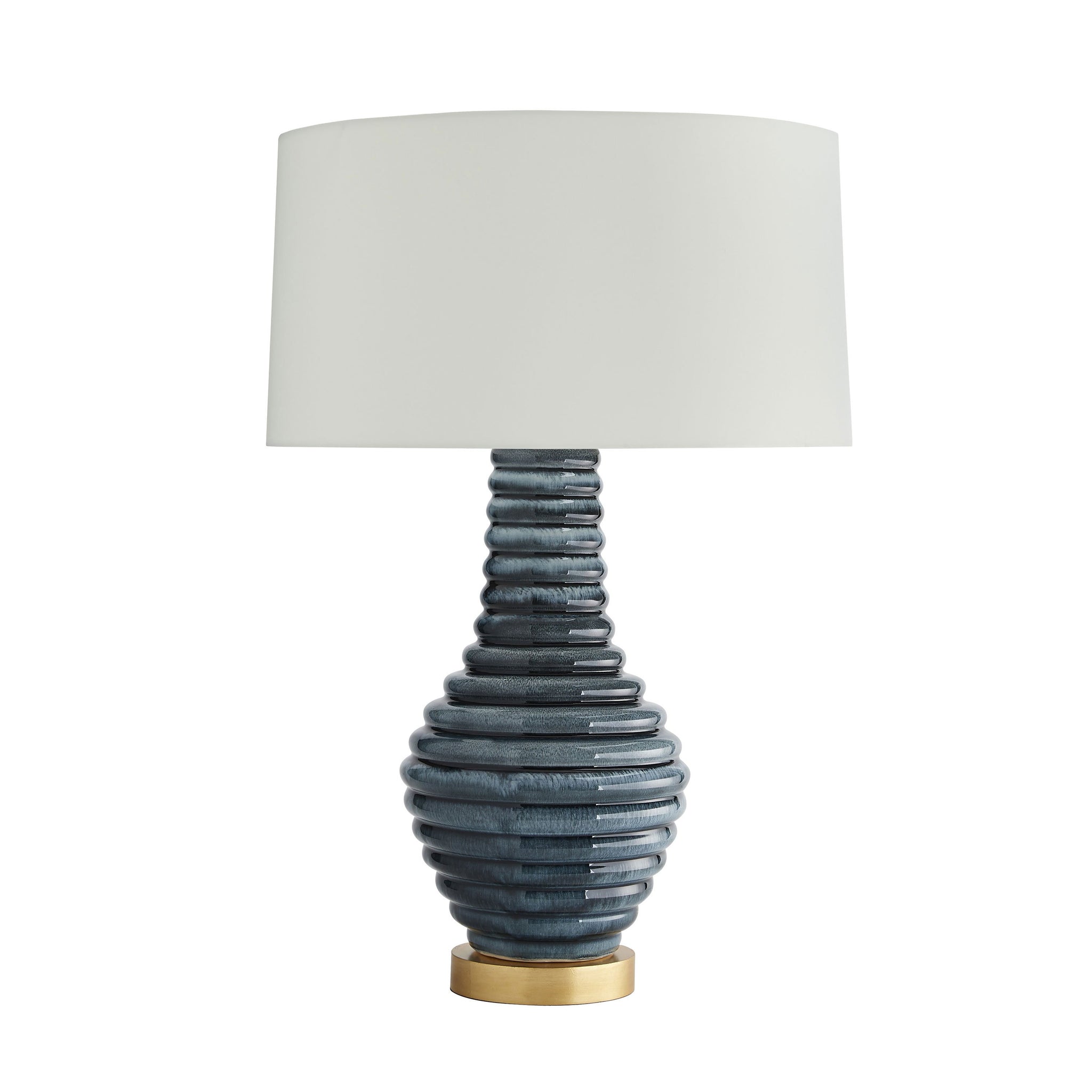 The Bartoli creates a brilliantly illuminated mise-en-scène in any space it occupies. Large ridges staircase—almost barrel—the traditional silhouette. An Amalfi reactive glaze finish pulls on the highs and lows of its textured façade creating an almost two-tone effect. Stylishly showcased on a circular wooden base finished in gold leaf for a more elevated look. Topped with an ivory microfiber drum shade with off-white cotton lining and a matching porcelain finial. Finish may vary.