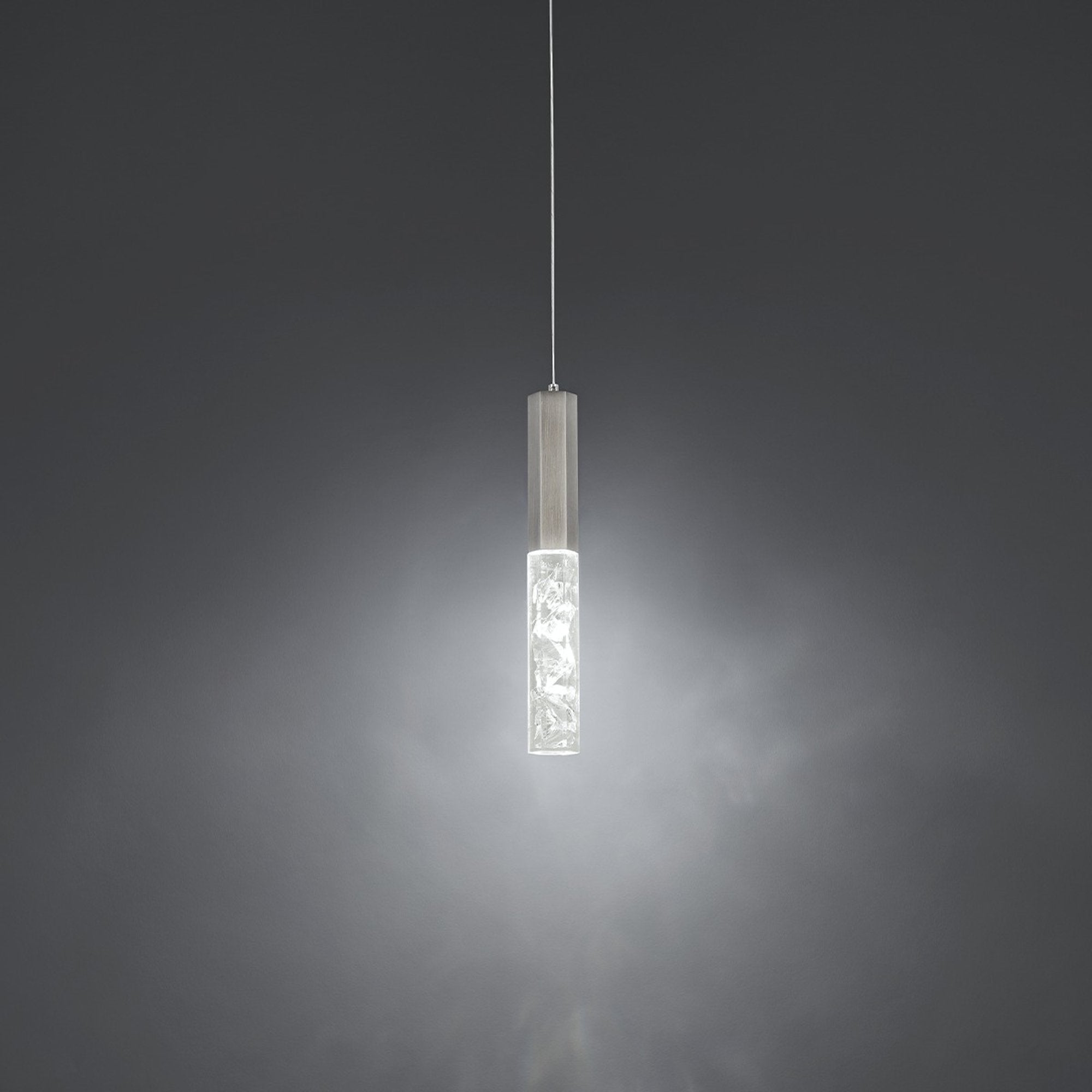 Reminiscent of great coastal rock formations, this elegant pendant captivates with reclaimed crystal shards frozen and illuminated to sparkle. This sleek mini pendant carries its weight with a luxurious upscale appeal. Align in groups above islands, tables and counters as a design alternative over traditional hanging elements. A statement making luxury created with a minimalist vocabulary.