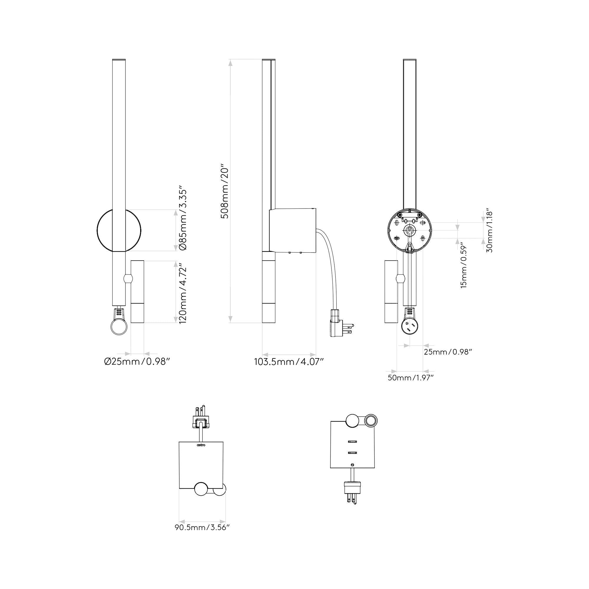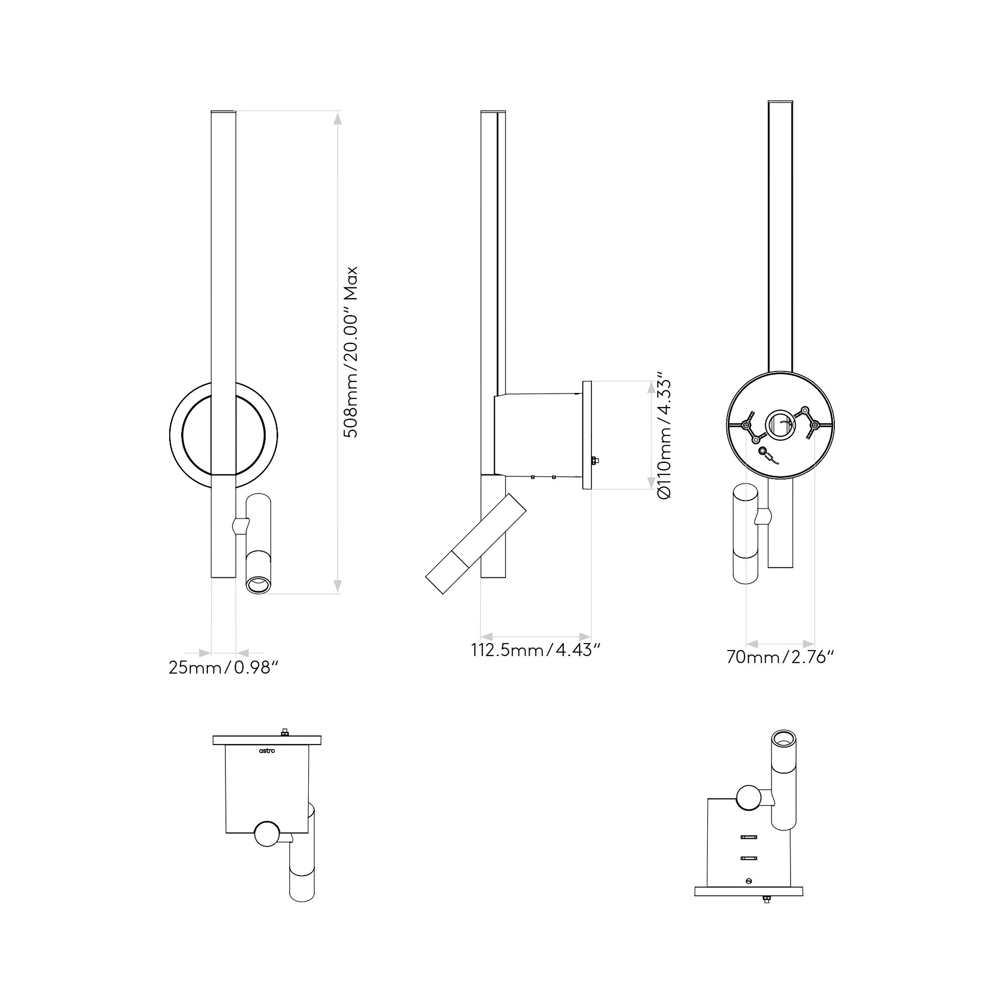 - Wire In: 3.56"W X 20"H; 4.43" Extension