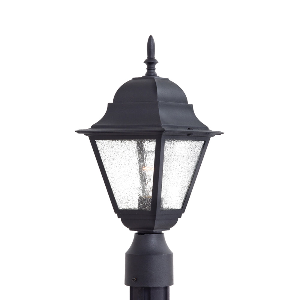 A village motif brings tasteful style to exterior lighting with the Bay Hill Outdoor Post Light from The Great Outdoors. Illuminate a custom exterior area with a metal light constructed of bold black finish metal. A lantern-inspired silhouette offers no shortage of intricate details and clear seeded glass panels to introduce an authentic seasonal element.