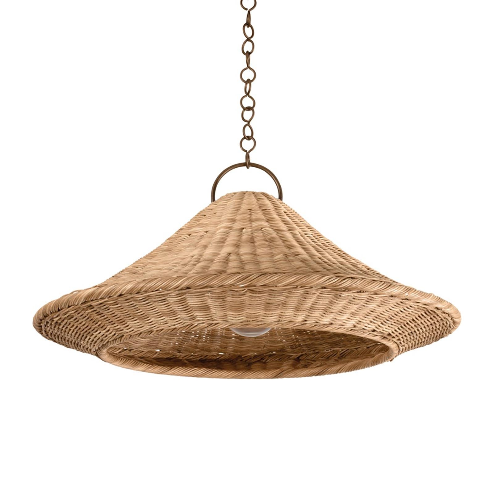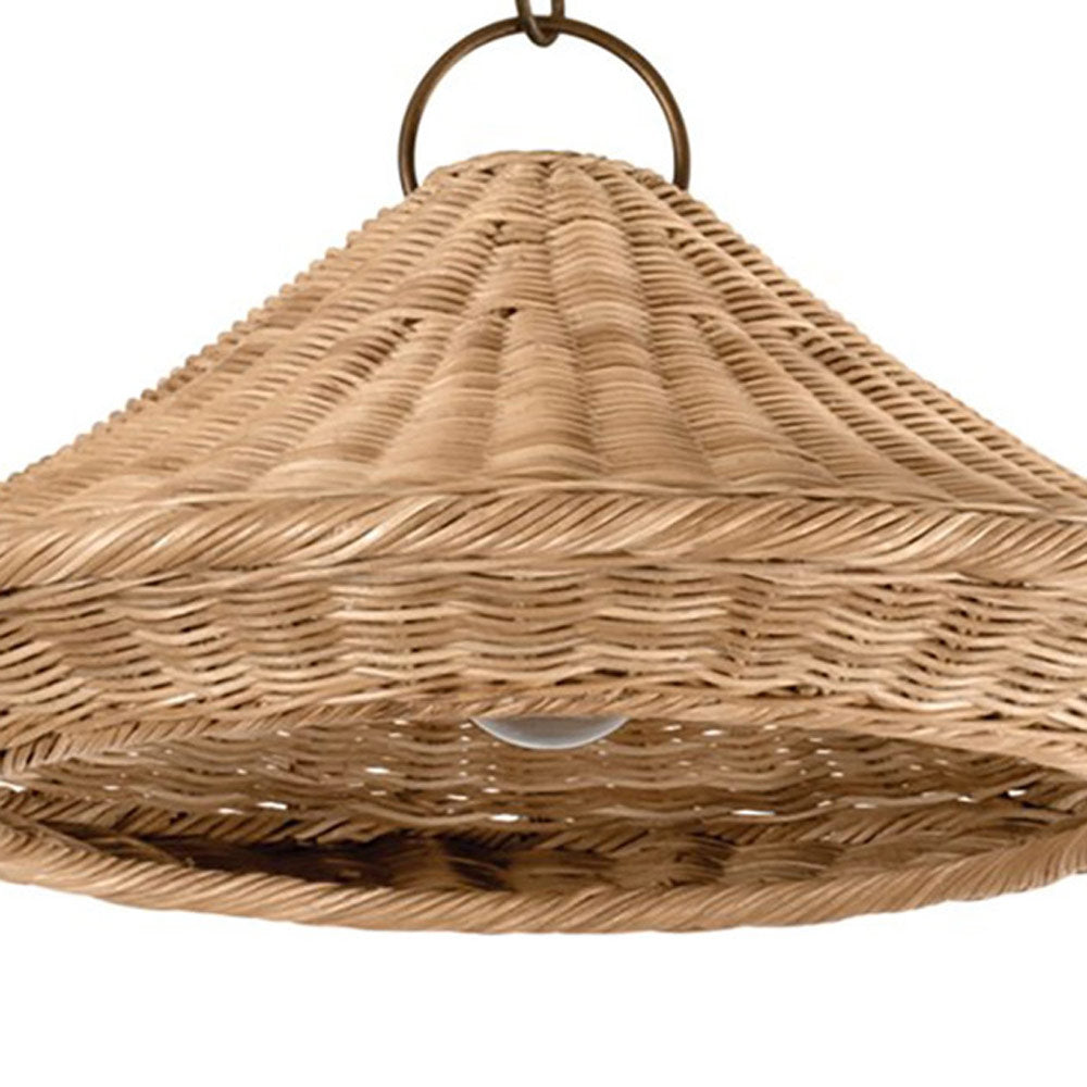 Experience coastal style with a charming design form as the Baychester Pendant Light from Hudson Valley Lighting refines an exotic casual motif. Shapely with a conical rattan shade, this pendant is enhanced with a randomly lined loop and chain suspension design featuring bronze leaf finish metal. Down lighting is radiant and effective, illuminating a dining ensemble, living space, or foyer.