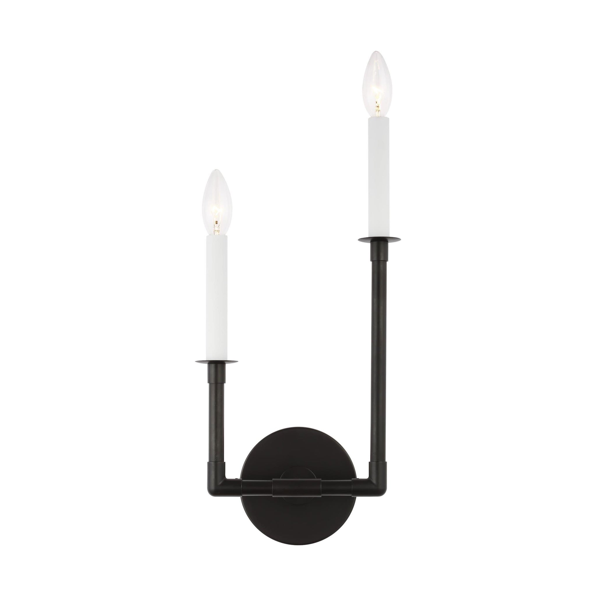 Varied heights for the two candles in the Bayview Double Bath Wall Light from Visual Comfort Studio deliver bold, modern energy to any decor.