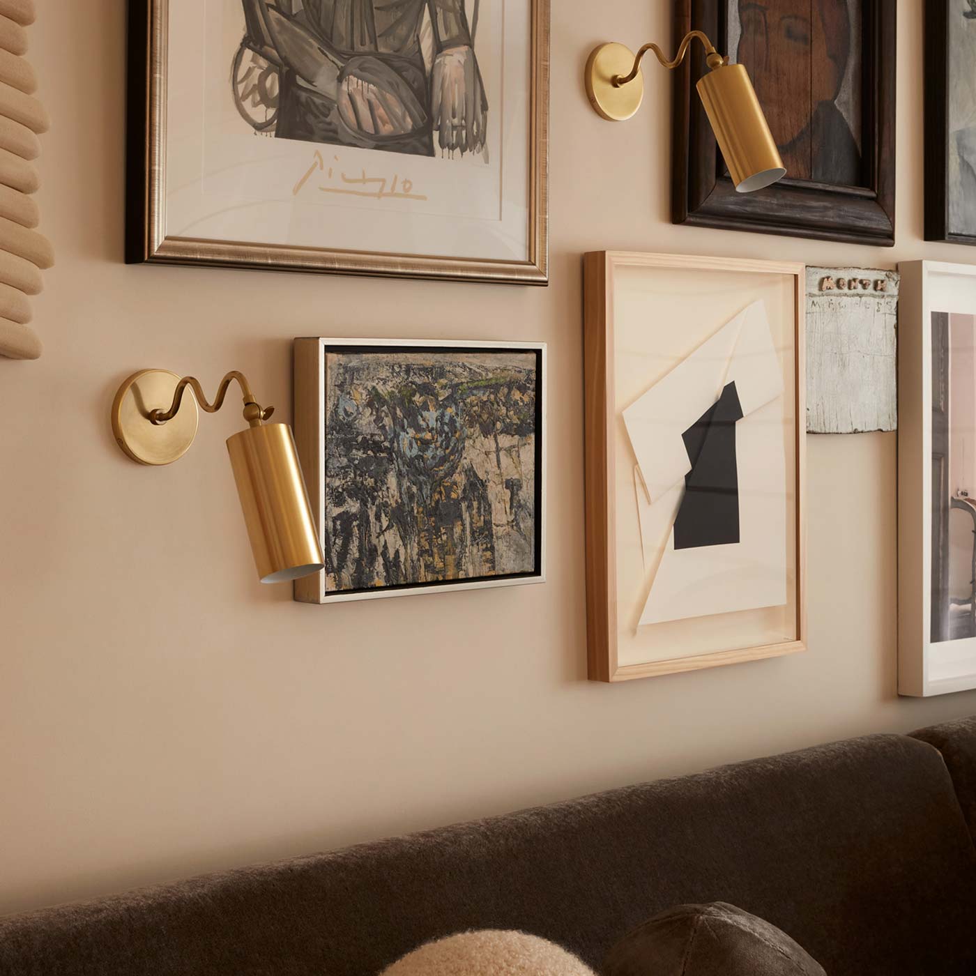 Aged brass finish offers a glam touch to the whimsical nature of the sleek modern Bea Wall Light from Mitzi. Capped with a multi-directional cylindrical shade, a squiggly arm reaches out, offering movement and illumination to a space. Showcase artwork, sculptures and more along console tables, library shelving and so much more.