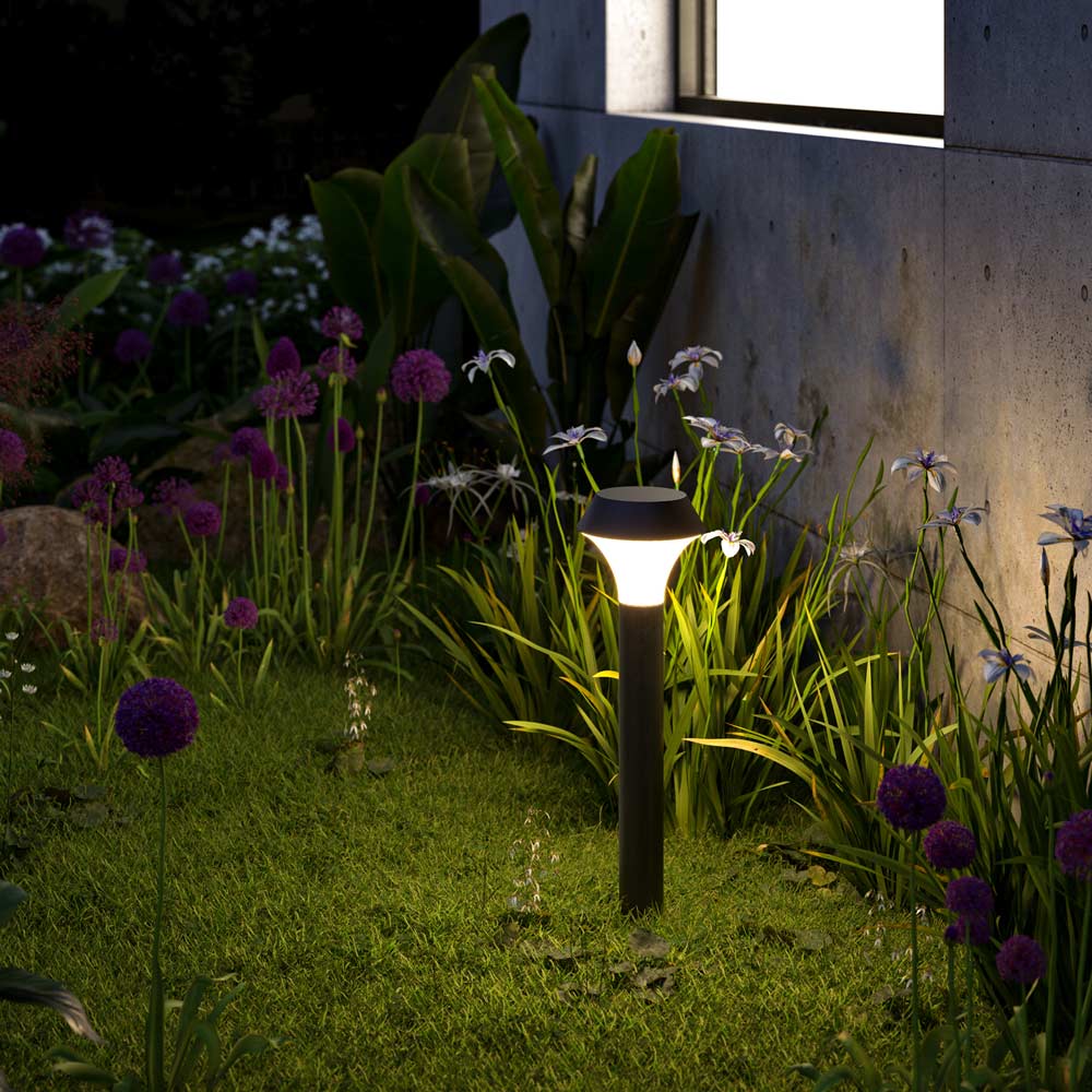 Minimalist style makes a big impact and the Beacon LED Path Light from DALS is a perfect example. Its sleek, streamlined silhouette includes a ground spike for easy installation in garden beds, along pathways, and beyond, delivering and inviting glow that creates lovely ambiance within your landscaping. A black powder coated finish completes the look of this energy efficient fixture.