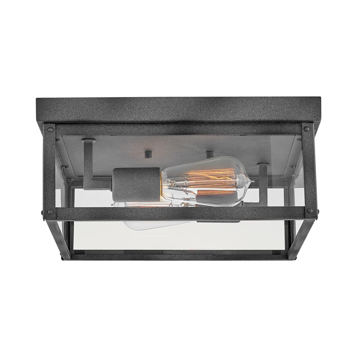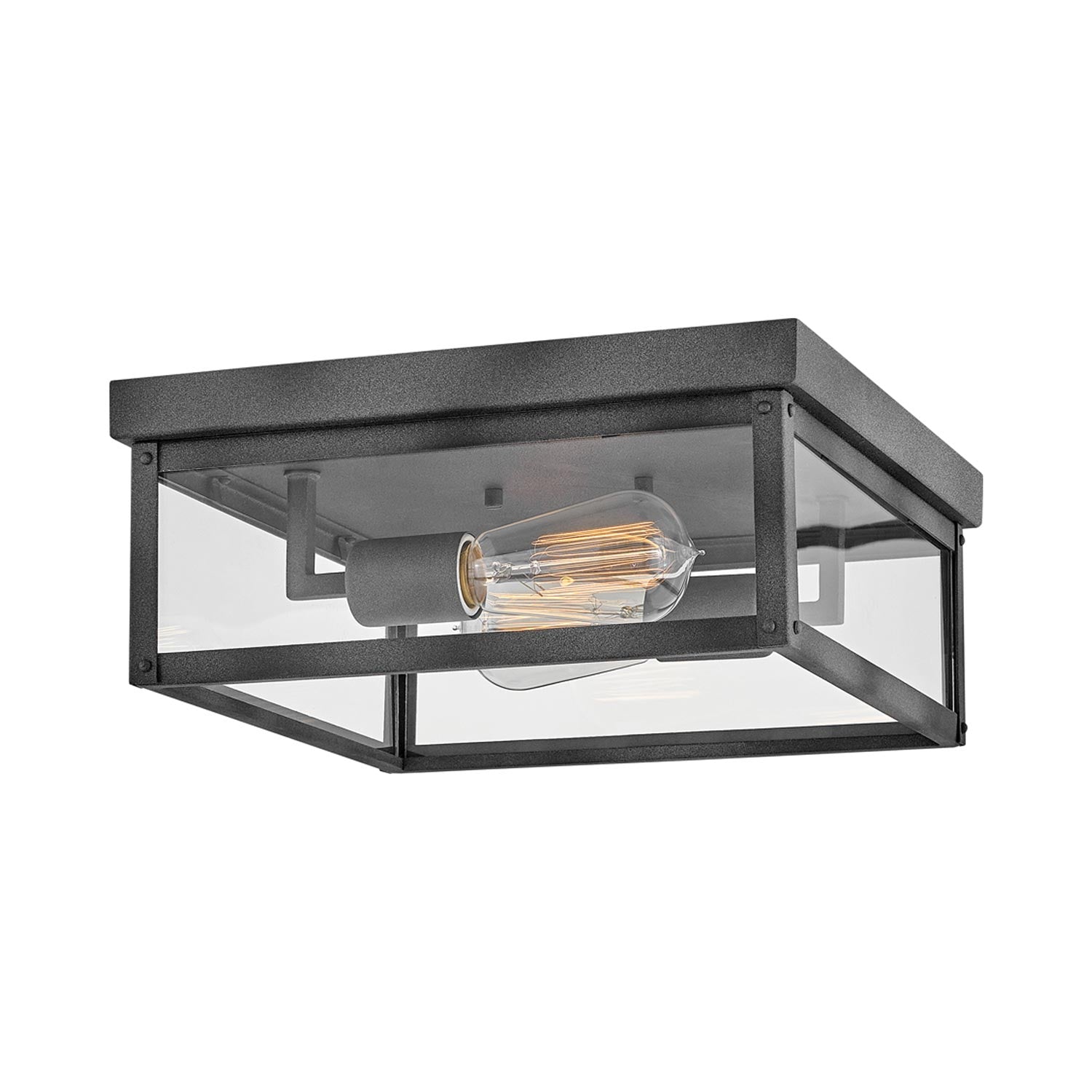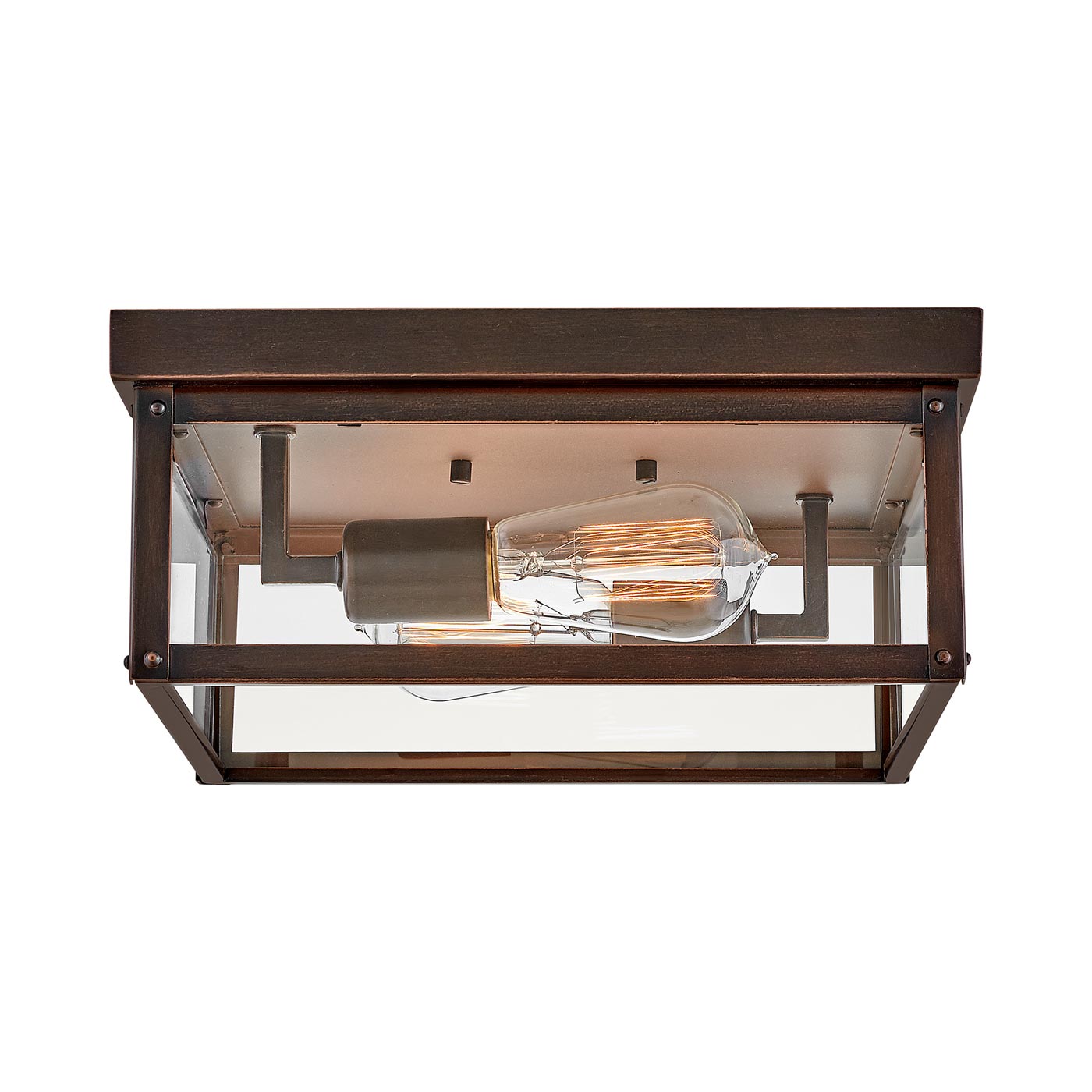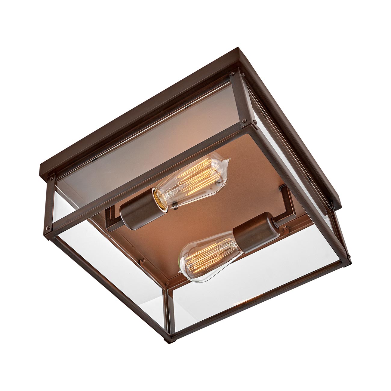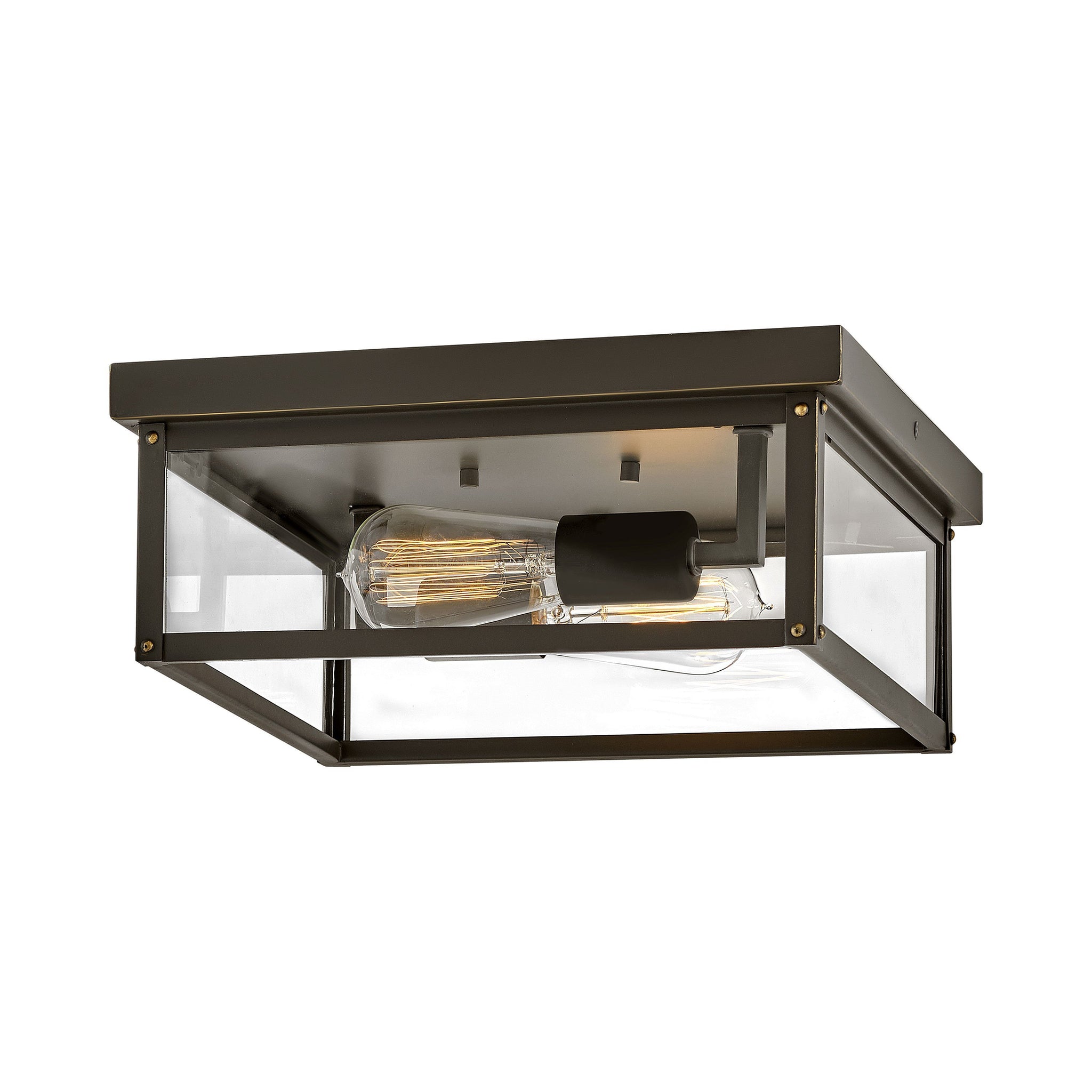 The clean and classic Beckham Outdoor Flush Mount Ceiling Light is the ultimate flush mount for a variety of outdoor applications. The two-light ceiling mount features sharp lines with a square canopy, suitable for indoor and outdoor locations. Its clear glass panels and open bottom emit a beautiful and even flow throughout any space. Beckham Outdoor Flush Mount Ceiling Light is available in a Black or Oil Rubbed Bronze finish. Vintage style filament bulbs recommended.