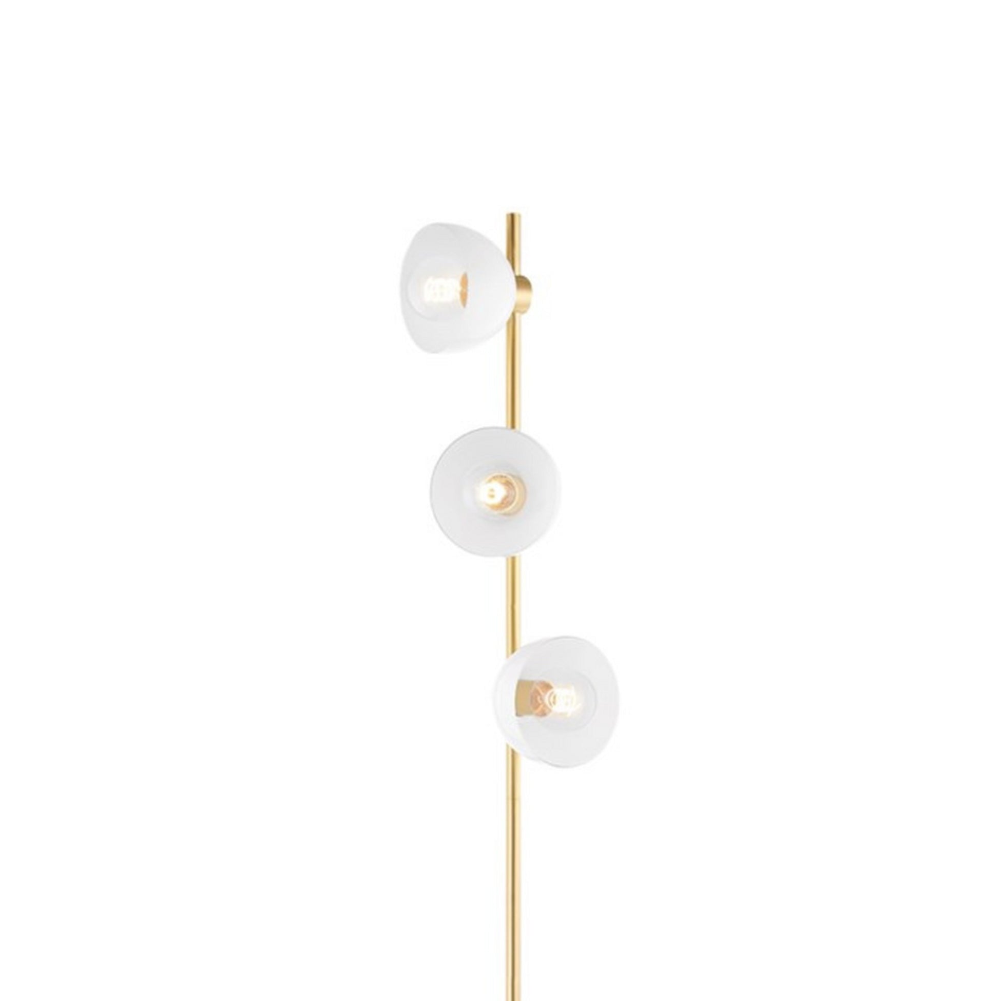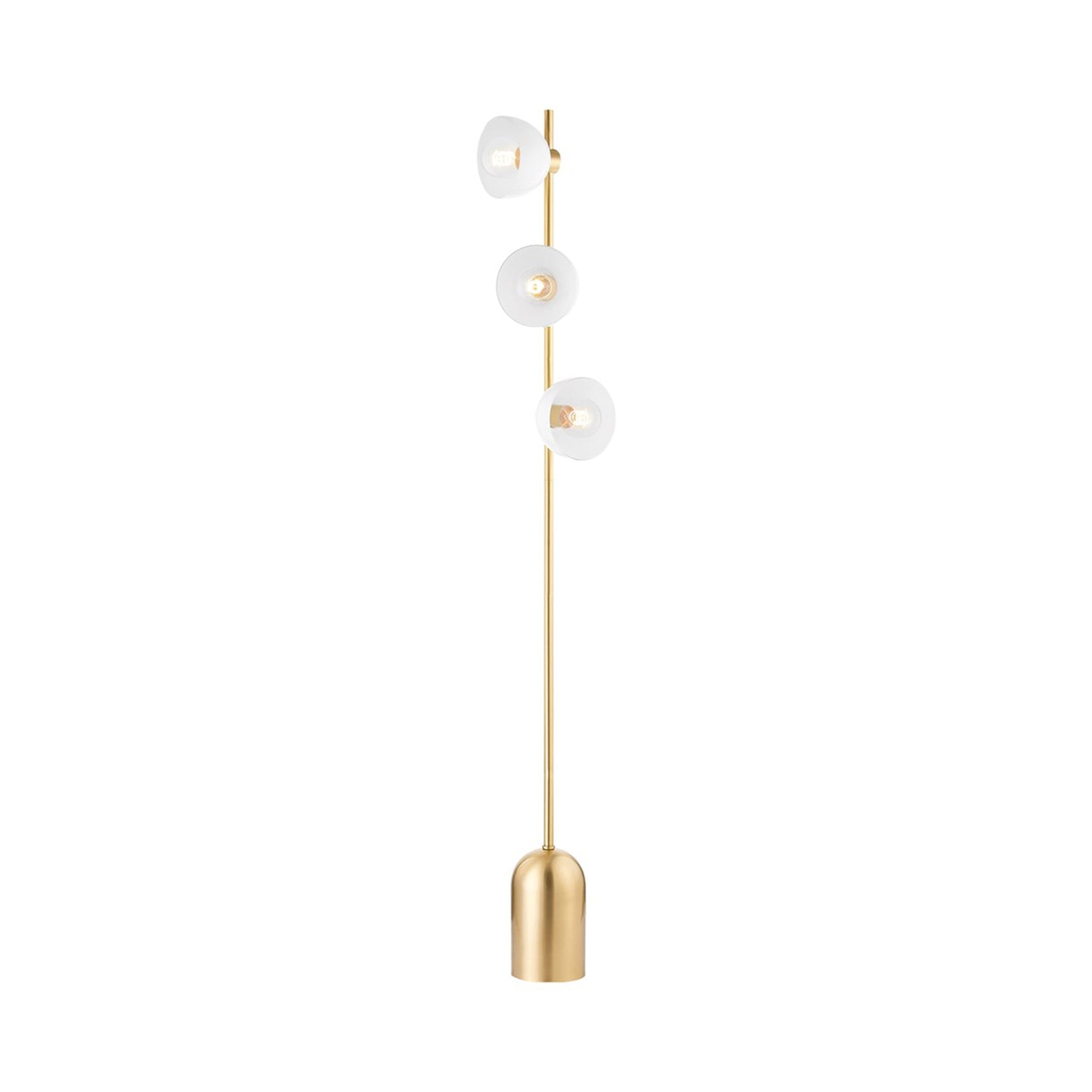 Repurpose a classic version of the torchiere silhouette with a fresh, modernized look in lighting. Sparing overbearing detail, the Belle Floor Lamp from Mitzi strikes a balance between casual and elegant as it provides suitable lighting for a living room or bedroom. Embrace gleaming aged brass finish metal framing that hosts a trio of glossy white shades with exposed bulbs, toeing the line between contemporary and Art Deco.
