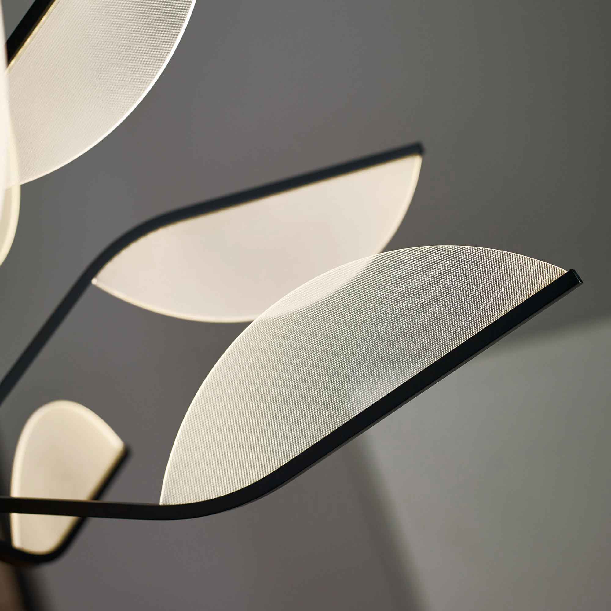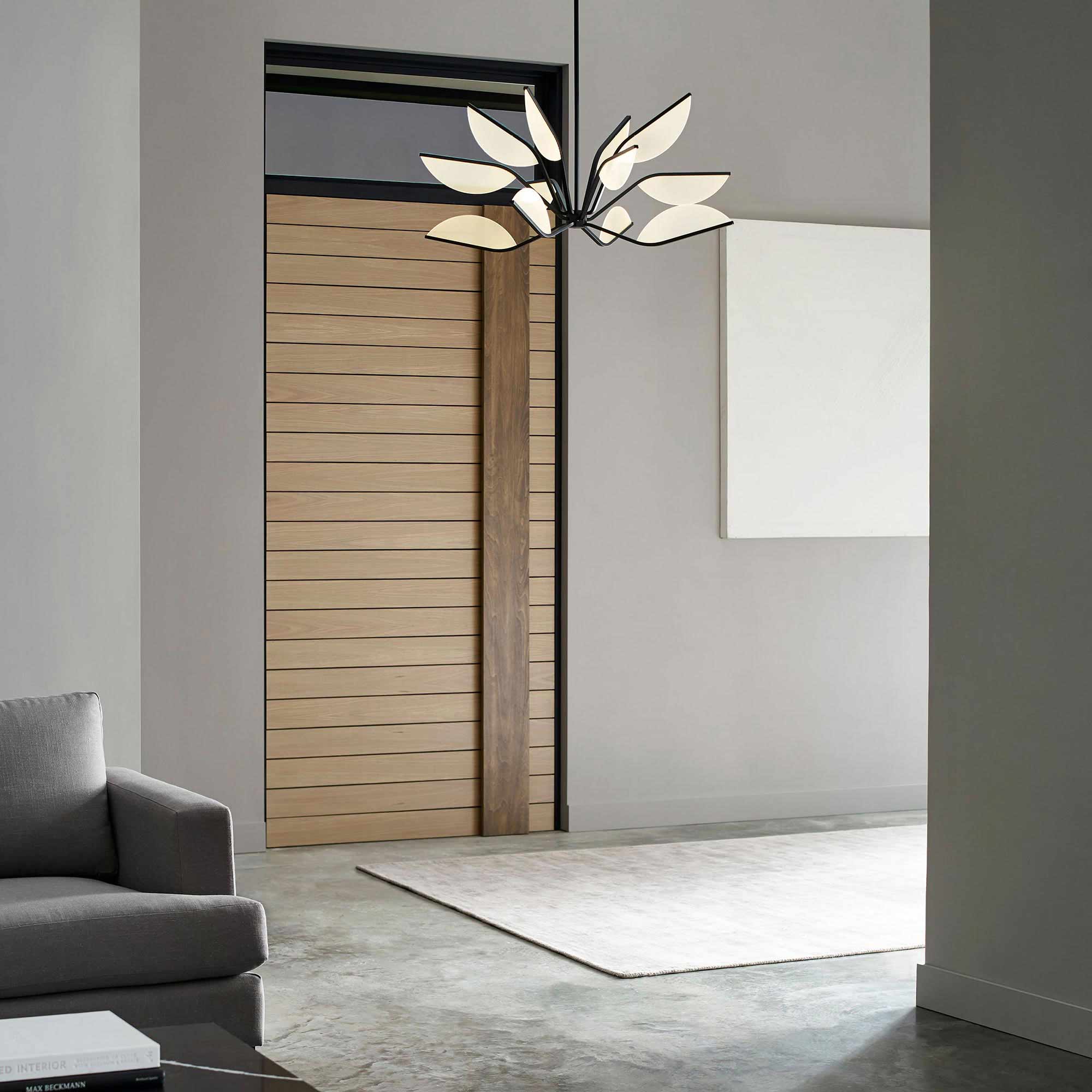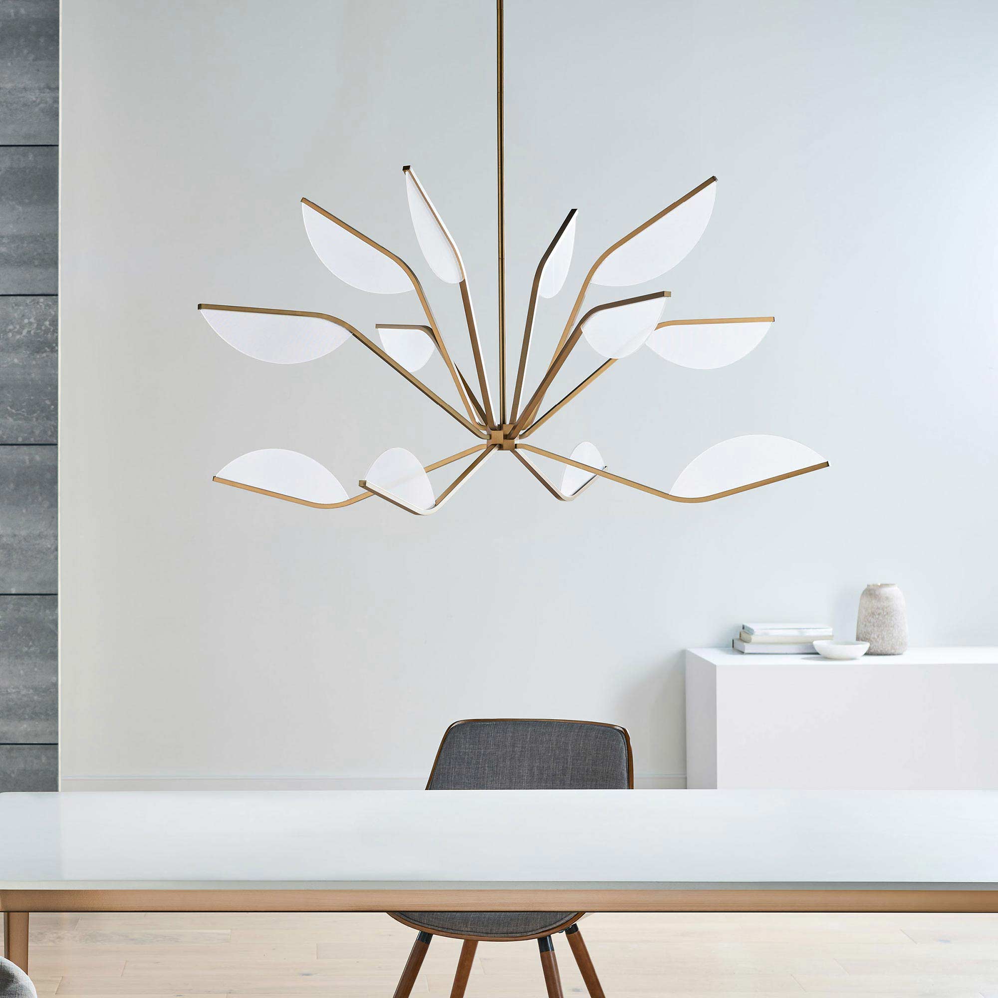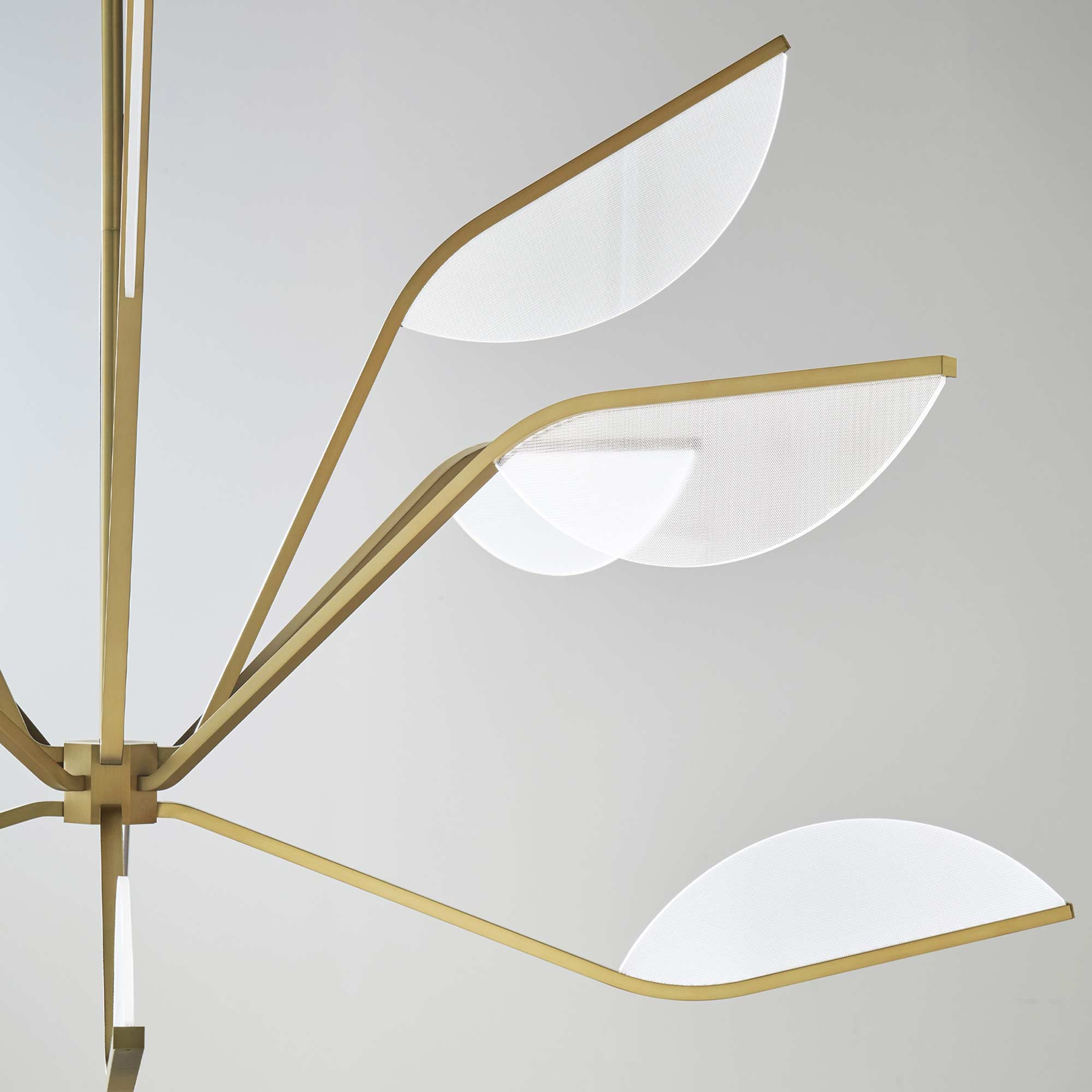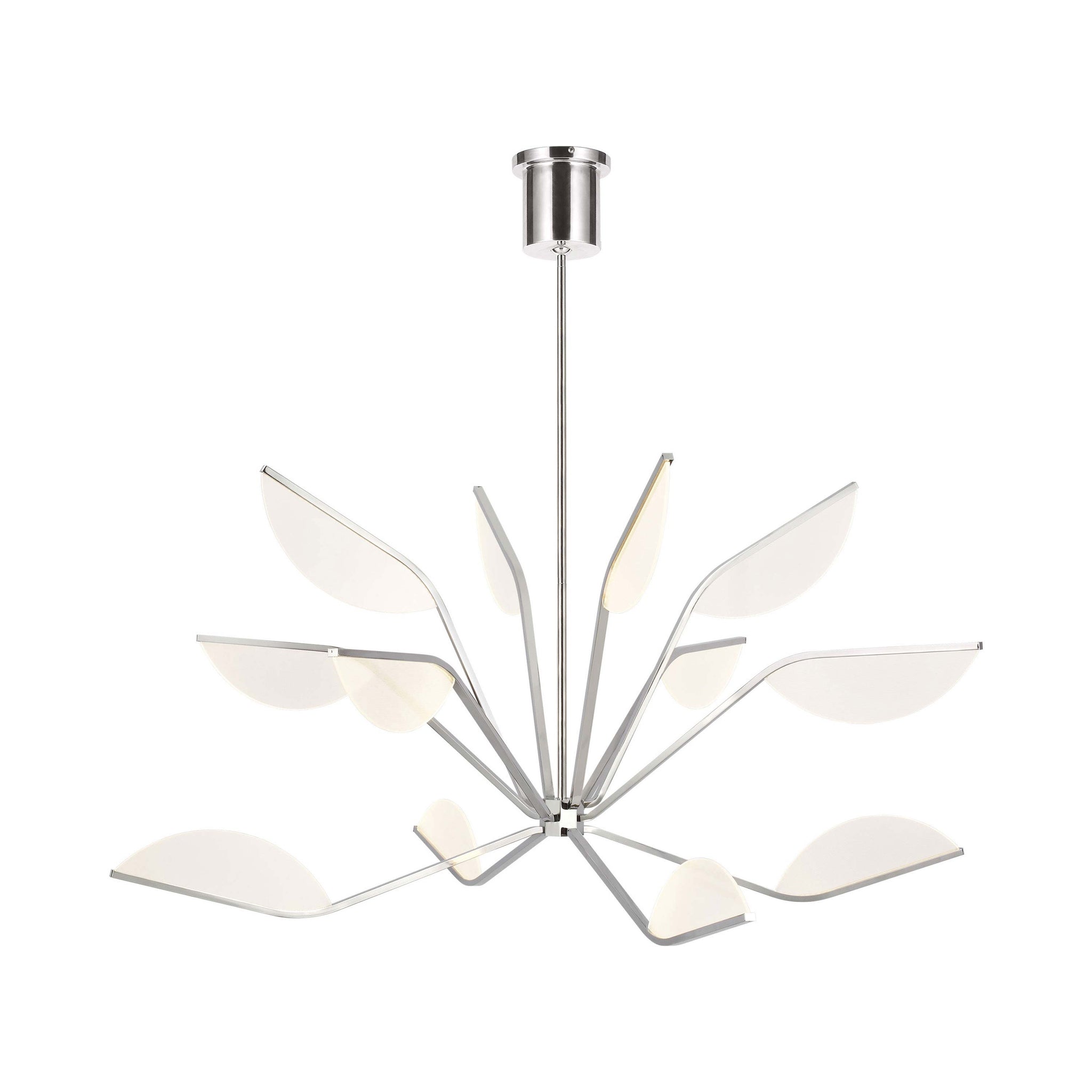 The Belterra LED Chandelier by Sean Lavin for Visual Comfort Modern is inspired by the lotus flower. Petal-shaped LED light guides beautifully illuminate this contemporary design and capture the purity of the chandelier's graceful stem-work. Designed with a minimal frame and offered in three elegant finishes, Belterra provides a touch of contrast when turned on and off. The Belterra Family includes alternate fixture sizes to illuminate the space as a stand-alone piece or installed in multiples. Lamping options are compatible with most dimmers. Refer to the Dimming Chart for more information.