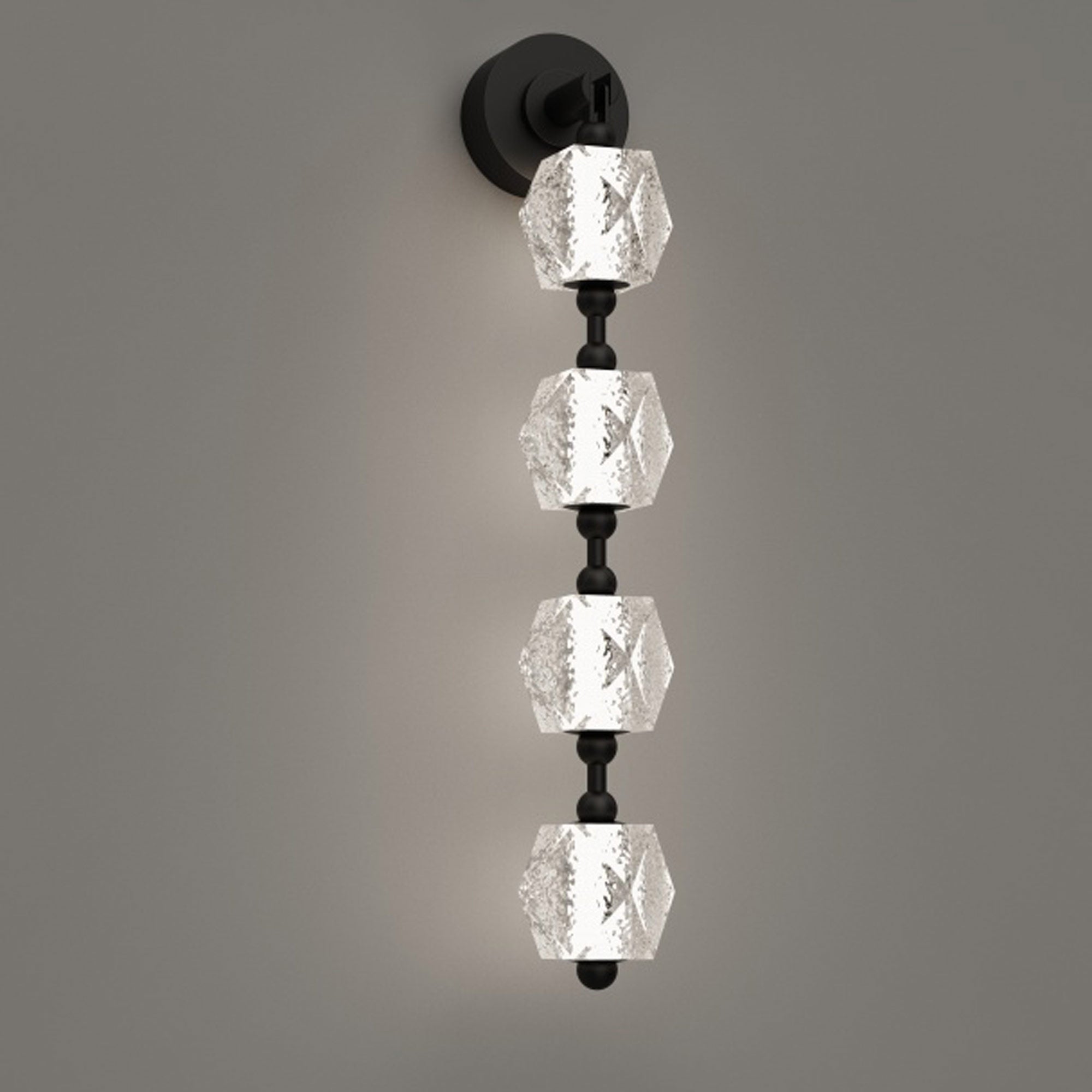 The intriguing flavor of silhouetting and organic gem-like materials brings an air of sophistication to the Beluga LED Wall Light from Avenue Lighting. Faceted glass elements filter light beautifully as they dangle from intricately turned black finish metal. A project in dramatic artistry, this wall light encourages coordinating decor elements.