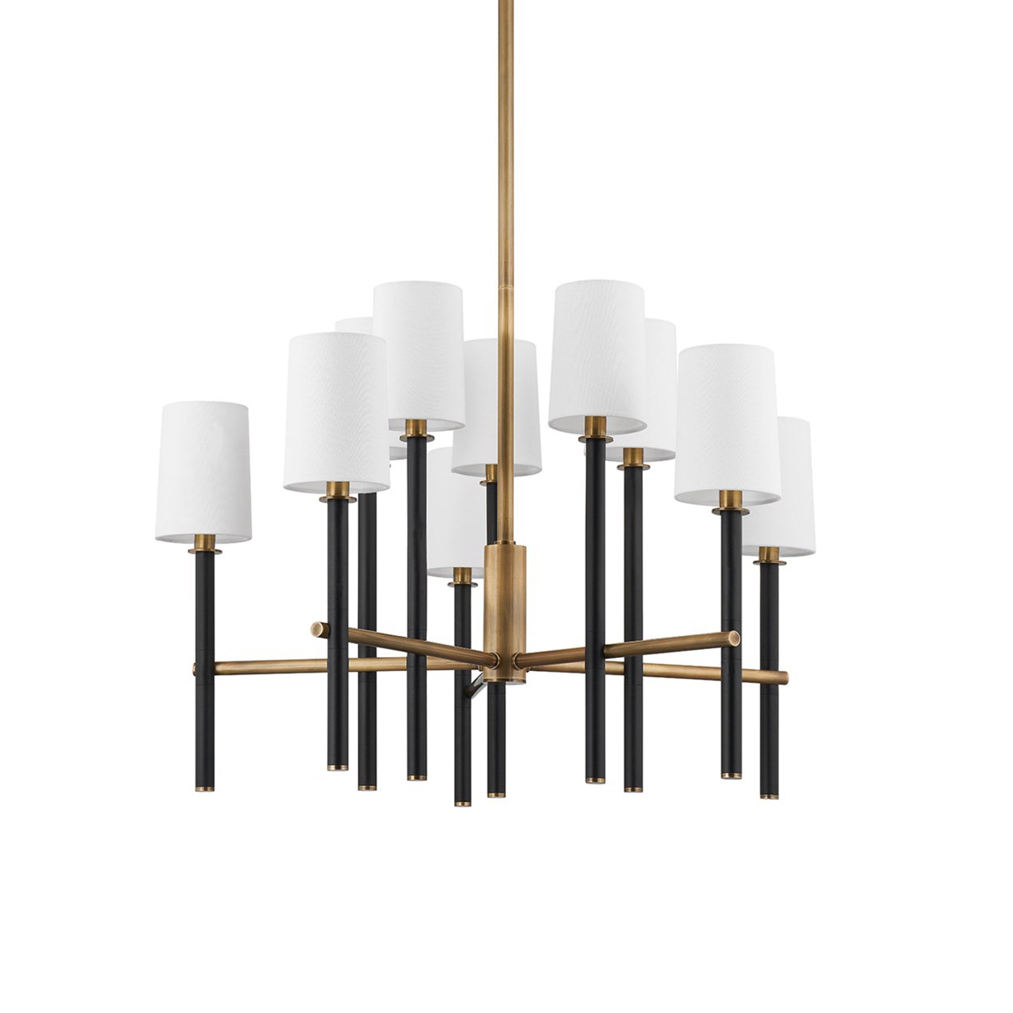 Embrace a linear motif with plenty of detail with a light fixture that crowns a traditional version of modern expression. Classic lampshade motifs bless the Belvedere Chandelier from Troy Lighting with a busy aesthetic formed with an excess of minimalist elements. This chandelier features patina brass framing that supports textured black candlesticks topped with slender white shades, yielding design and palette versatility as well as eloquent sophistication.