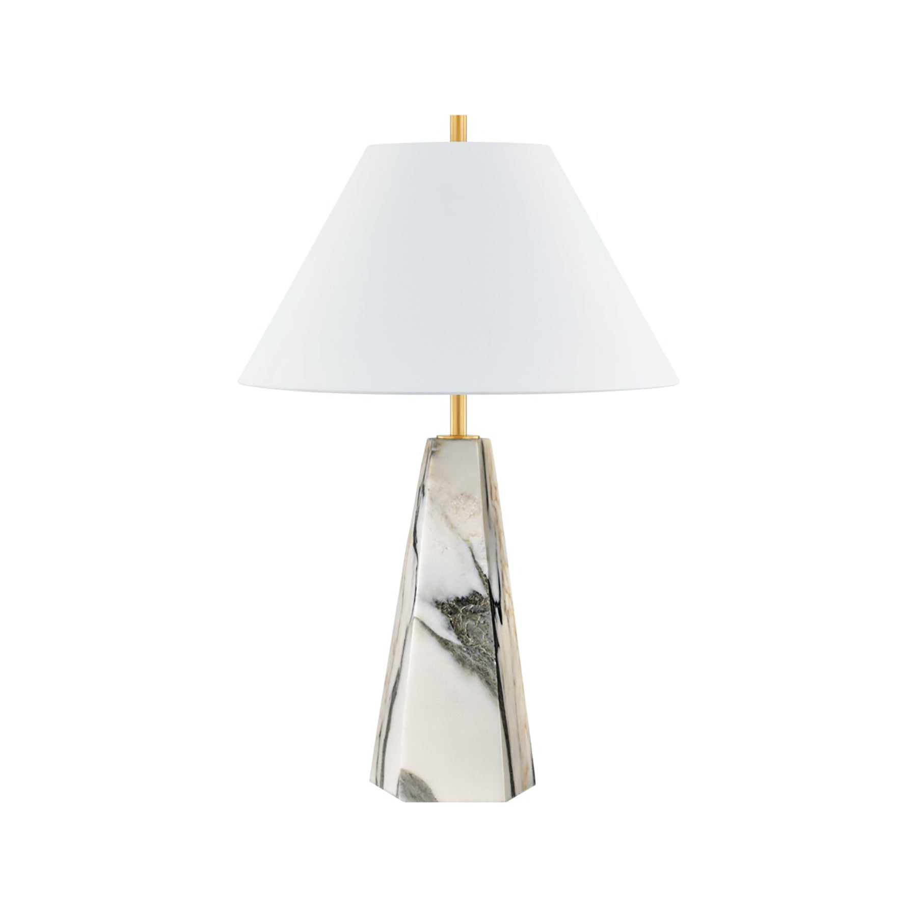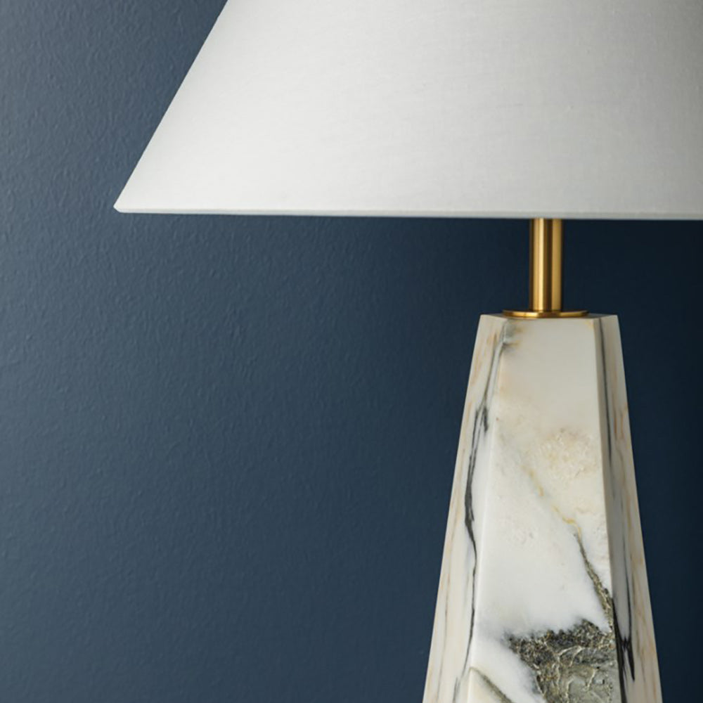 Inspired with an elegant presentation, the Benicia Table Lamp from Hudson Valley Lighting perfects a blend of geometric shaping and exquisite geologic presentation. With a neutral palette featuring polished stone construction, its pyramid silhouette and tapered shade strike a suitably balanced silhouette. Beautiful aged brass metal framing introduces an exquisite gleam, making this lamp a superb choice for complementing modern or transitional spaces.
