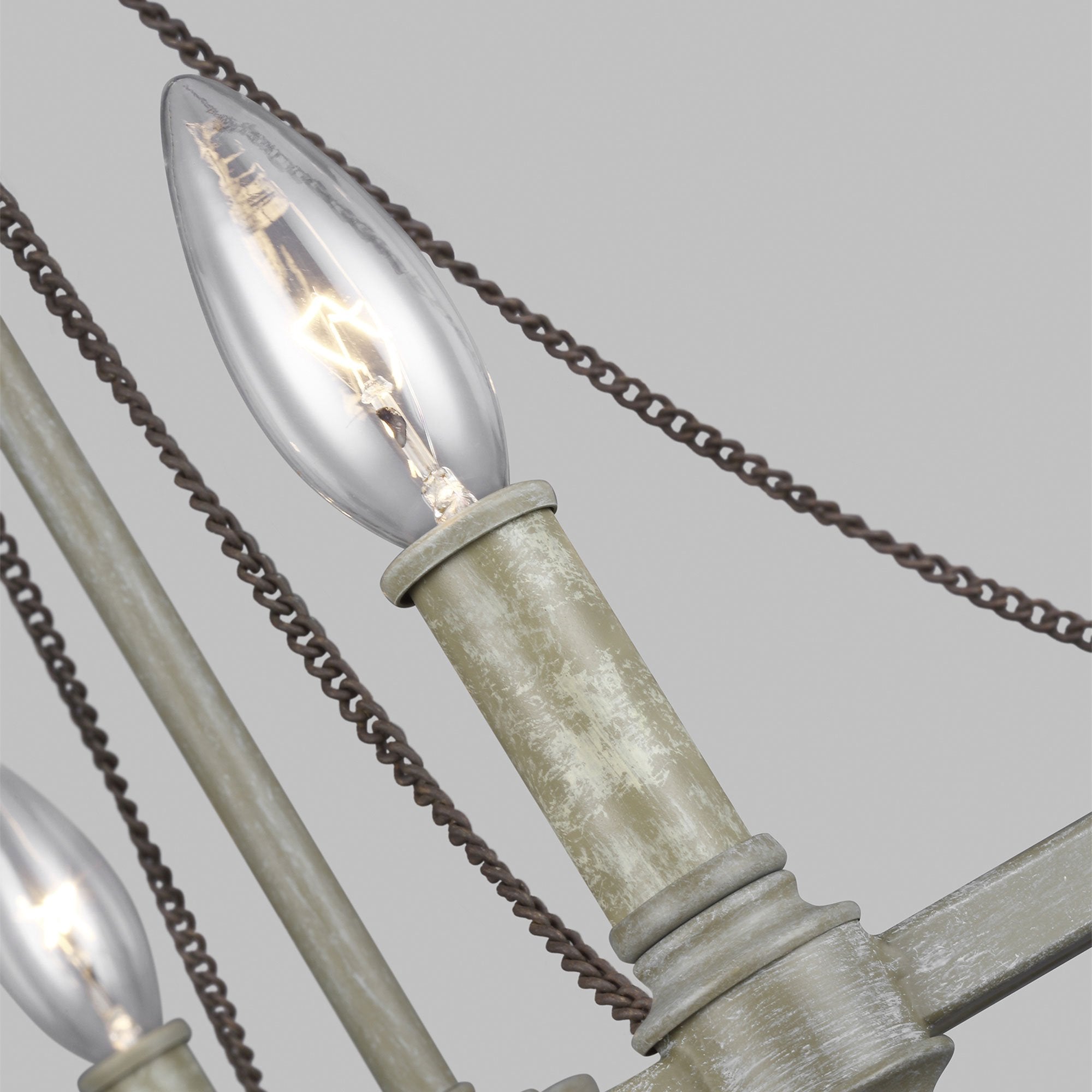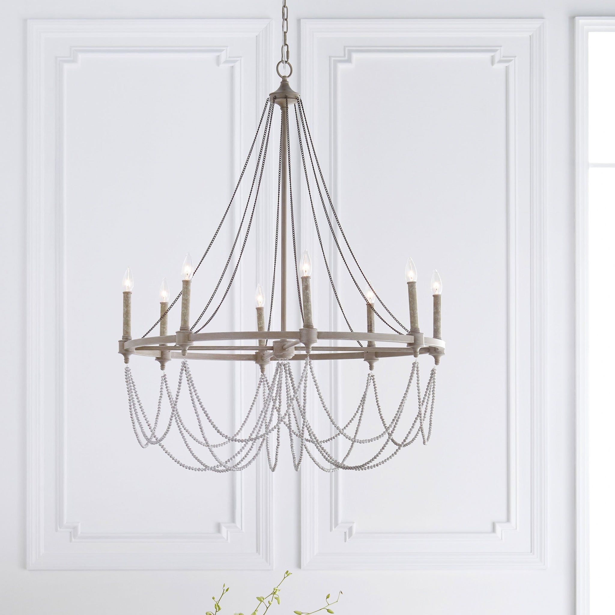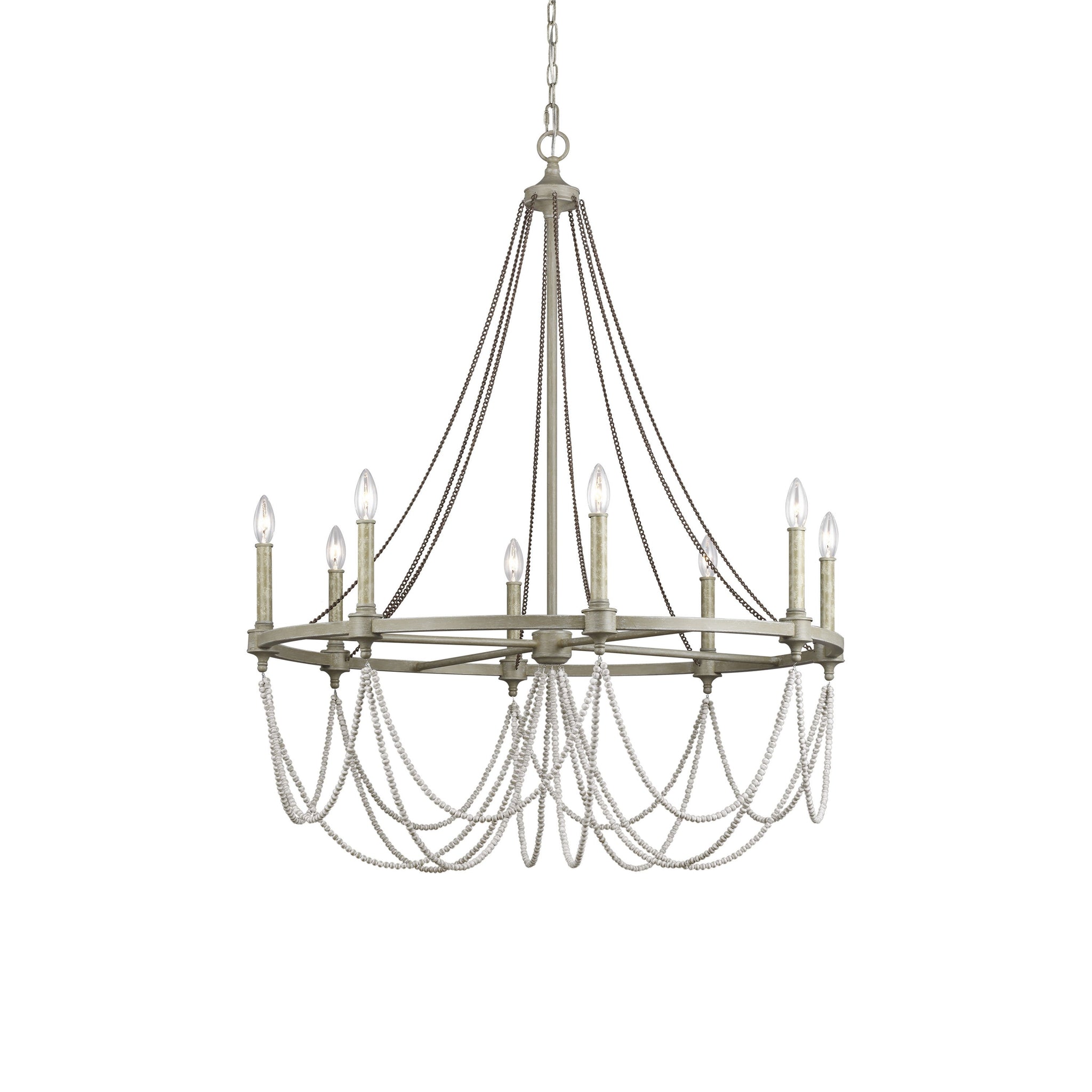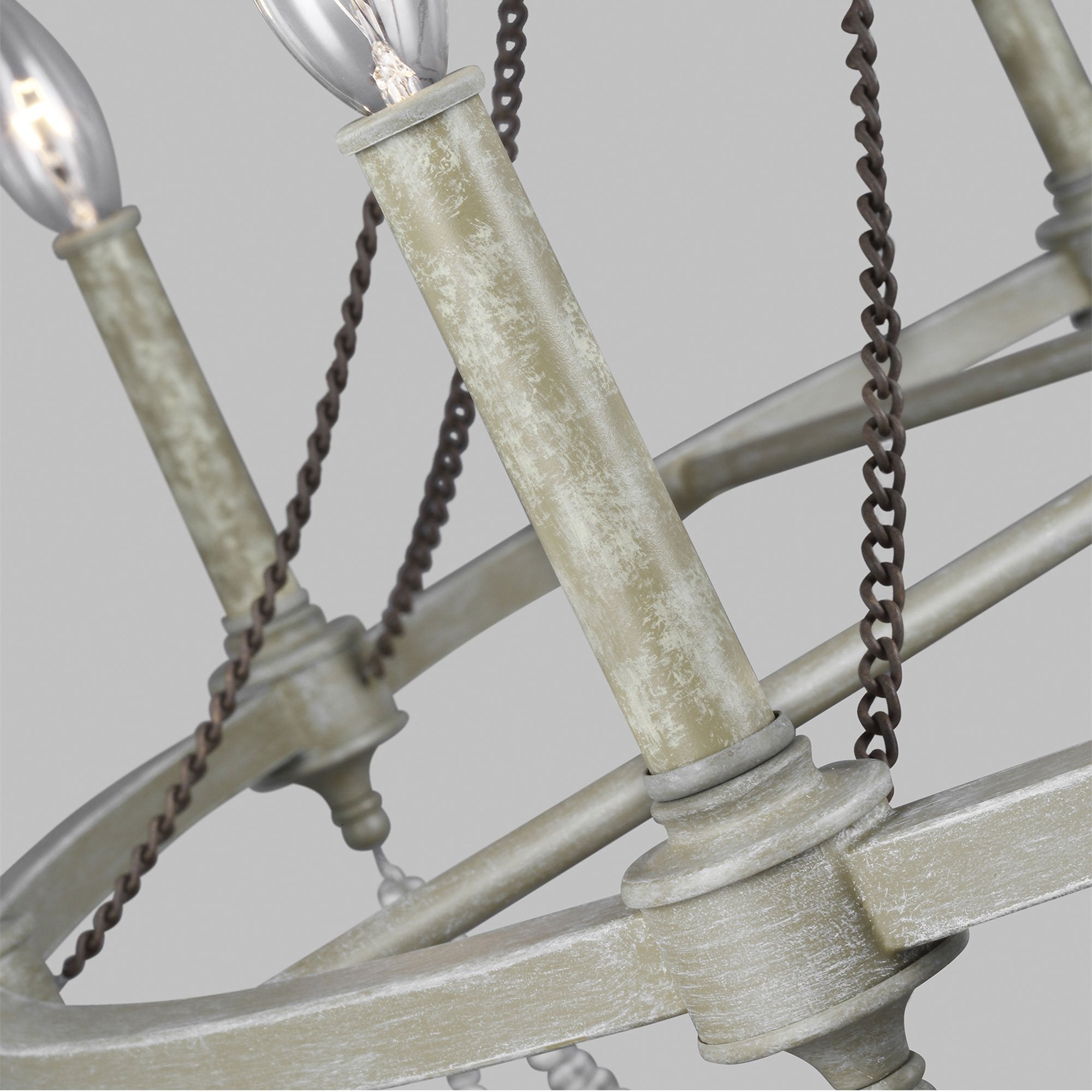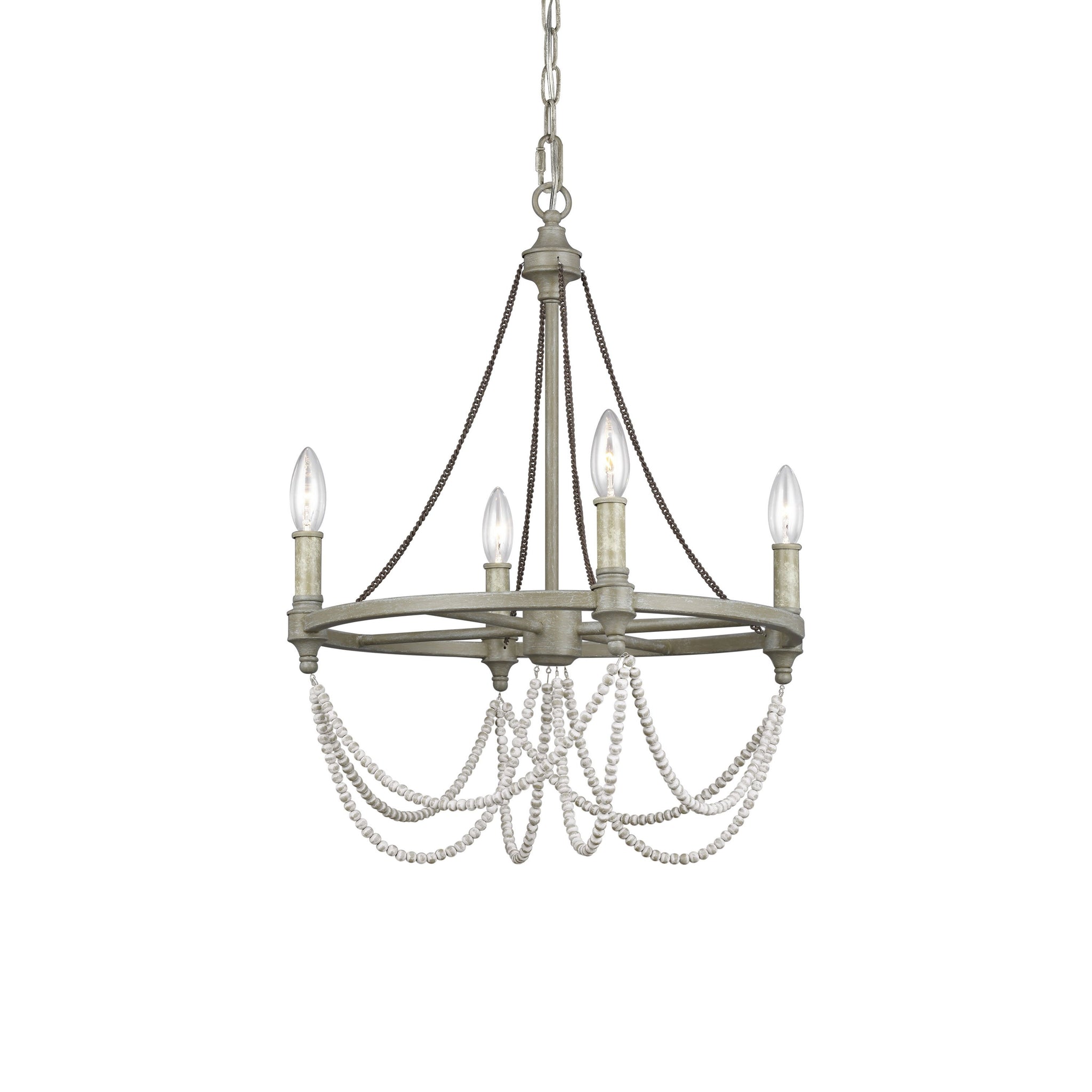 The Beverly Collection features a stunning combination of rustic, time-worn finishes like Distressed White Wood on the cascading beads, our vintage-inspired French Washed Oak finish on the frame and candle tubes, and Weathered Iron on the chain. Together these elements create a warm, and elegantly simple update to these traditionally-styled fixtures.