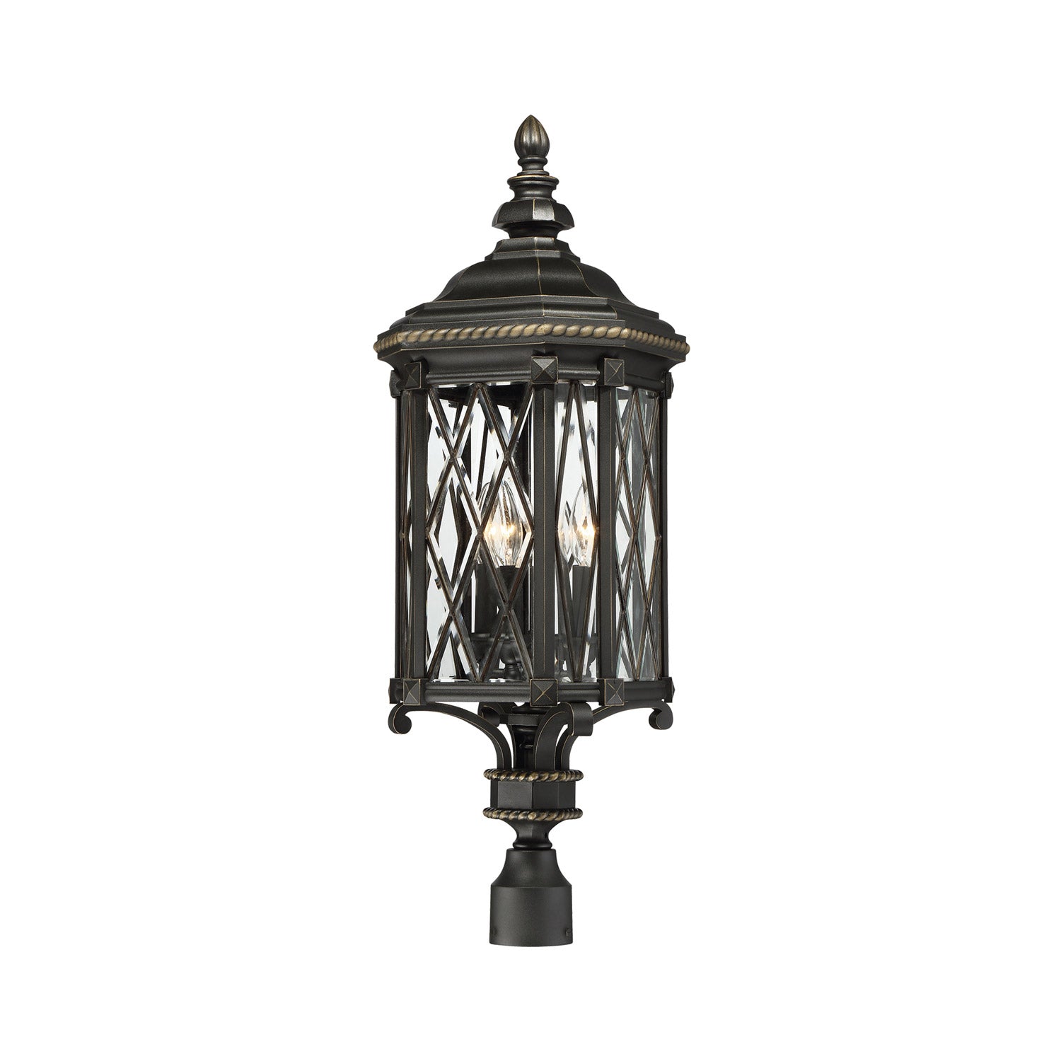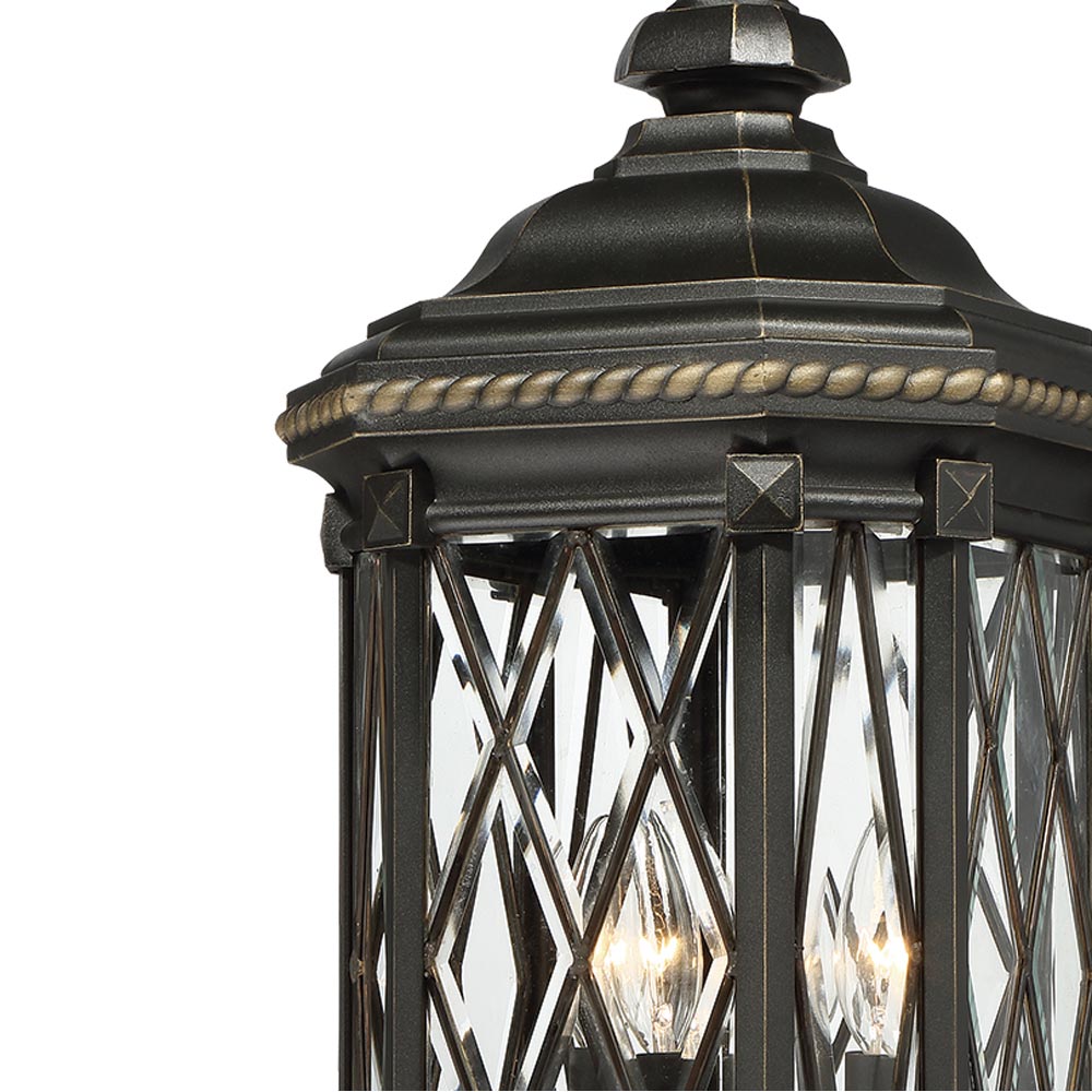 Anticipate a true custom look in outdoor lighting with a chic fixture styled for impact. The Bexley Manor Outdoor Post Light from The Great Outdoors brings together a lantern-like frame made of black finish metal with gold highlights. Intricate design details and geometric bias diamonds placed on clear beveled glass panels ratchet up the romance vibe to become a focal point.