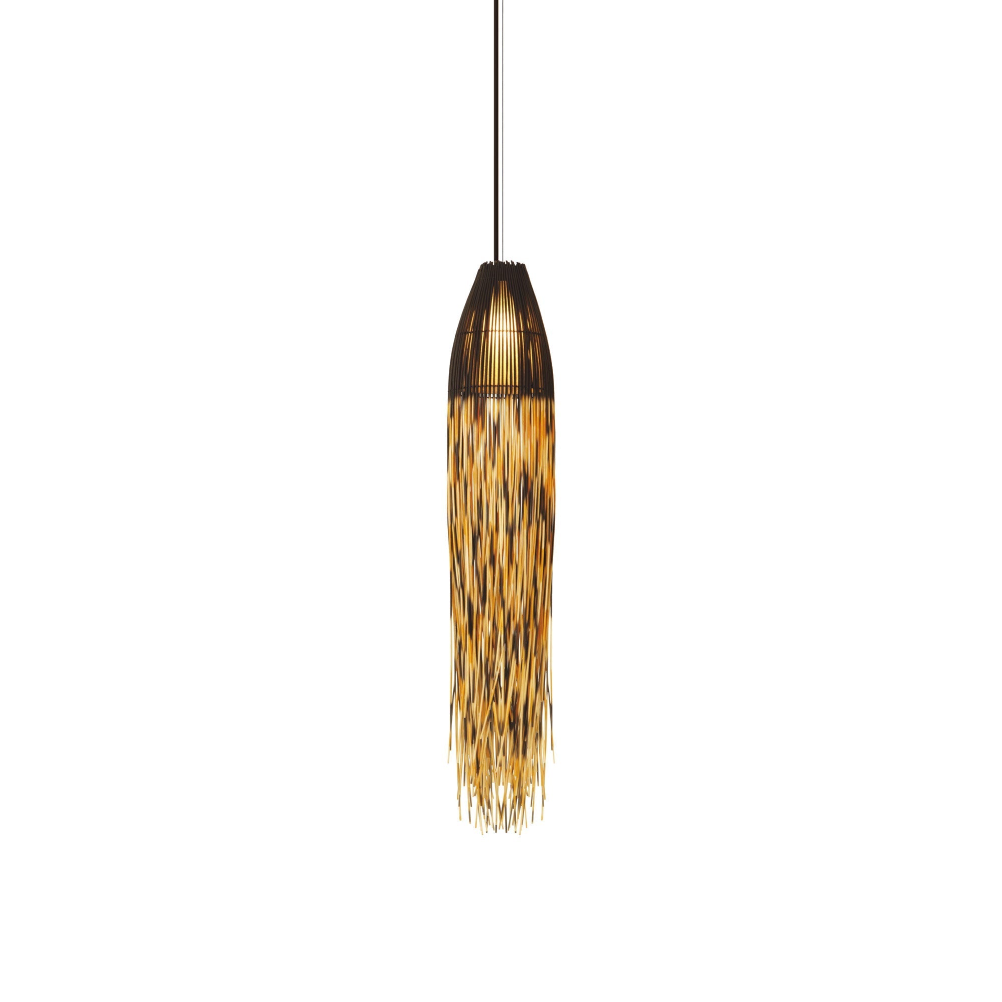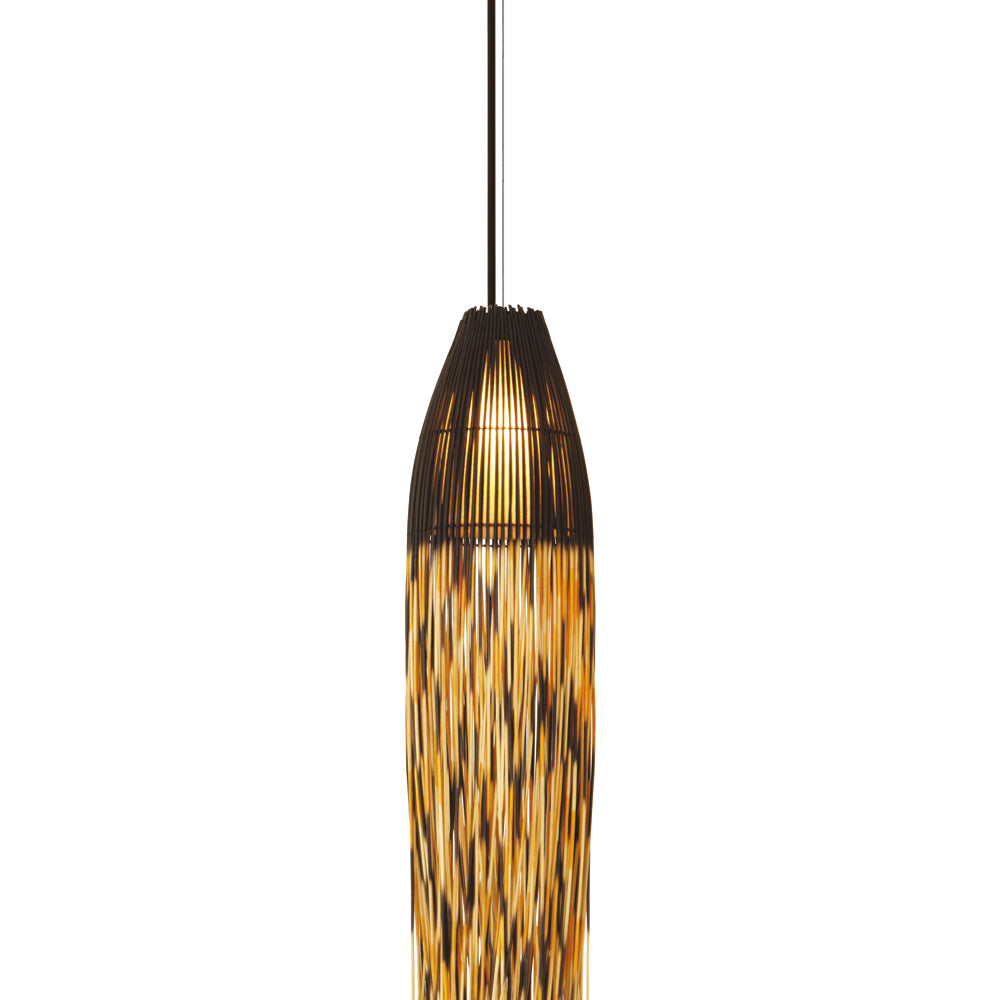 Texture and earth-inspired drama merge to create the Biba Pendant Light from Kenneth Cobonpue, a bold yet raw example of nature in decorative form. Nylon cabling suspends lights with strands of woven rattan, with steel framing leaving room for warm, glowing illumination. A blend of coastal and tribal, this fixture delivers a statement-making impact.