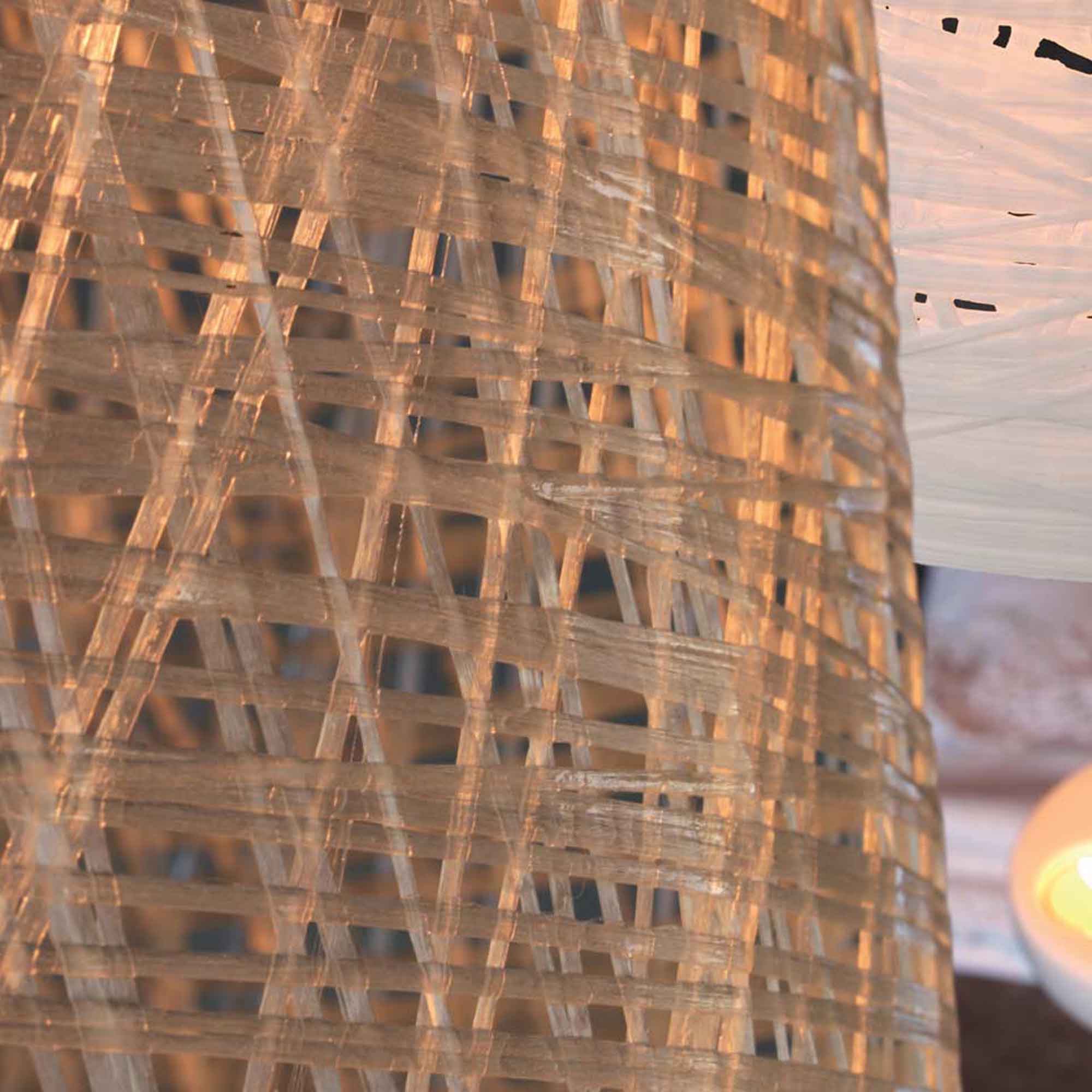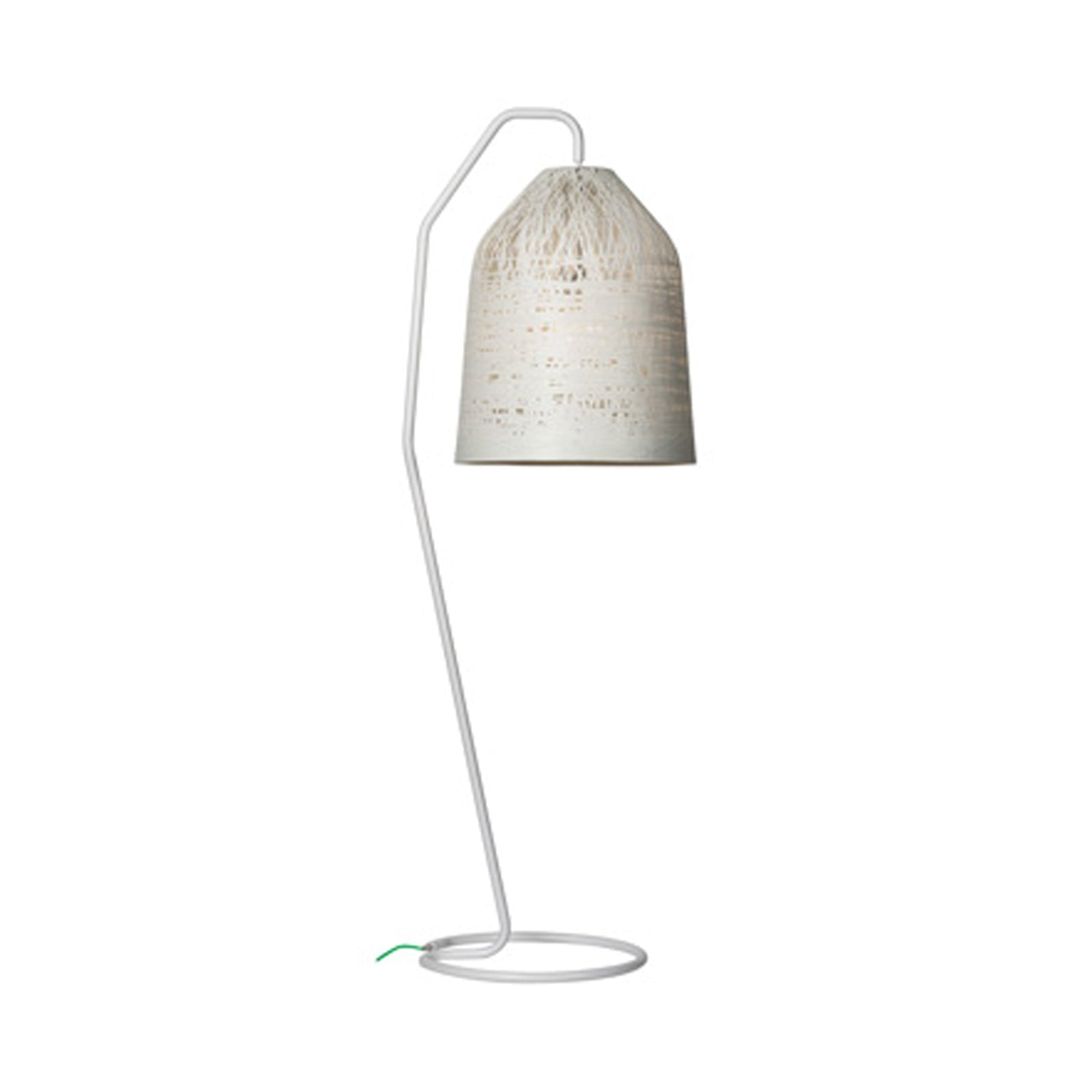 The woven, wrapped fiberglass strands of the Black Out Outdoor LED Floor Lamp from Karman lend global-inspired touches to an outdoor entertainment area. Providing a textured ambient glow, the bell shade hangs from a slim cantilever stand that extends to the floor and rests on a ring base.