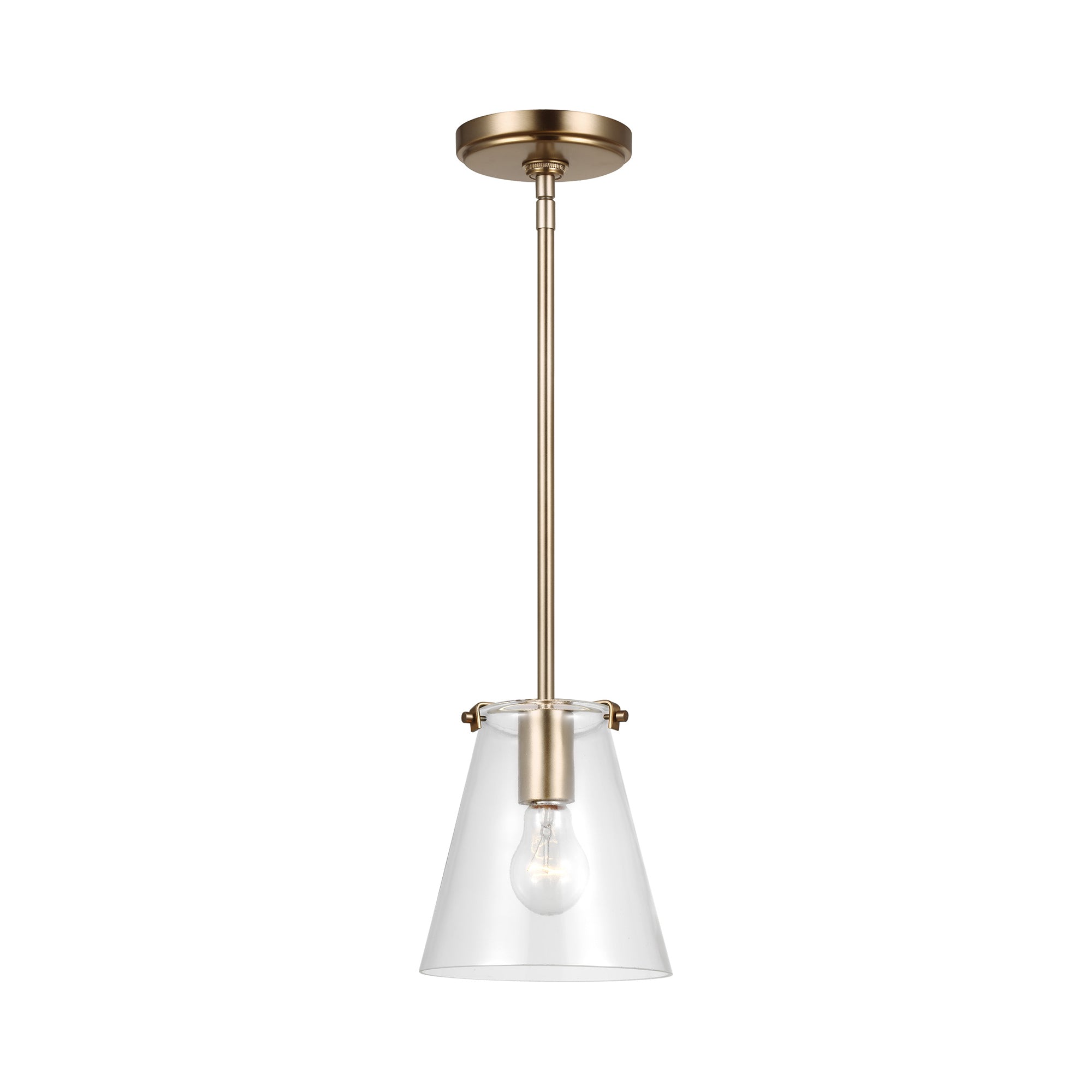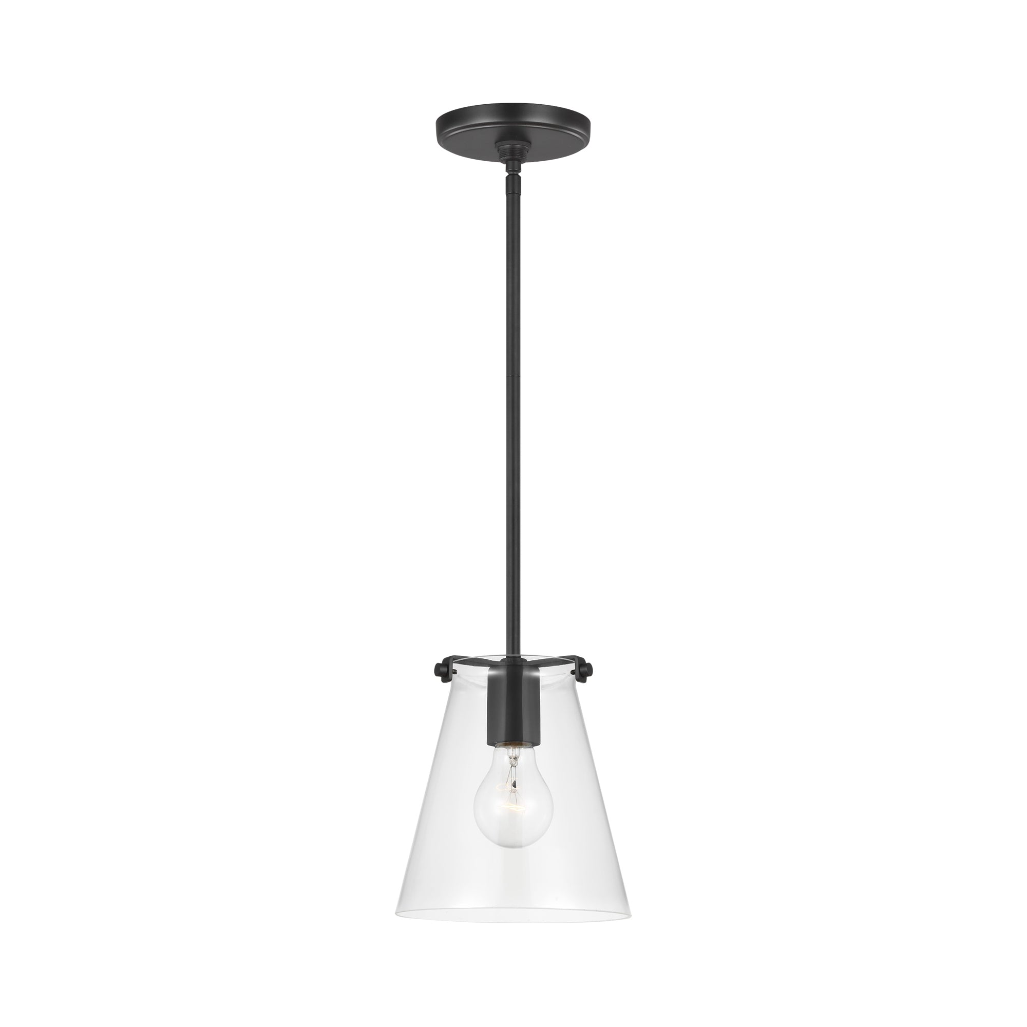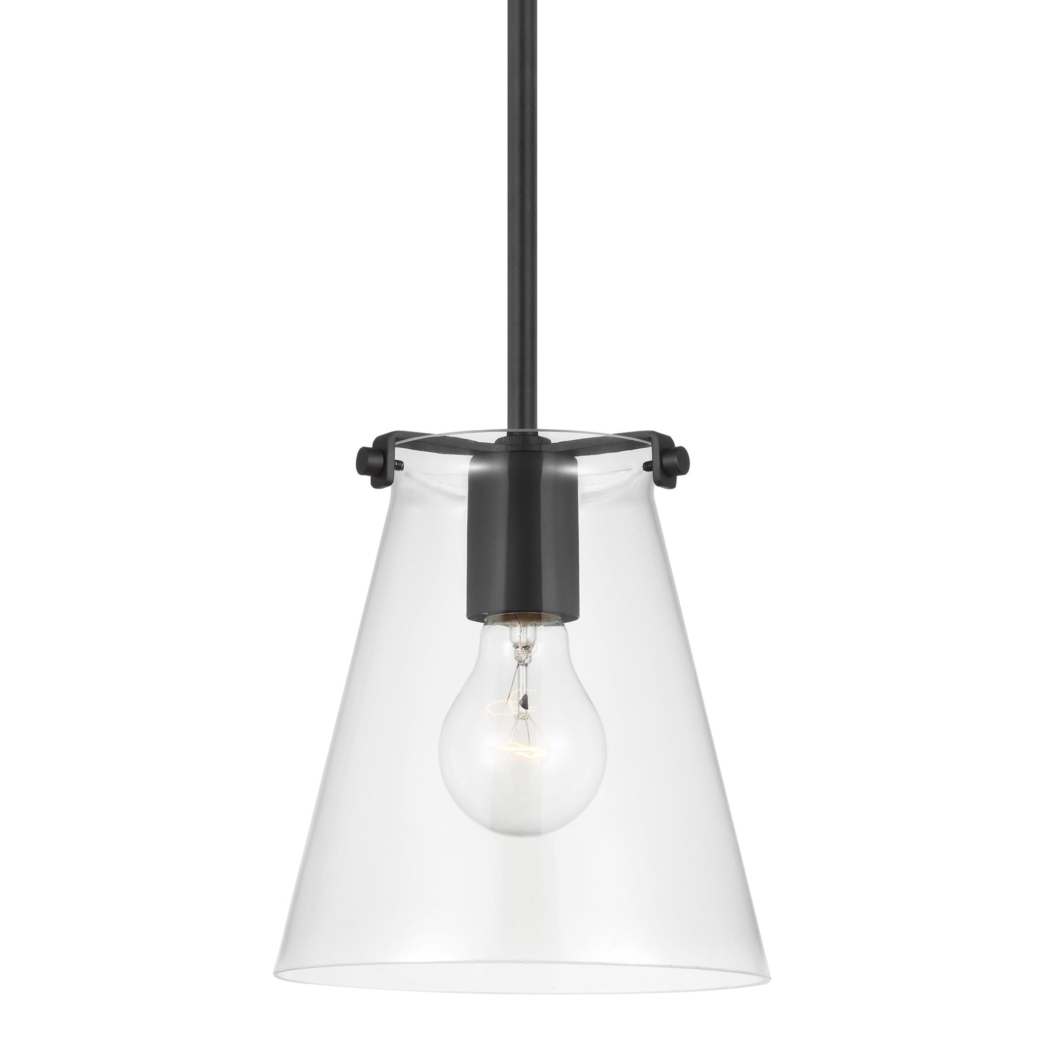 Drawing from the iconic blend of glass and metal, the Blaine Mini Pendant Light from Generation Lighting suggests a stylish and eye-catching look with endless versatility. A sparkling clear glass conical shade performs as expected, embellishing warm, radiant illumination. Tempting metal framing features a subtle yet design-forward silhouette bringing an eye-catching look.