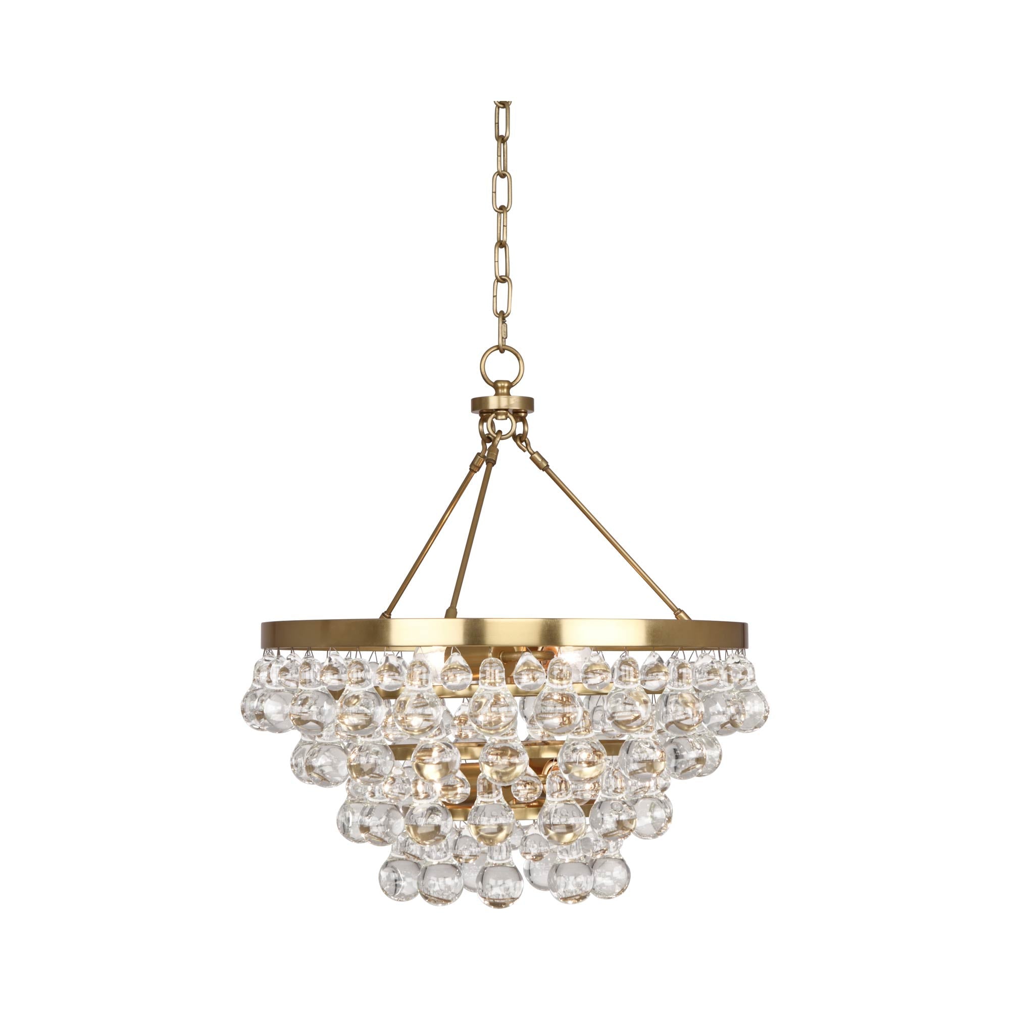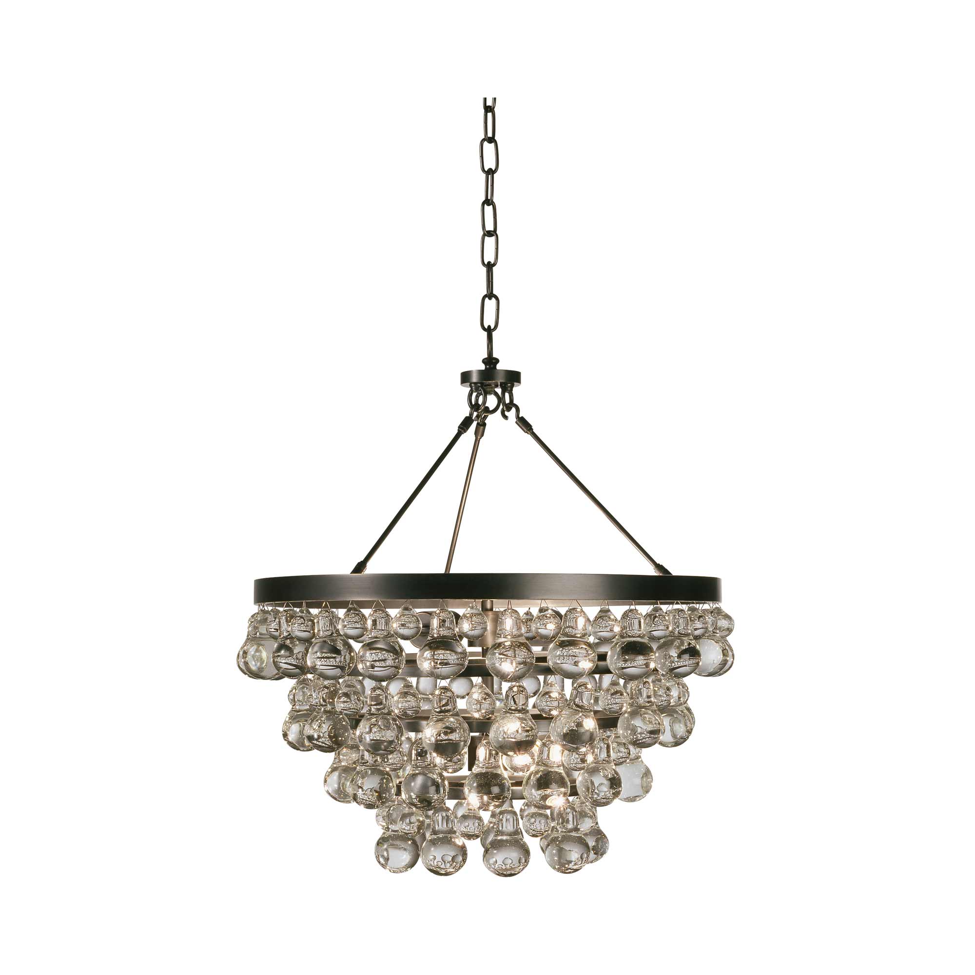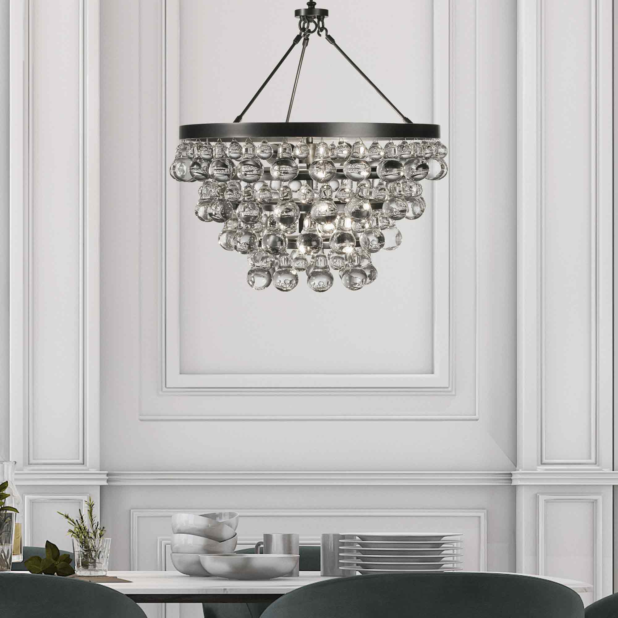 Glam and decadence take shape in a modern space with the stunning Bling Chandelier from Robert Abbey, putting on display a chic tapered silhouette formed by clear glass drops and metal accents a choice of finishes to suit a tailored contemporary dining room, living area, or entryway.