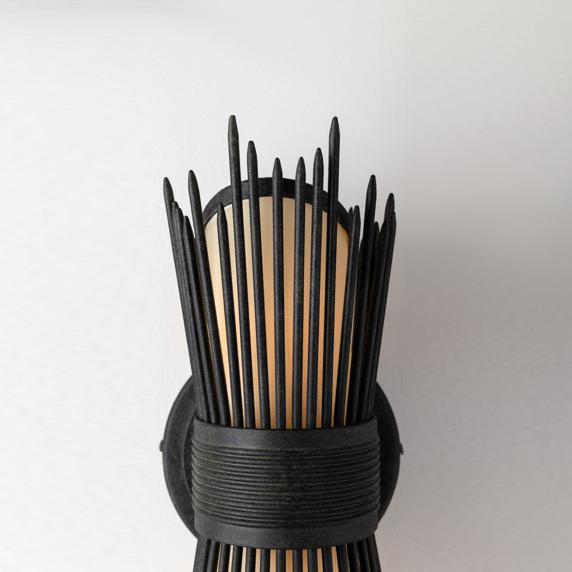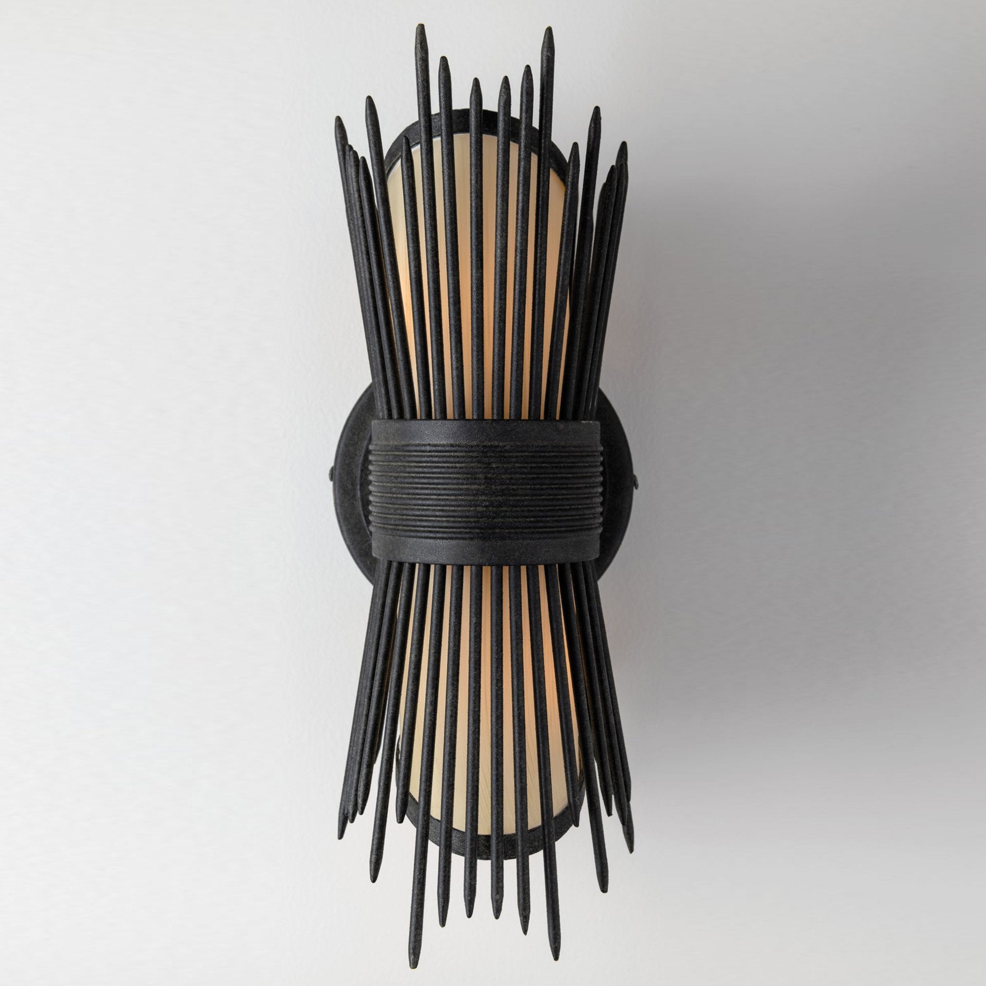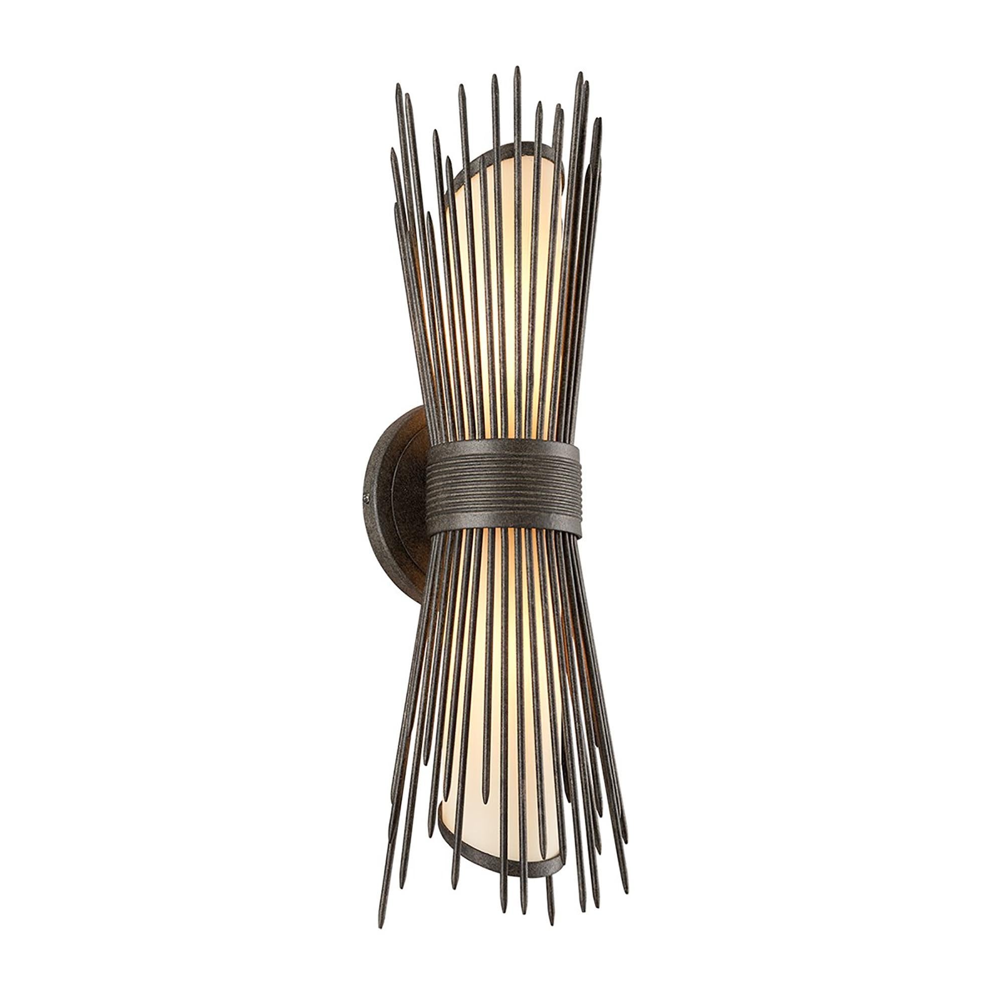 An abstract design joins French iron finish metal and Provence glass in creating a modern influence with artistic flair, adding chic gallery inspiration to the Blink Outdoor Wall Light from Troy Lighting.