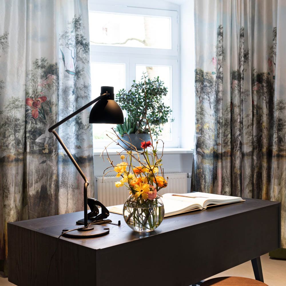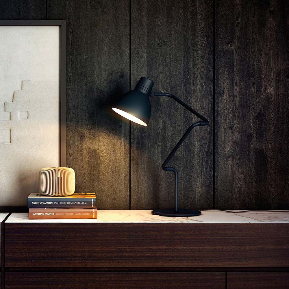 Retro influences shine through in this Blux System T Table Lamp from B.Lux. An articulating neck secures an old-school lamp into place, hovering over workstations and tables for a dignified and studious drafting table-inspired aesthetic.