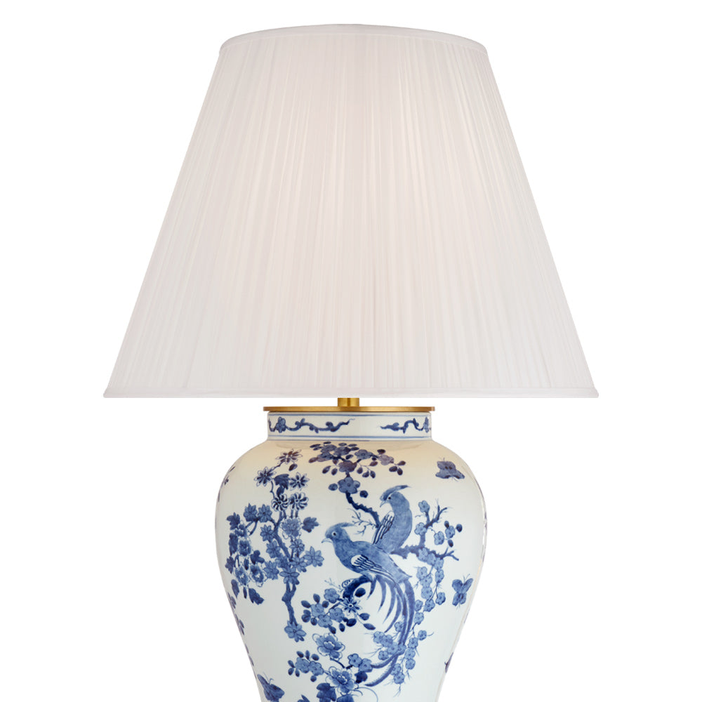 The Blythe Table Lamp from Visual Comfort Signature creates a path to get lost in the romantic tradition of ceramic beauty as it fashions a classic look. A flared ginger jar porcelain body with iconic avian patterning in blue over white will conjure a beloved theme, sitting on an articulated metal base. Topped with a crisp white shade, this lamp makes itself a staple in living rooms and bedrooms.