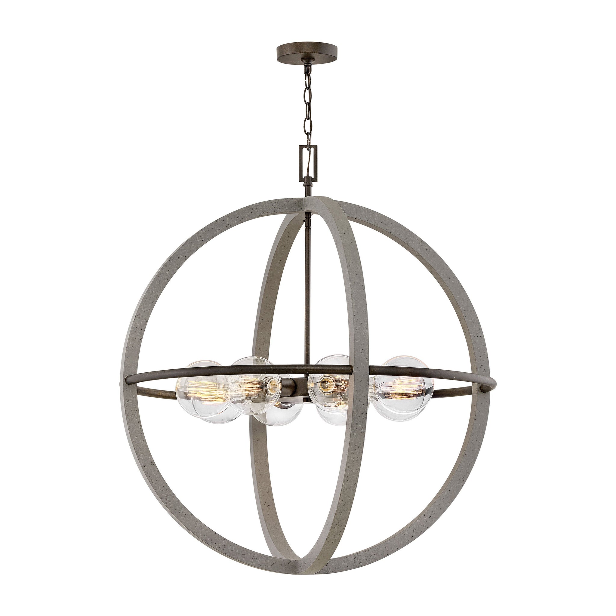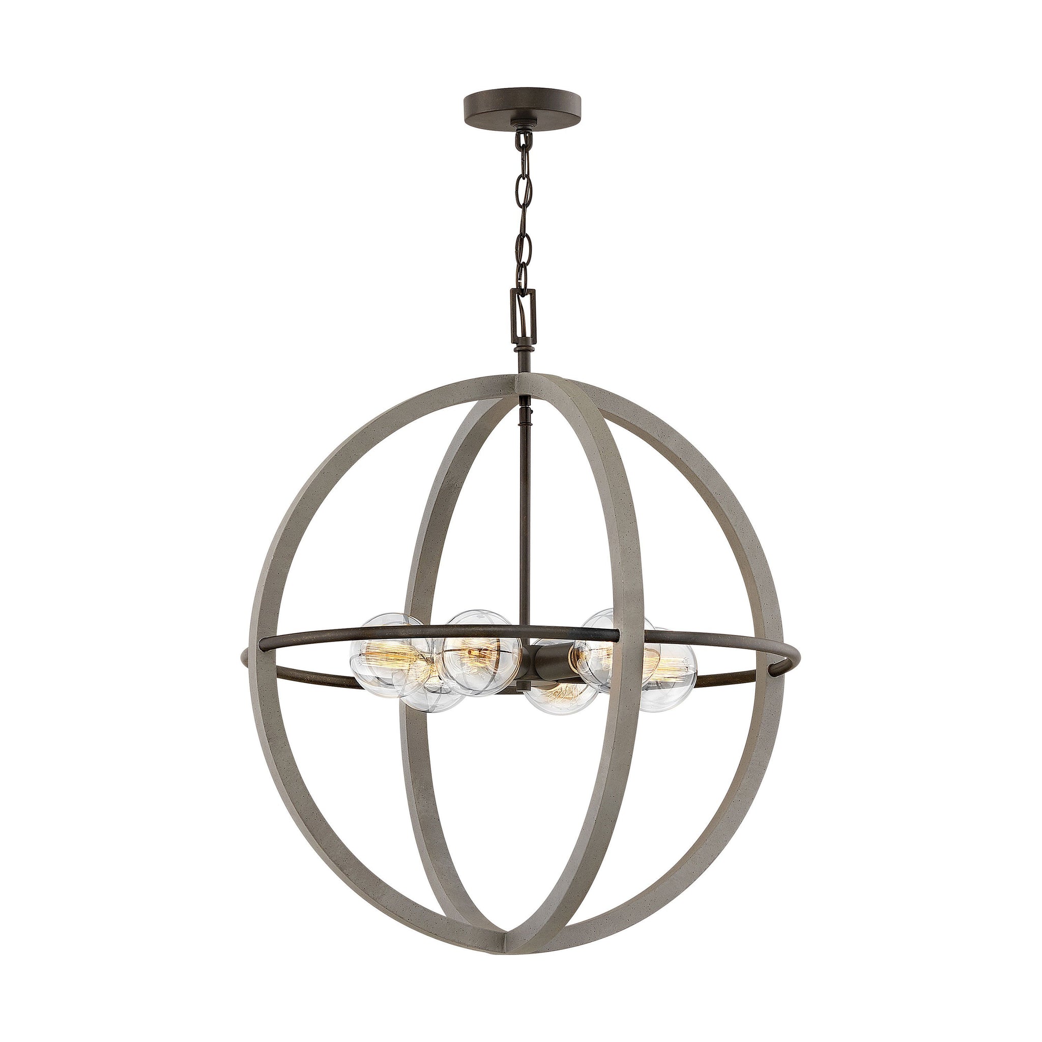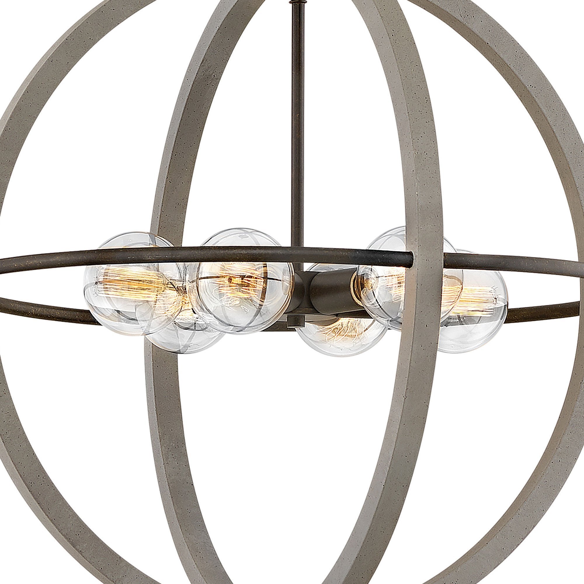 Bodie Chandelier is simple, sturdy and built to last, just as expected when industrial and farmhouse influences combine. The open globe look revolves around clean vertical lines with a Dark Cement finish encircling a single Bronze finish horizontal band. A Bronze stem and canopy complete the two-tone design.