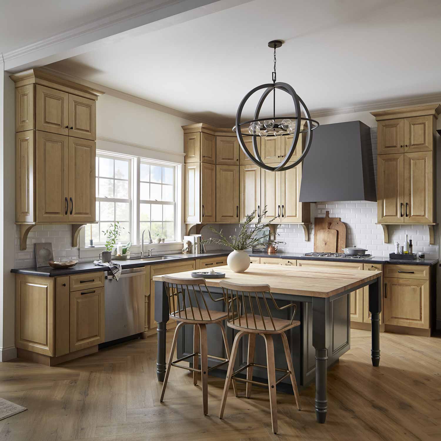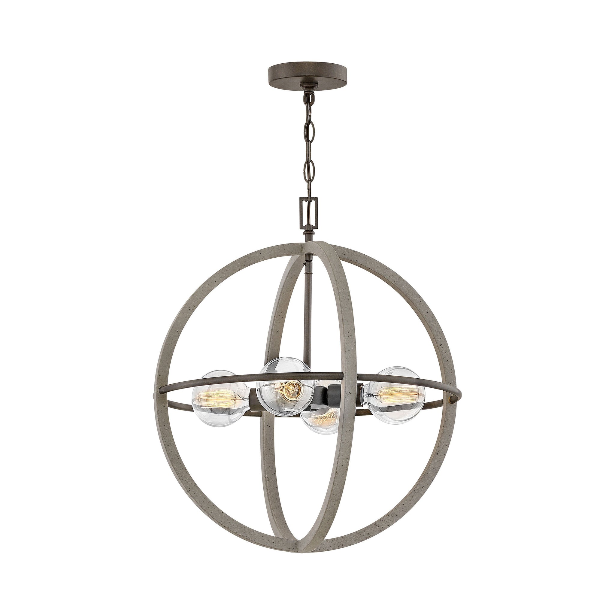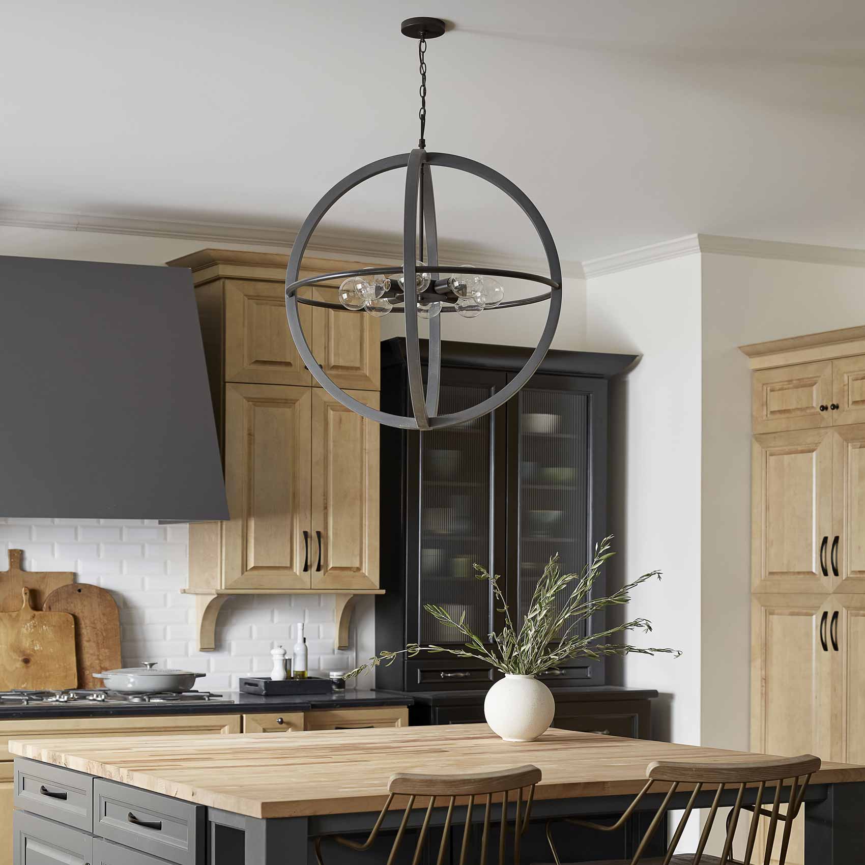 Bodie Chandelier is simple, sturdy and built to last, just as expected when industrial and farmhouse influences combine. The open globe look revolves around clean vertical lines with a Dark Cement finish encircling a single Bronze finish horizontal band. A Bronze stem and canopy complete the two-tone design.
