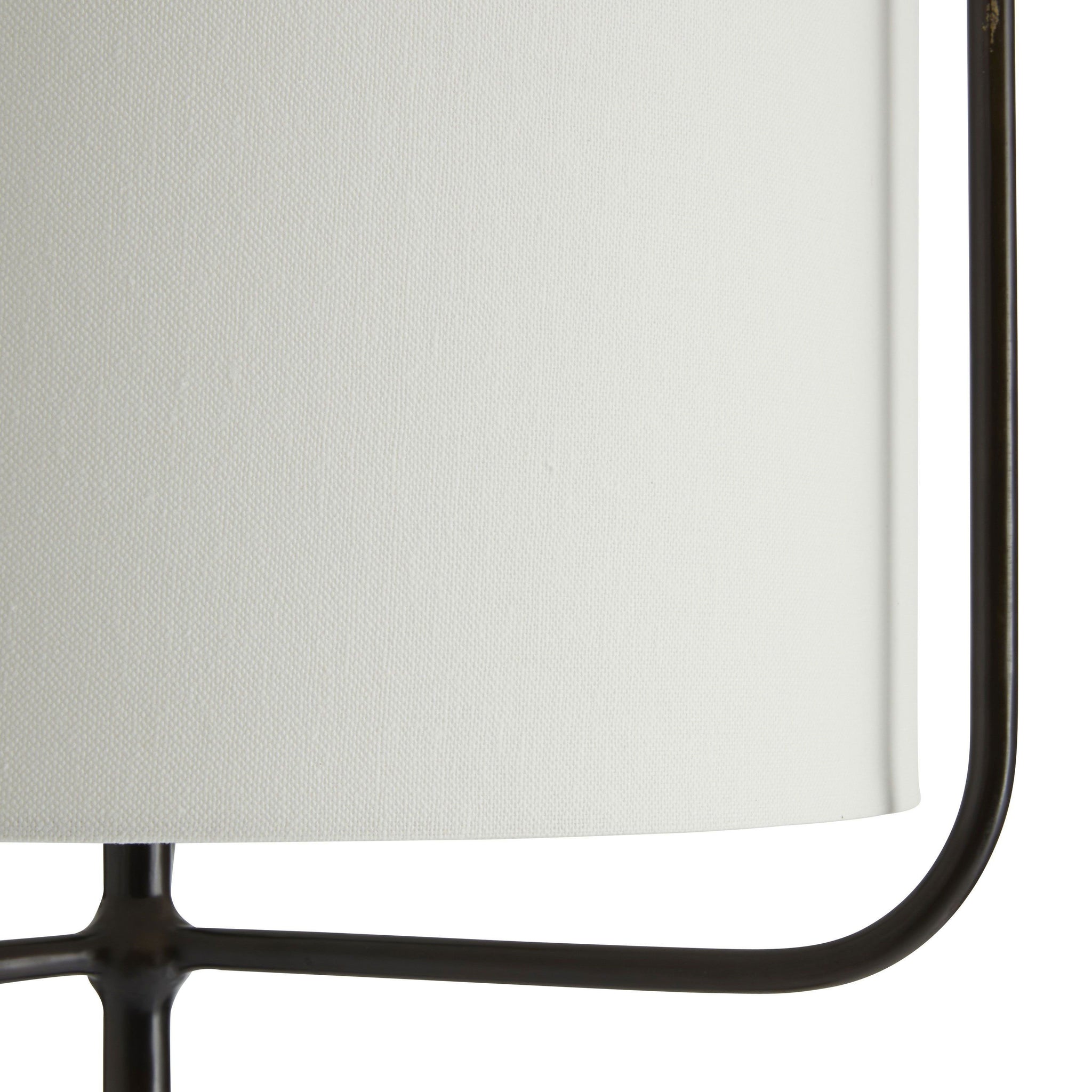 A delicate iron frame in a bronze finish dons an oversized drum shade to create this simple and sophisticated floor lamp. Three arms surround the shade offering a unique visual appeal as it appears to float. The sleek frame is fashioned to an antique brass iron base for a striking contrast and the off-white linen shade with off-white cotton lining is complemented by a 1" brass sphere finial. A great addition to traditional at-home and commercial settings.