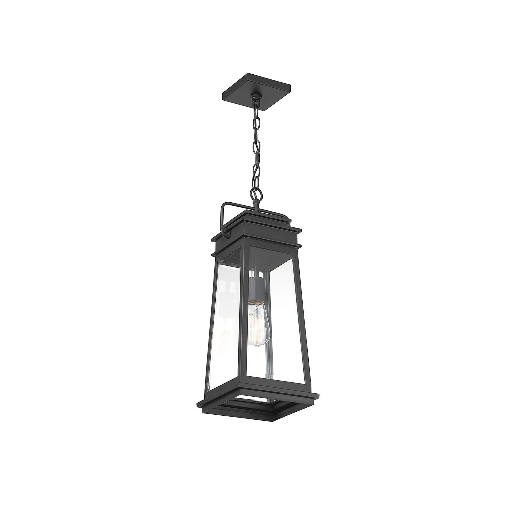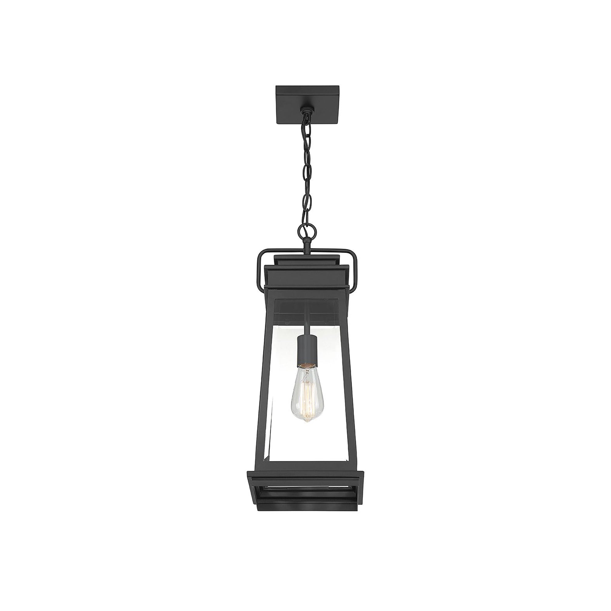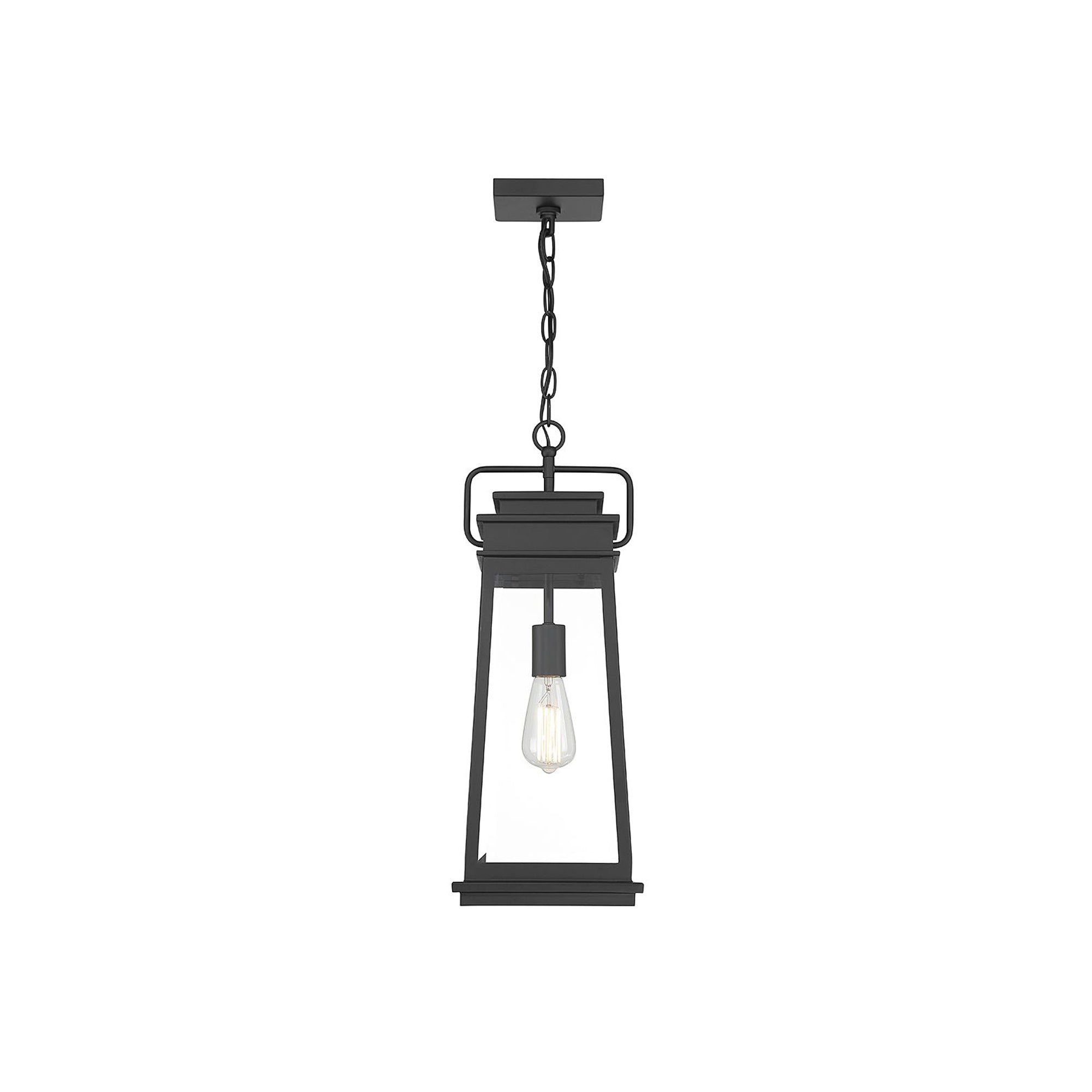Emulate a nautical aesthetic in exterior lighting with the Boone Outdoor Pendant Light from Savoy House. Chic styling begins with a classic lantern motif and adds ornate linear detailing and framing in matte black finish metal. Clear glass panes keep it simple and basic, showing off an interior socket and creating an artful addition to a patio, gazebo, or pool house.