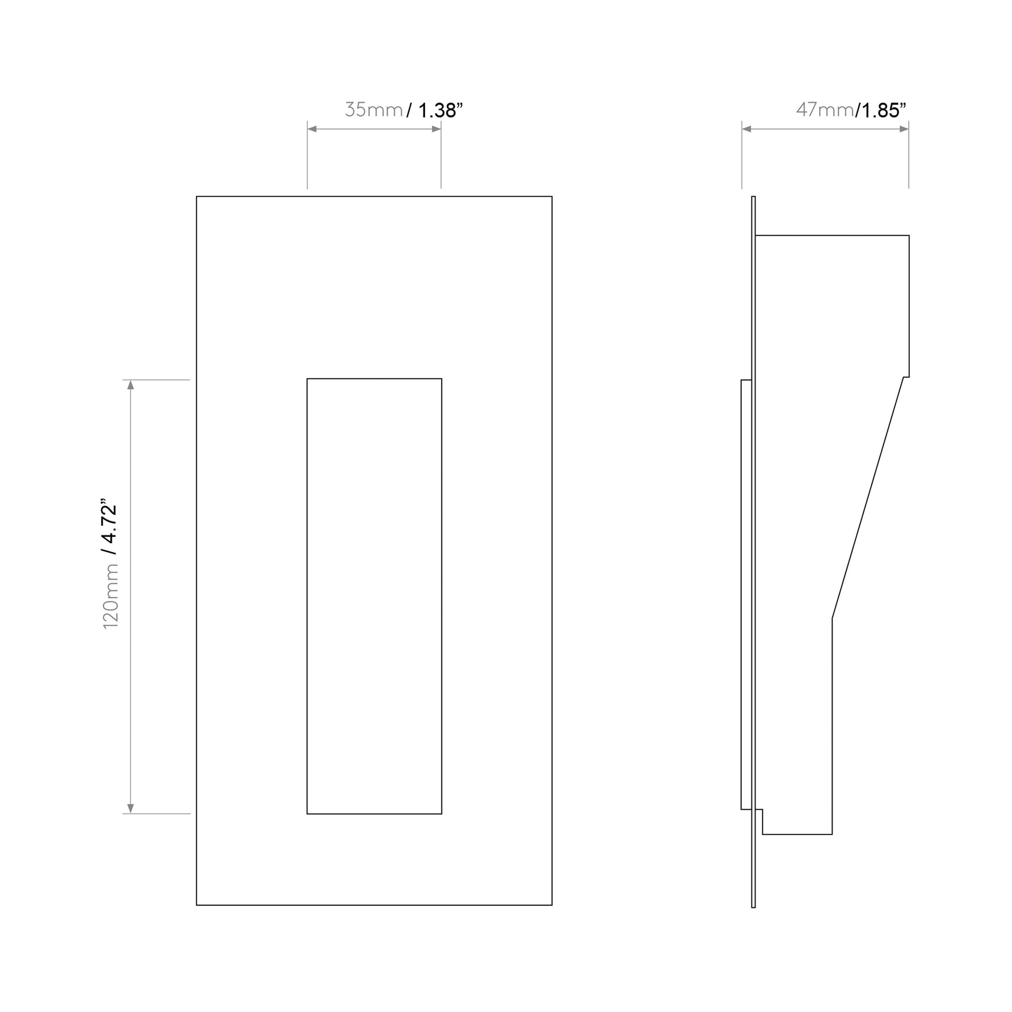 - Rectangle: 1.38"W X 4.72"H; 1.69" Extension