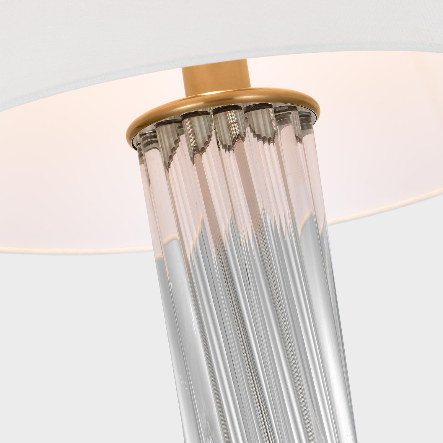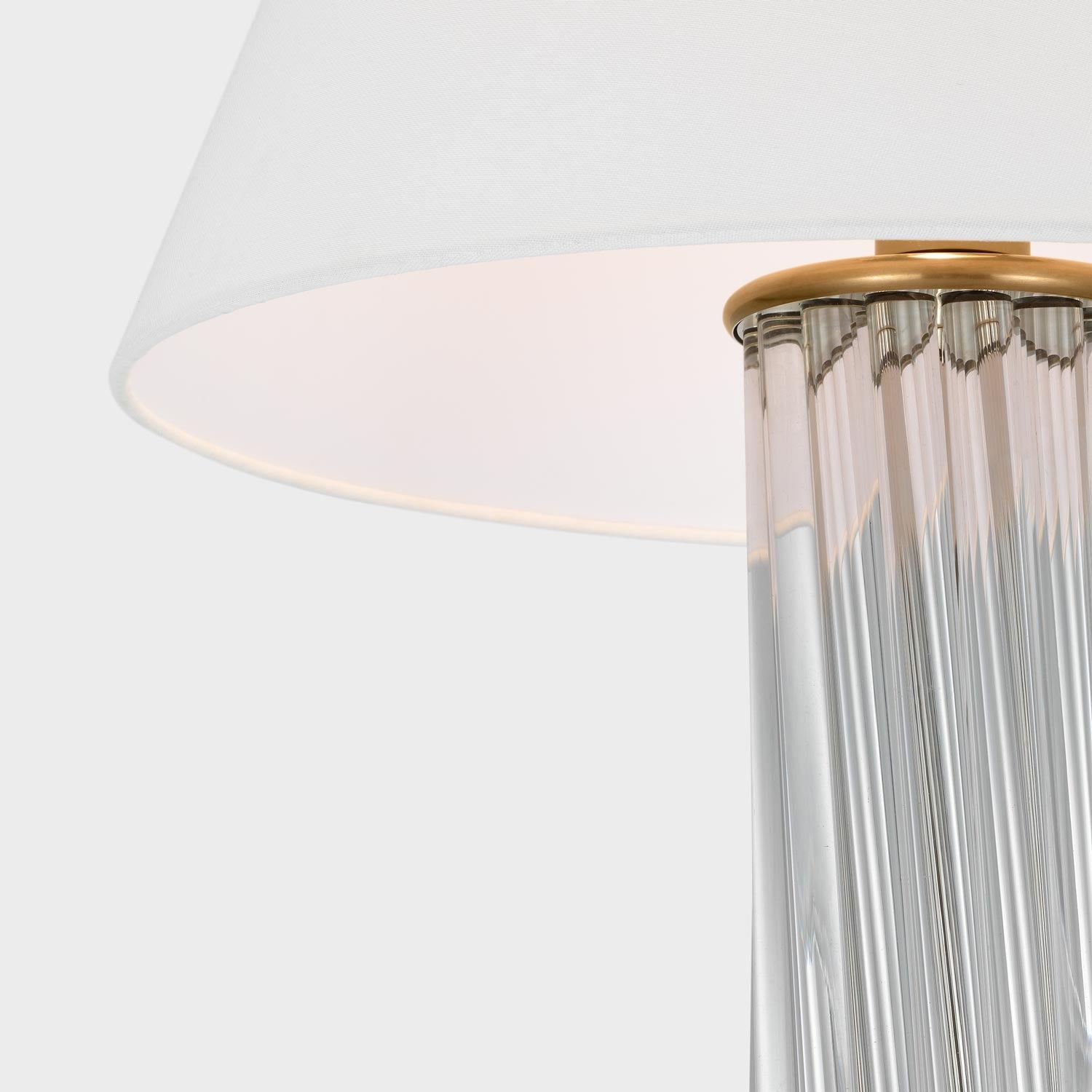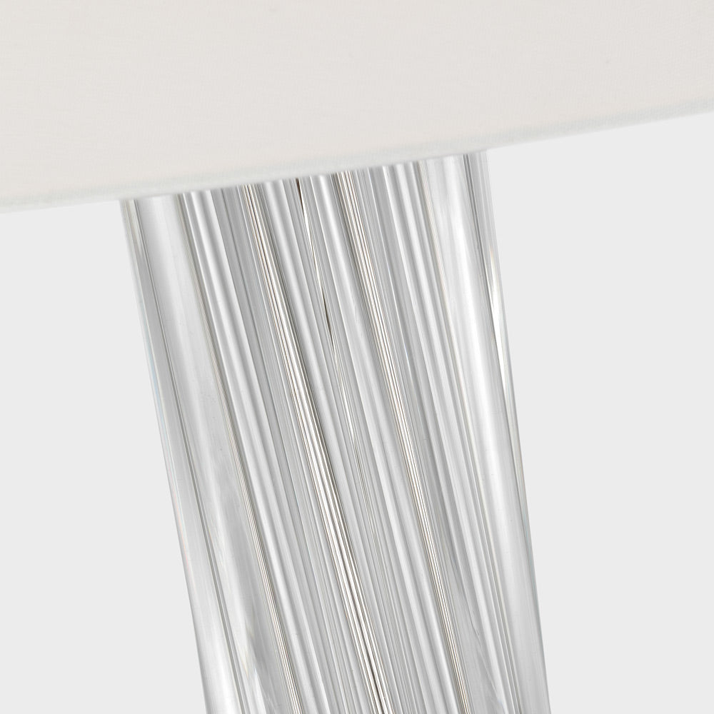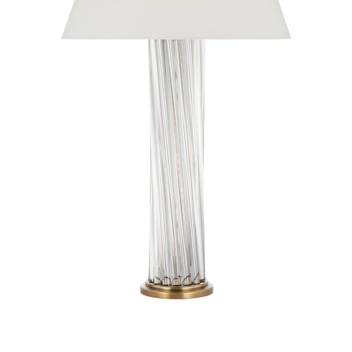 The Bouquet Table Lamp from Visual Comfort Signature brings a modern look with a hint of gallery style, perfect for versatility and a great choice for infusing sparkling qualities. This lamp features a cylinder column made of delicate clear glass rods angled and clustered in a vase motif. Metal accents and a clean linen empire shade leaves all focus to glass and an overall decadence.
