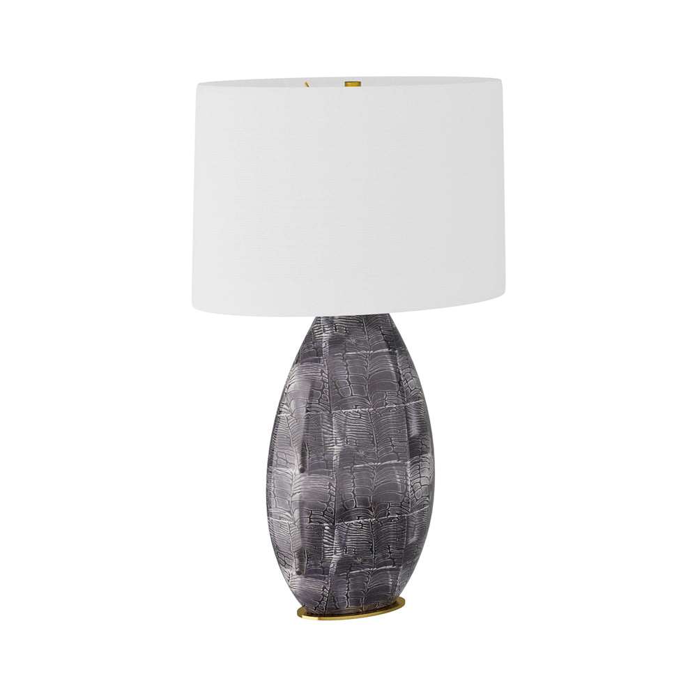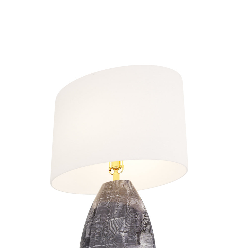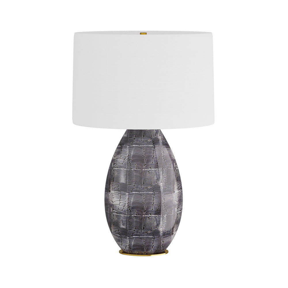 Meshed styles of contemporary geometric and textural tradition add up to an exceptional design. The Brando Table Lamp from Arteriors drive home a dramatic vibe with a porcelain oval-shaped body and scintillating blend of gray, black, and white patterns offering a natural aesthetic.