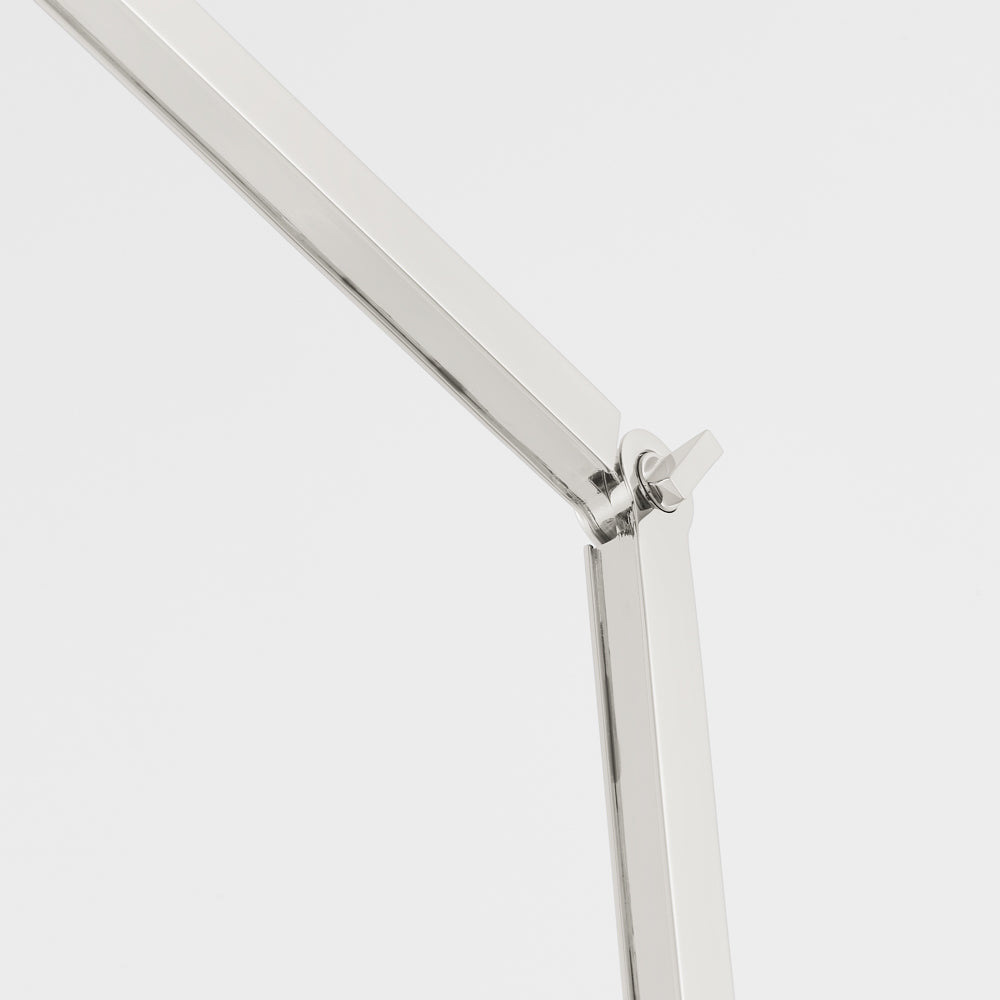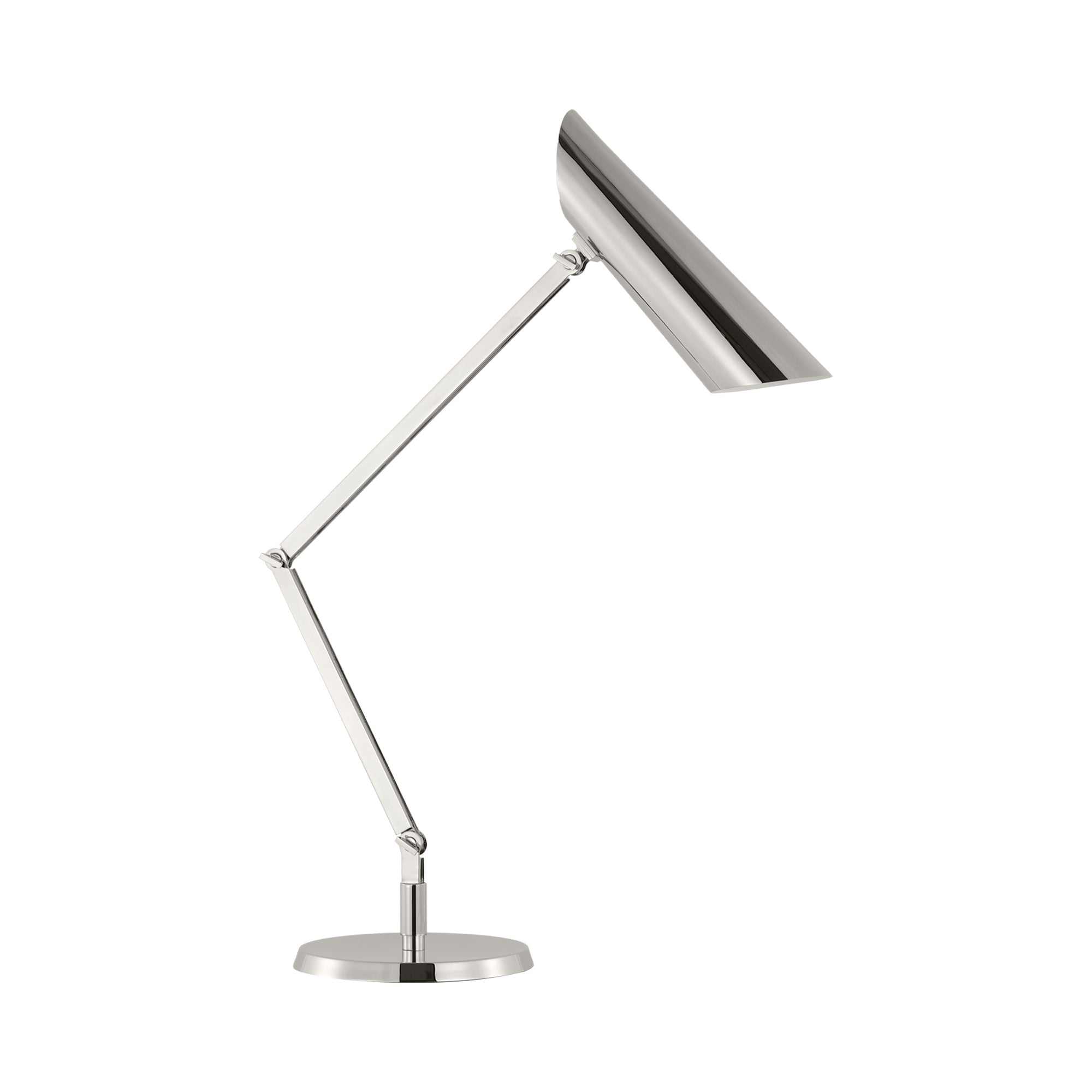 The Bravo Table Lamp from Visual Comfort Signature reworks a modern studio aesthetic with strikingly exaggerated style. Strict geometric silhouetting creates a fully adjustable lamp made of sleek metal, with an asymmetrical and elongated shade. Position its arm to customize angles of illumination, perfect for reading or for accenting decor.