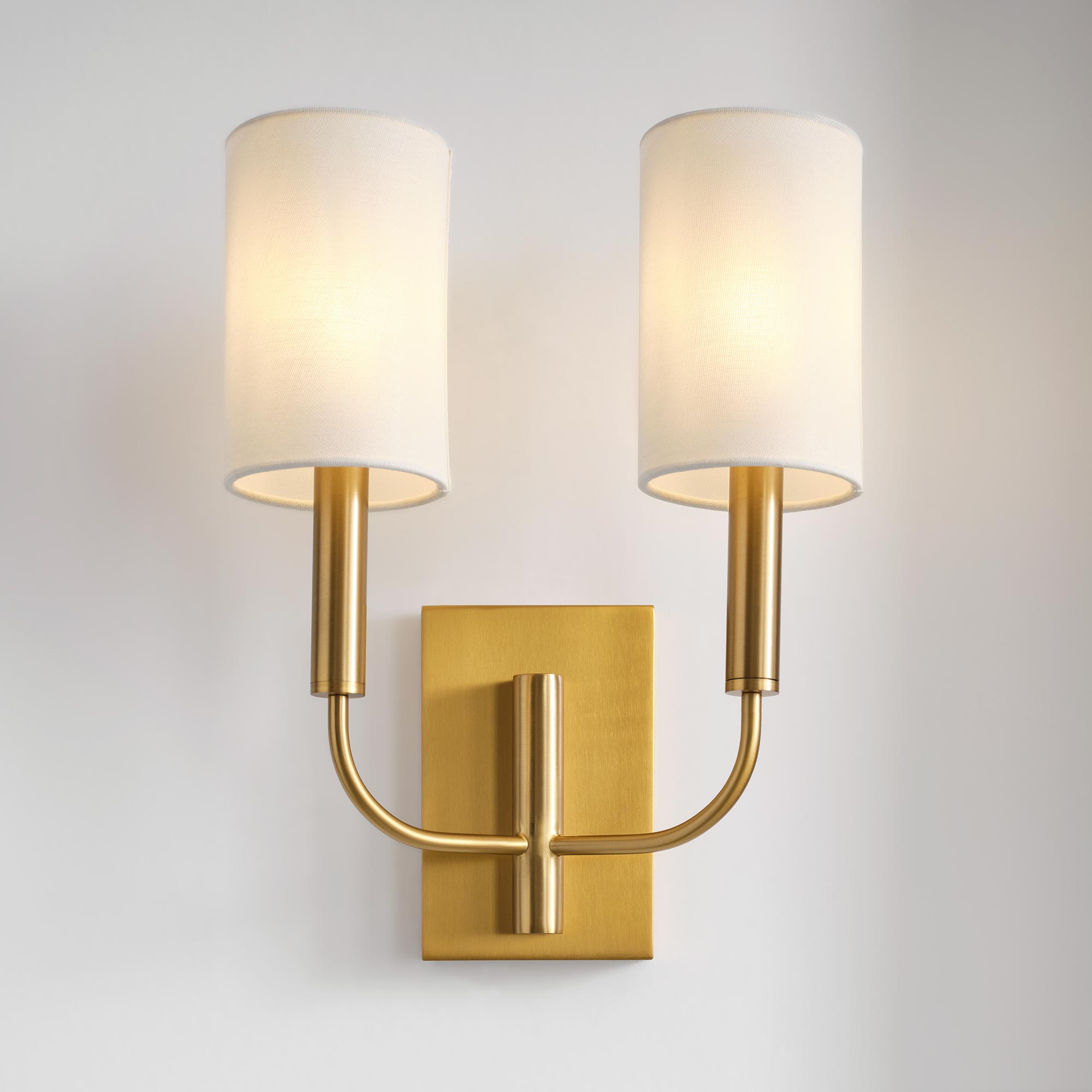 Brianna's graceful, seamless curvature and elongated tubular arms lend fluidity and modern appeal to this classic minimalist silhouette. Available in rich, gilded Burnished Brass and the more contemporary Polished Nickel finish. Brianna wall sconces include cylindrical shades in fresh White Linen.