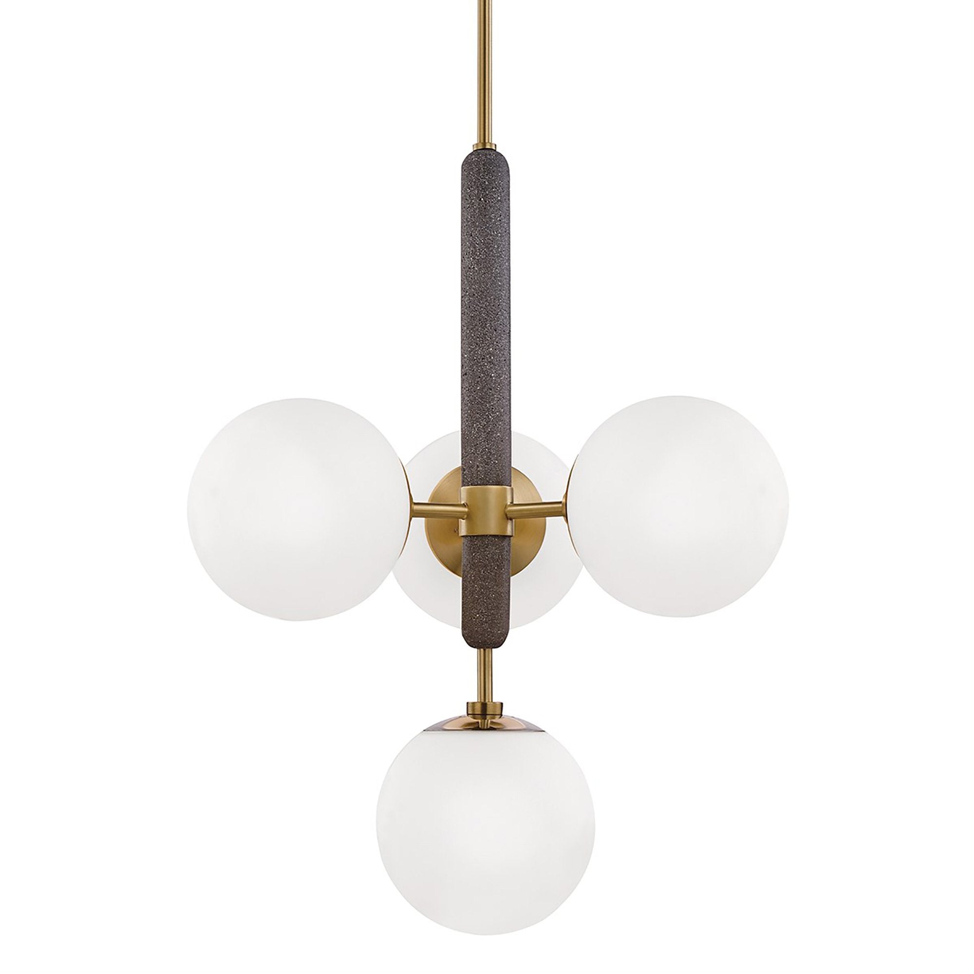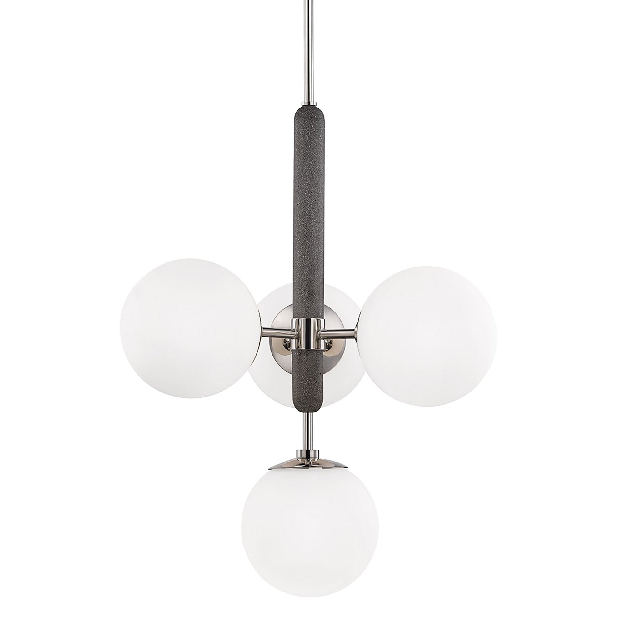 This Brielle 4-Light Pendant Light from Mitzi features a vibrant mix of materials, curved lines, and lustrous accent colors to enliven the ambiance of any home. A gray cylindrical concrete body gives it textural intrigue, while four classic round white shades with metal accents in polished nickel or aged brass add an elegant, contemporary feel to a front foyer, dining room, or living room in any modern home.