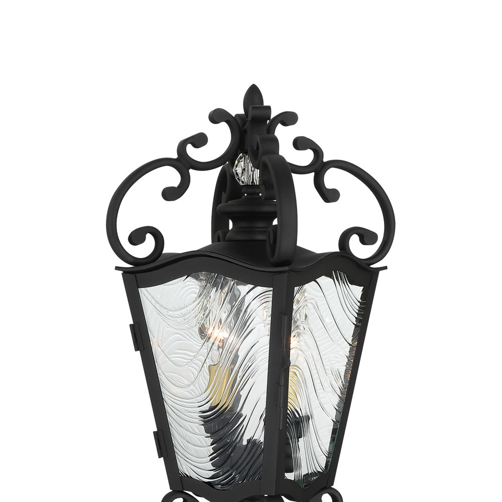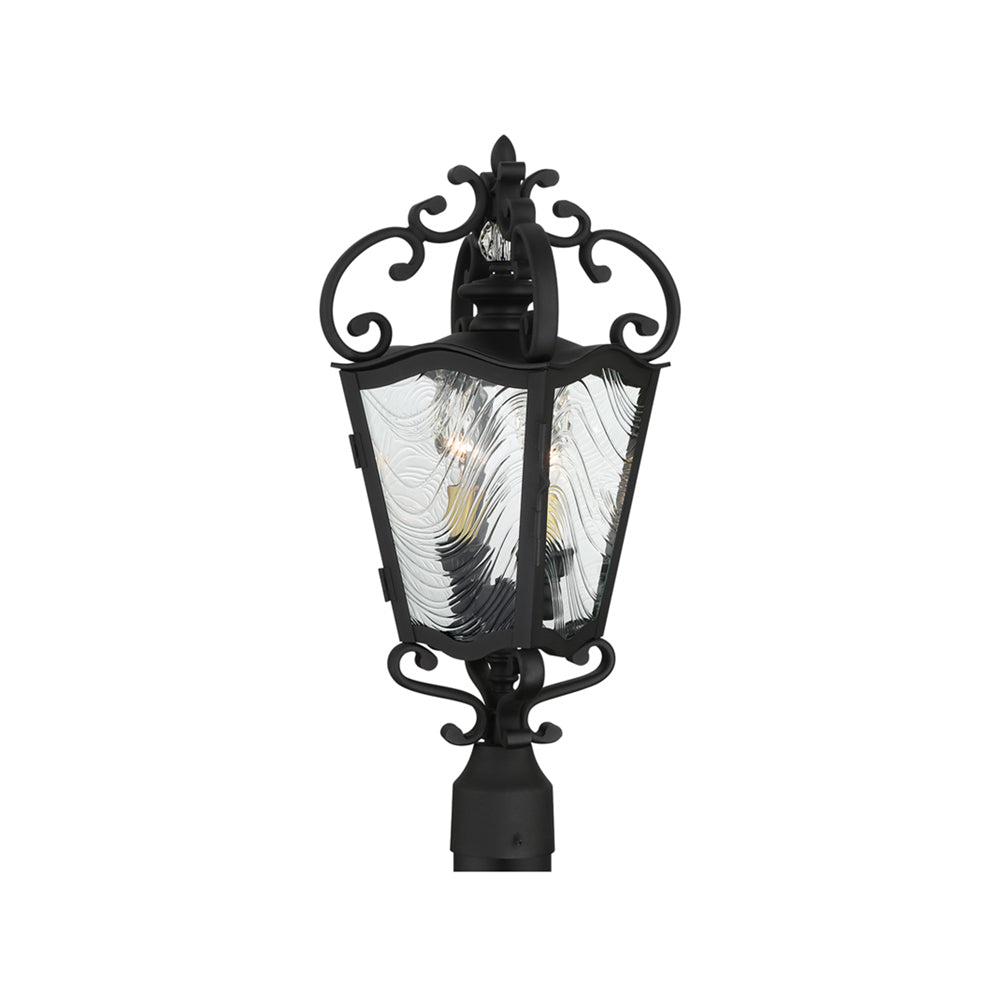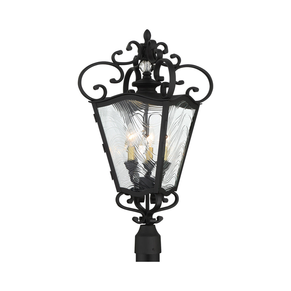 The Brixton Ivey Outdoor Post Light from The Great Outdoors offers next-level glam and inspired artistry with a modified lantern motif. Dress up a manicured yard or custom garden space with an intricately detailed sand coal finish black metal frame with soft brass accents. Romance ensues with graceful curves and clear ripple glass creating an authentic wave motif.