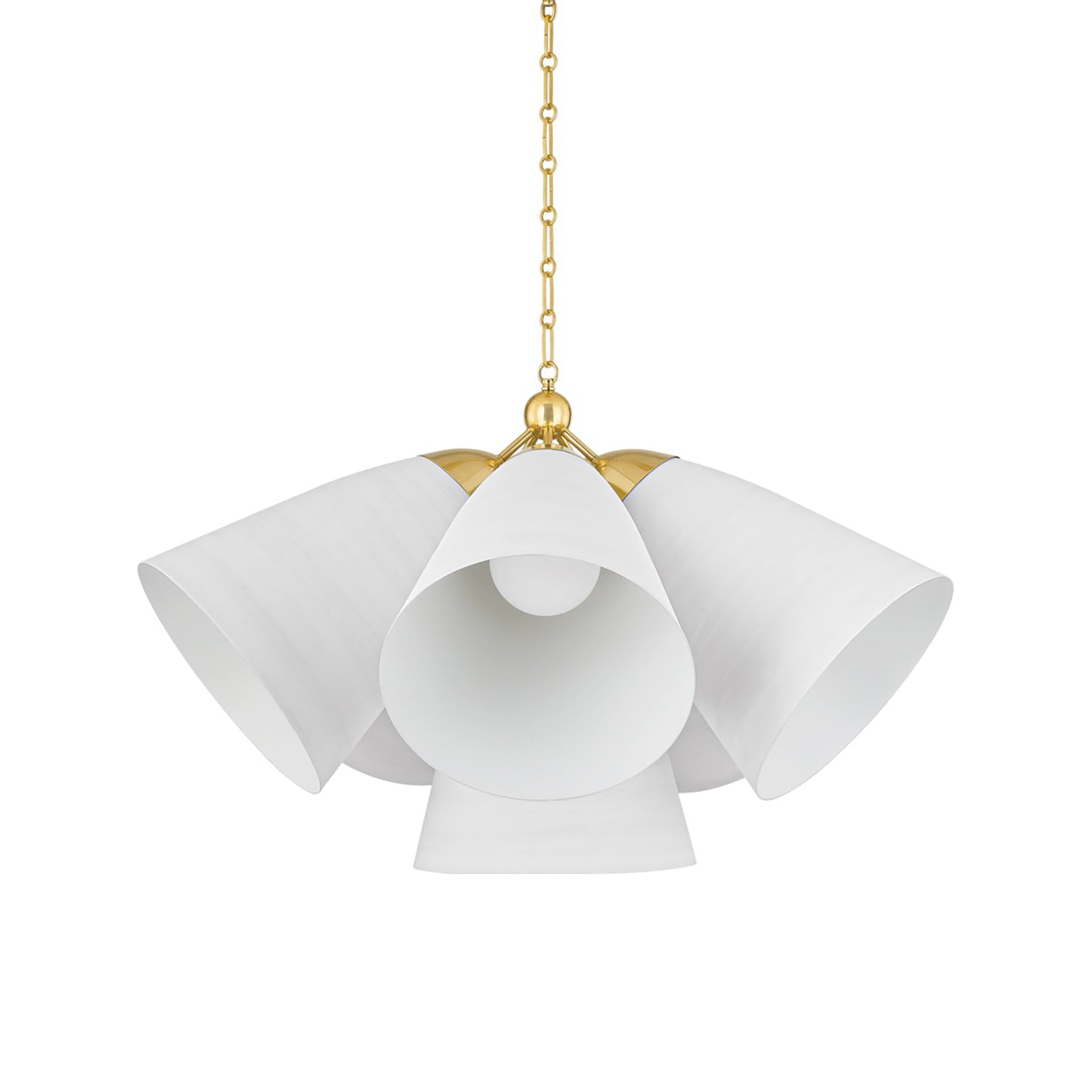 A celebrated silhouette reflects bell-shaped shades infusing brilliant illumination as the Bronson Chandelier from Hudson Valley Lighting adds an uplifting impact. A hint of Mid-Century Modern style follows this fixture that arranges white plaster shades in an orderly cluster, with subtle yet inspired aged brass metal accents adding surreal warmth. This creatively designed chandelier is a must-have light source to complement dining ensembles, foyers, and living spaces.
