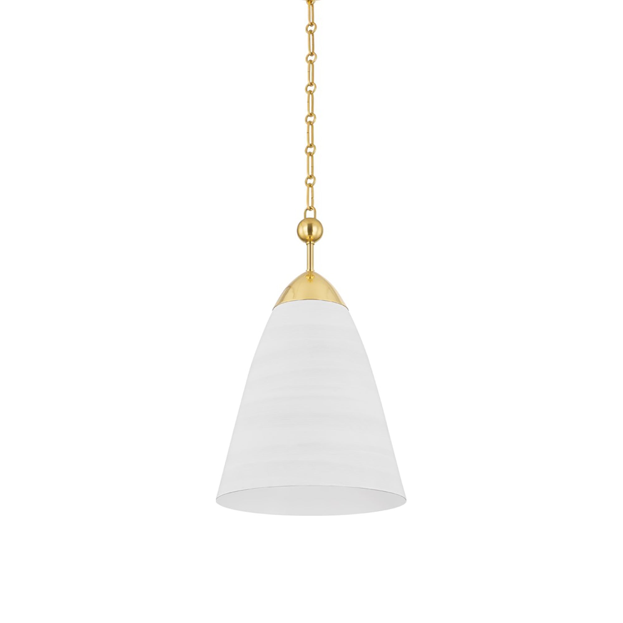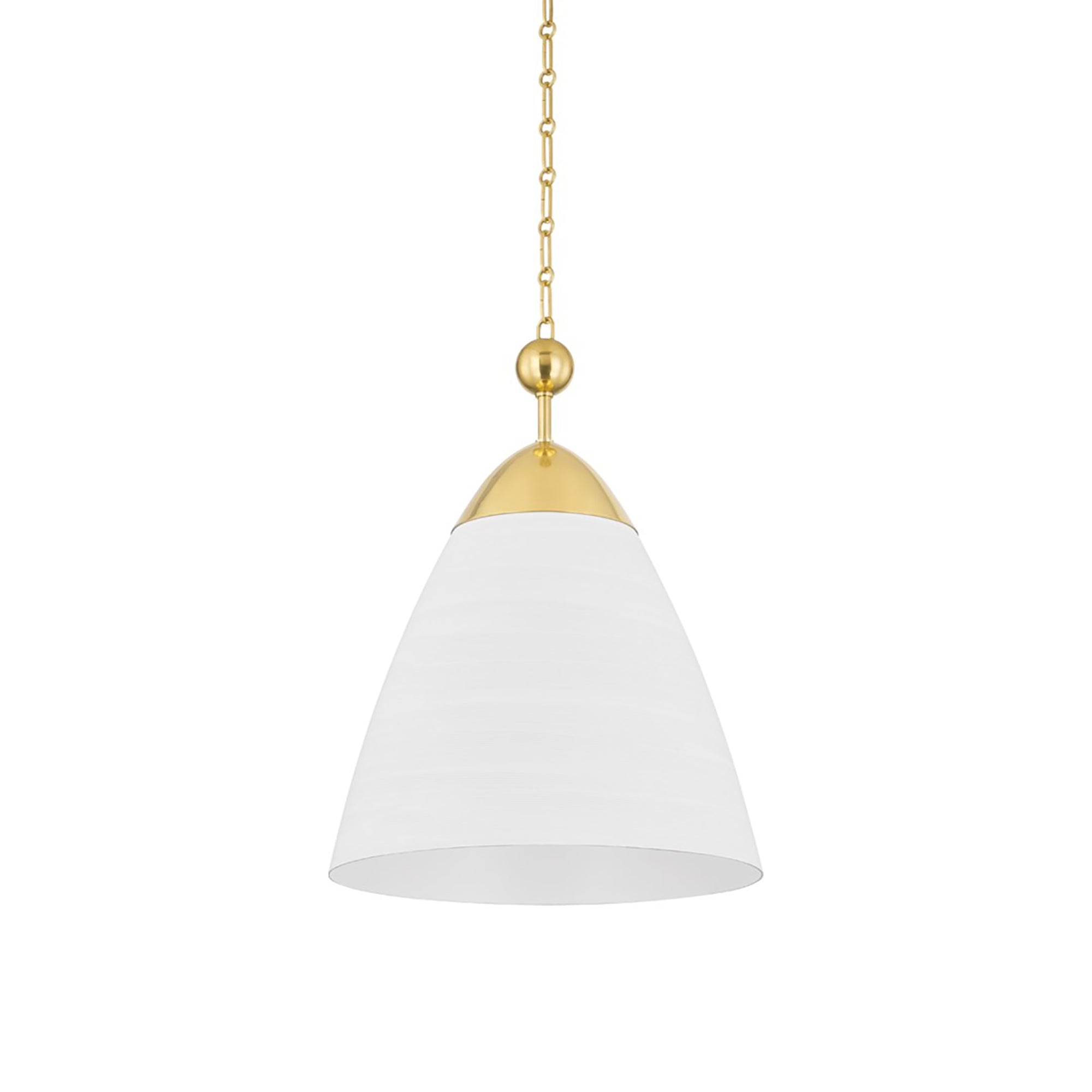Reworked elegance is not what it seems in a light fixture with hybrid artisan and Mid-Century Modern style motifs. The Bronson Pendant Light from Hudson Valley Lighting emphasizes organic essence with a bell-shaped white plaster shade creating sheer simplicity, accented with warm aged brass metal. Versatile and self-explanatory, its aesthetic is both simple and remarkable.