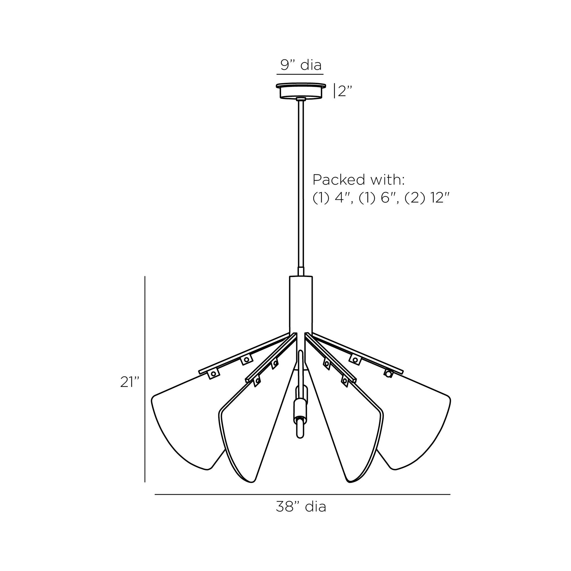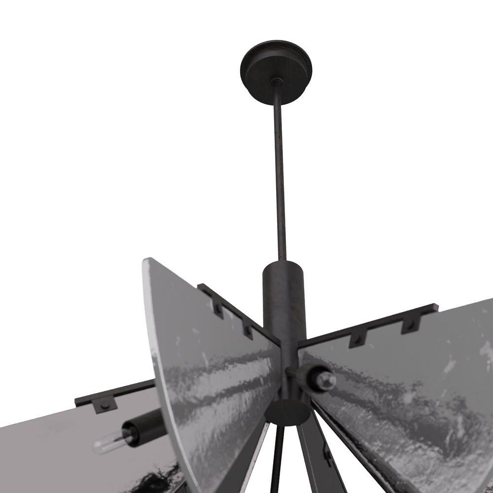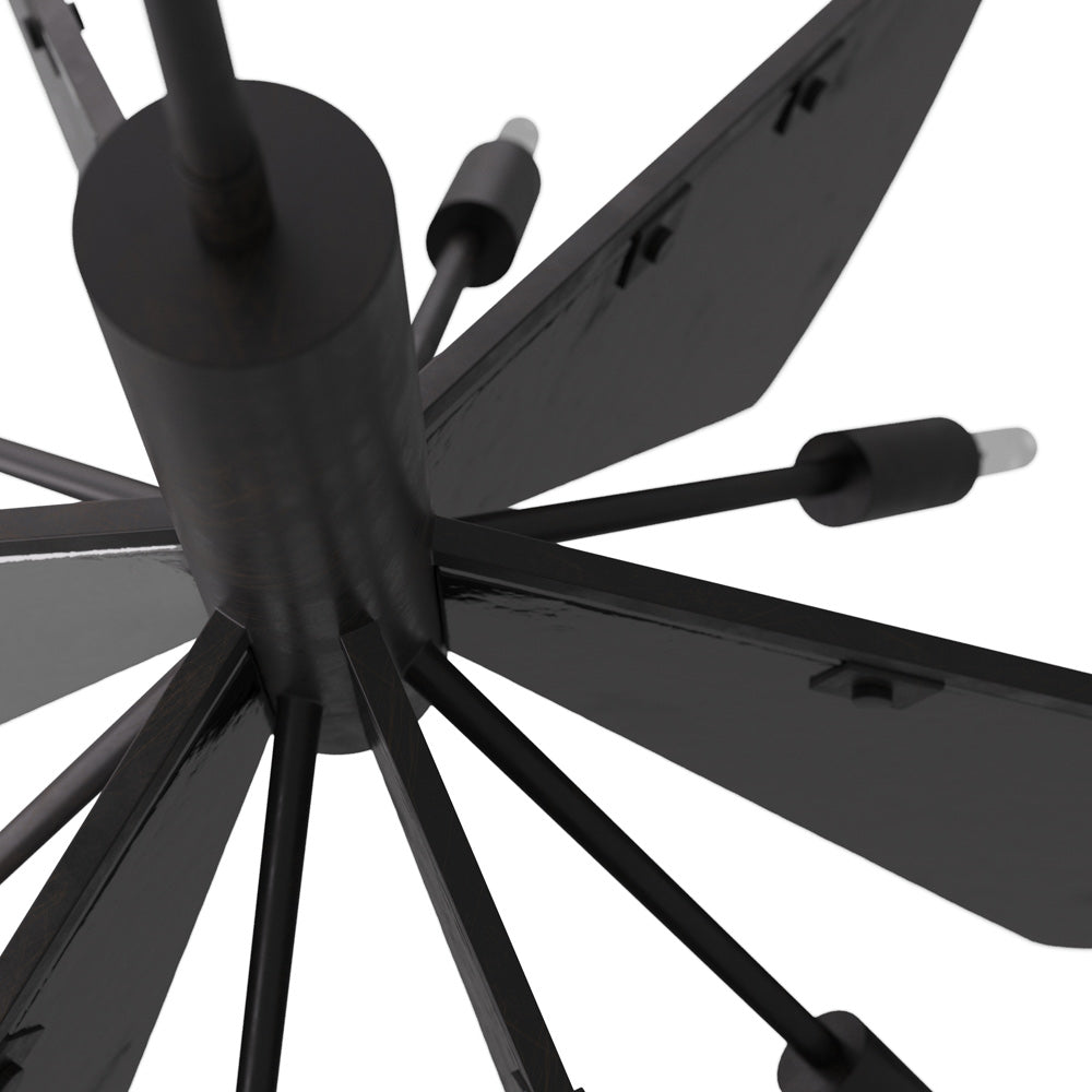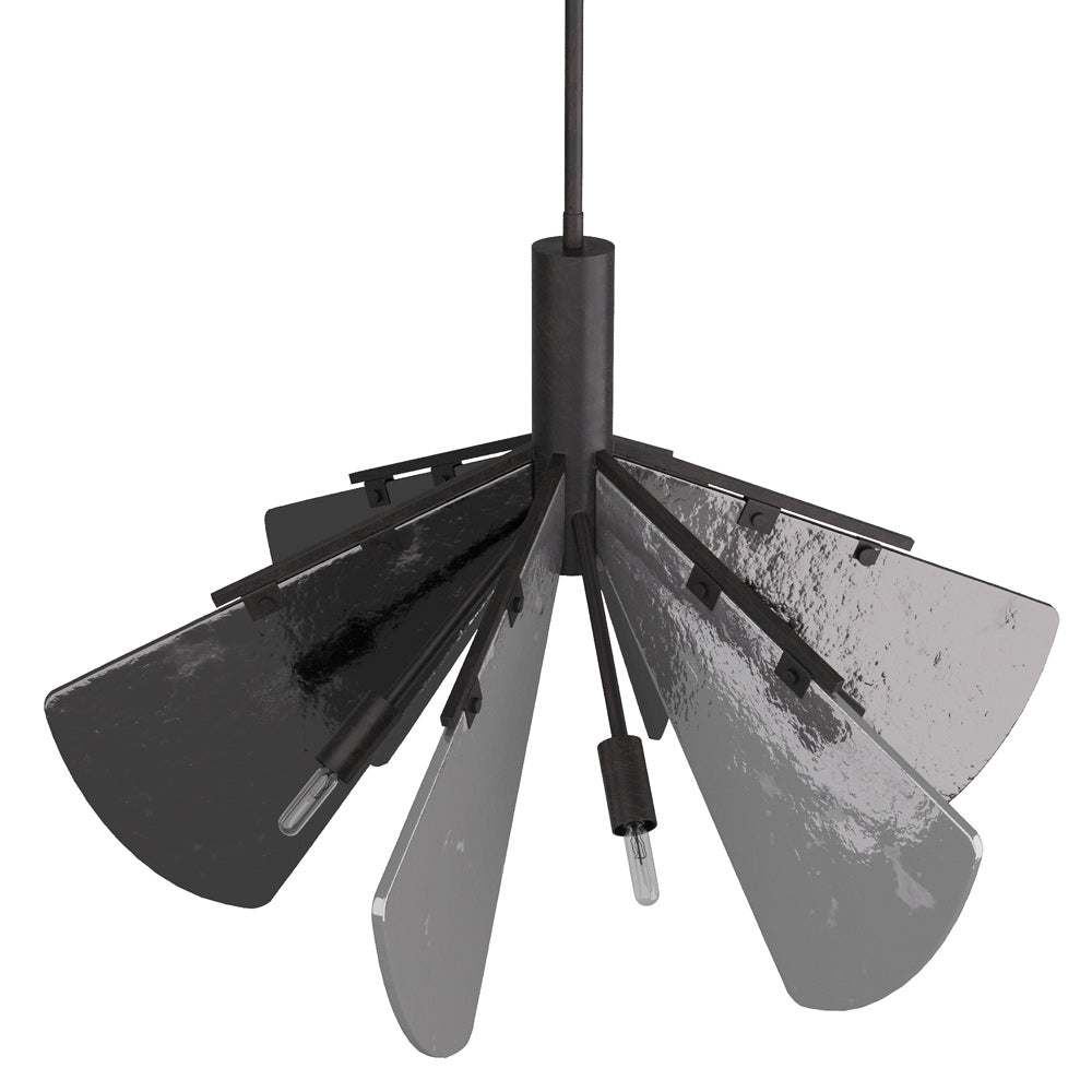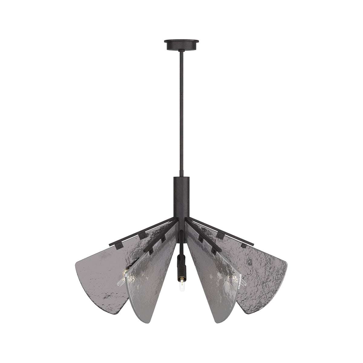 A curious mix of glam artistry and grunge industrial strikes a balance as it crafts an enticing look in lighting. The Bryant Chandelier from Arteriors alters a blade-like cluster of smoke slump glass fans, tipped to embellish a decadent shape. English bronze finish iron framing and accents add a dramatic touch ideal for its timeless design.