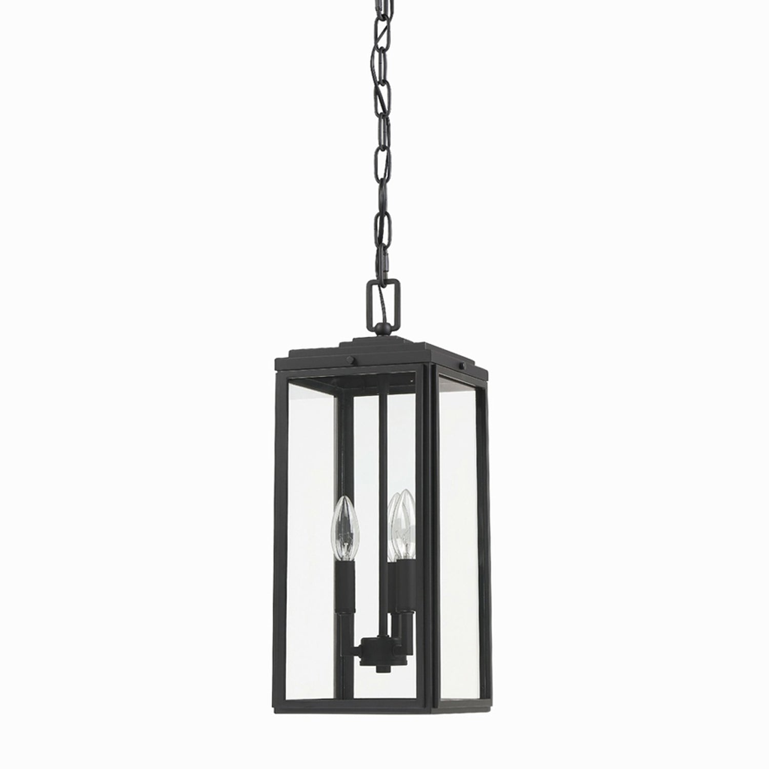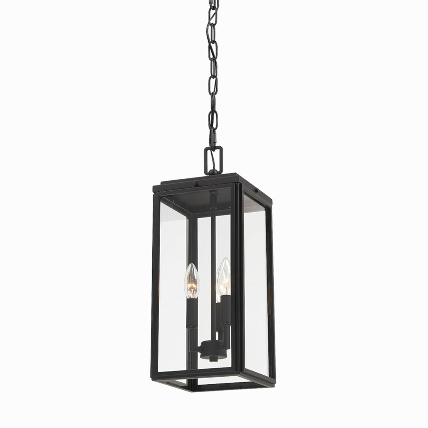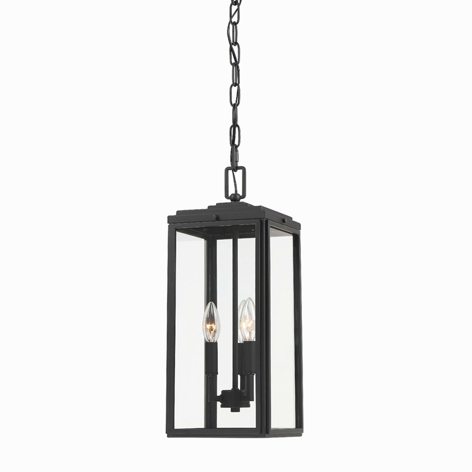 The Byron Outdoor Pendant Light from Crystorama delivers an iconic lantern motif modernized to reflect trending standards. Embrace the bold matte black finish metal construction of an elongated fixture with clear glass panels and exposed bulbs. This versatile light lasts through periodic remodels.
