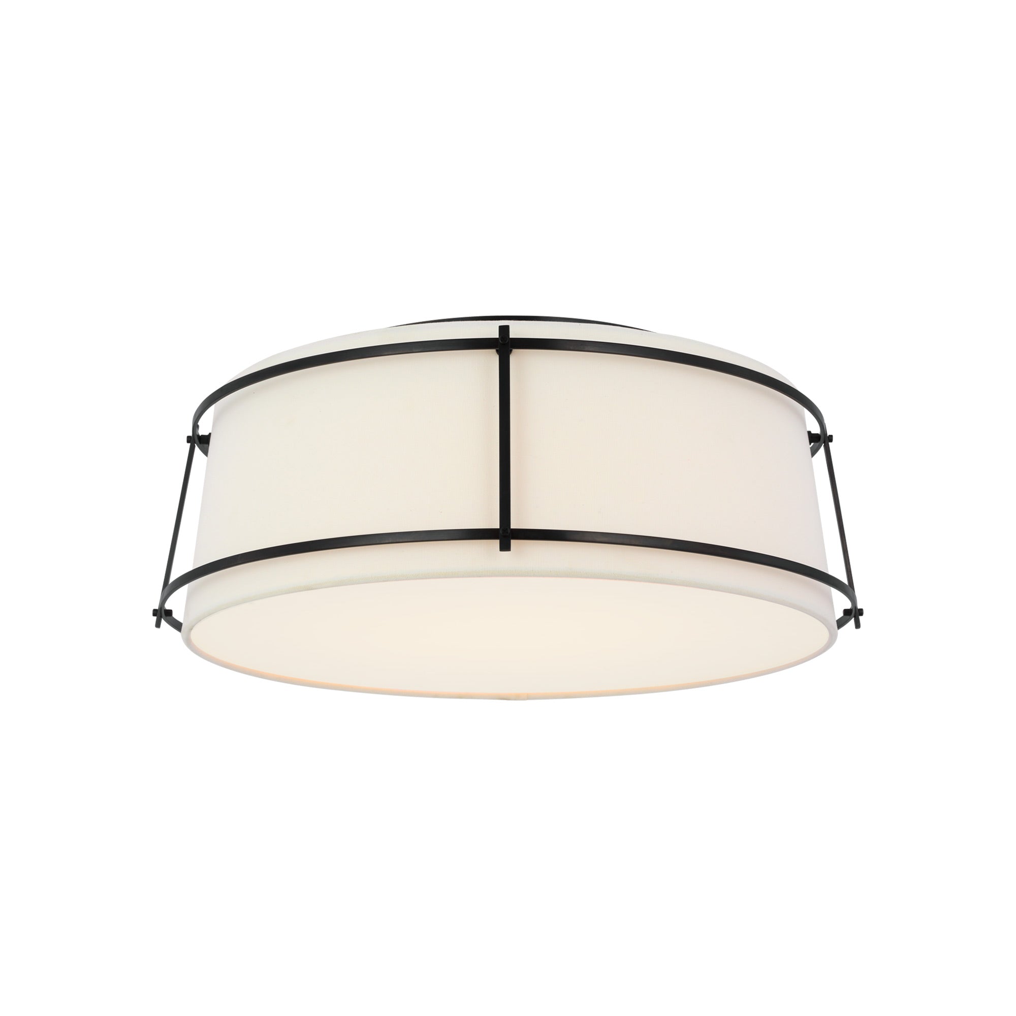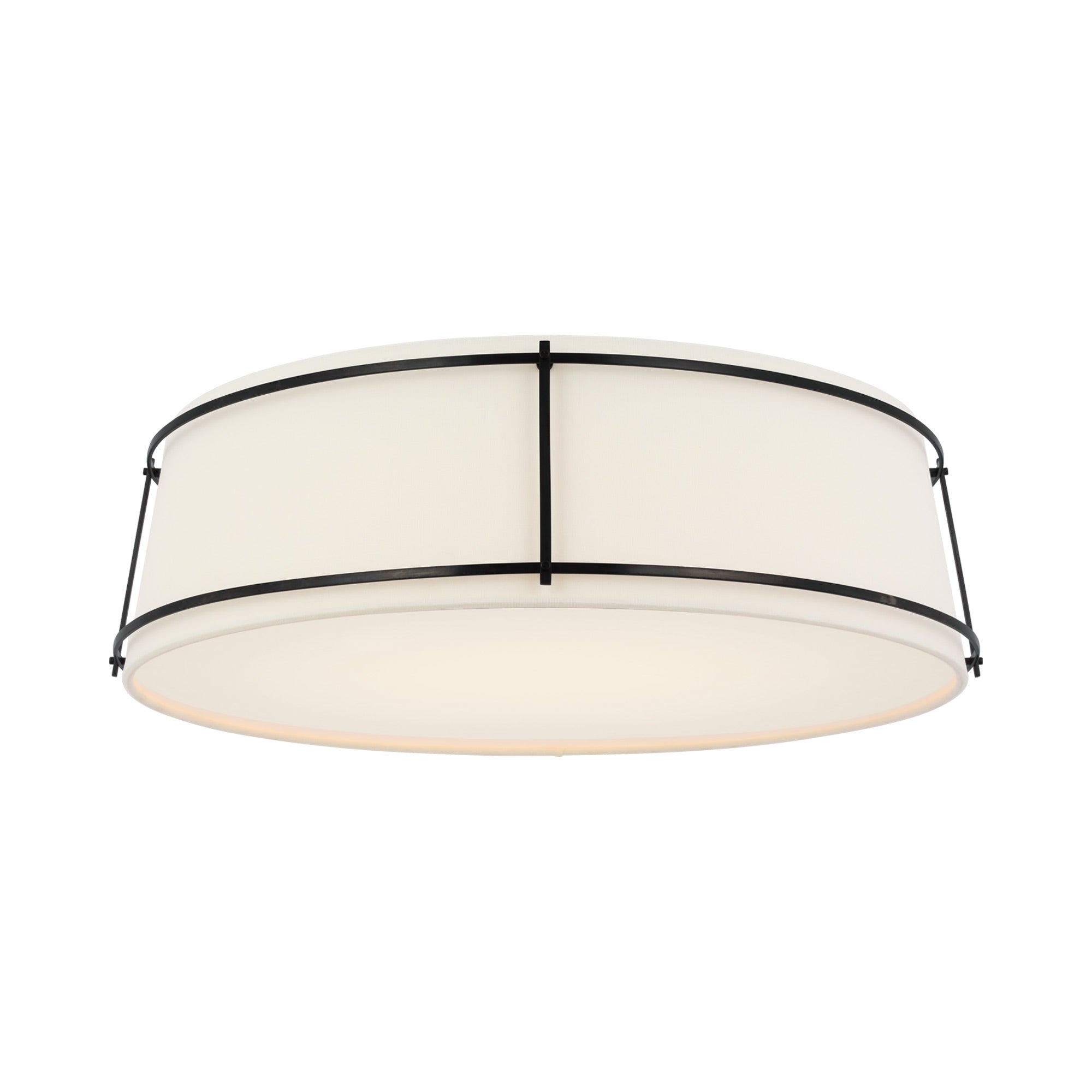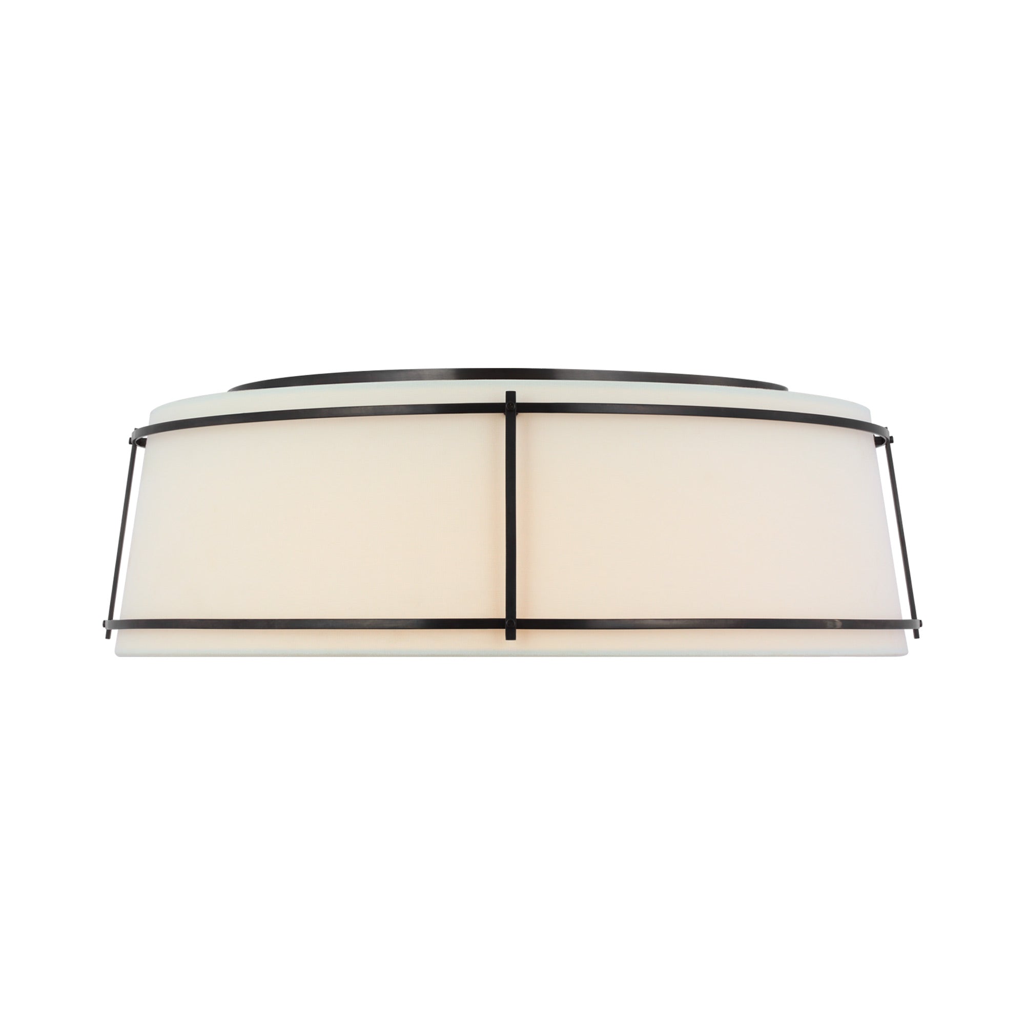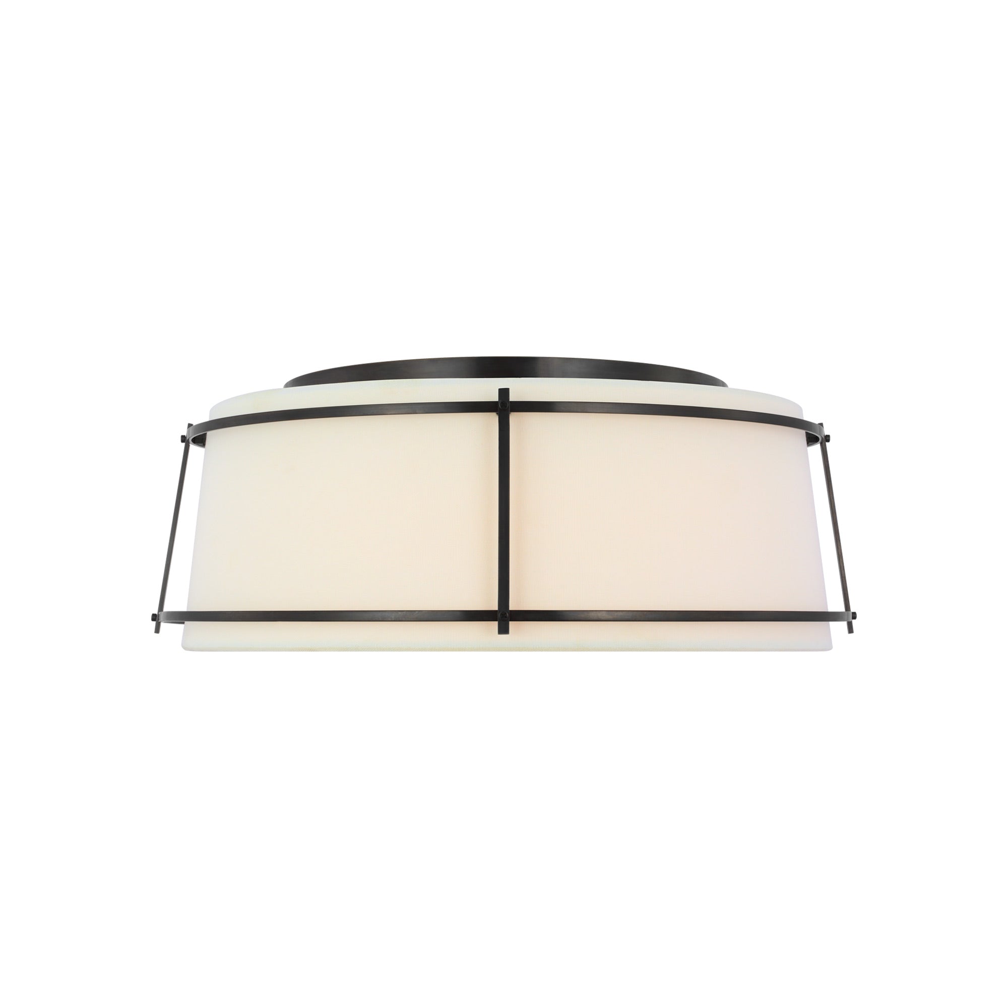 A playful aesthetic brings cheeky personality to kitchens and living areas as the Callaway LED Flush Mount Ceiling Light from Visual Comfort Signature takes a new approach to interior lighting. Basic minimalism pairs a tapered linen and frosted acrylic shade, refined with slender metal openwork framing that makes it stand out to be noticed.