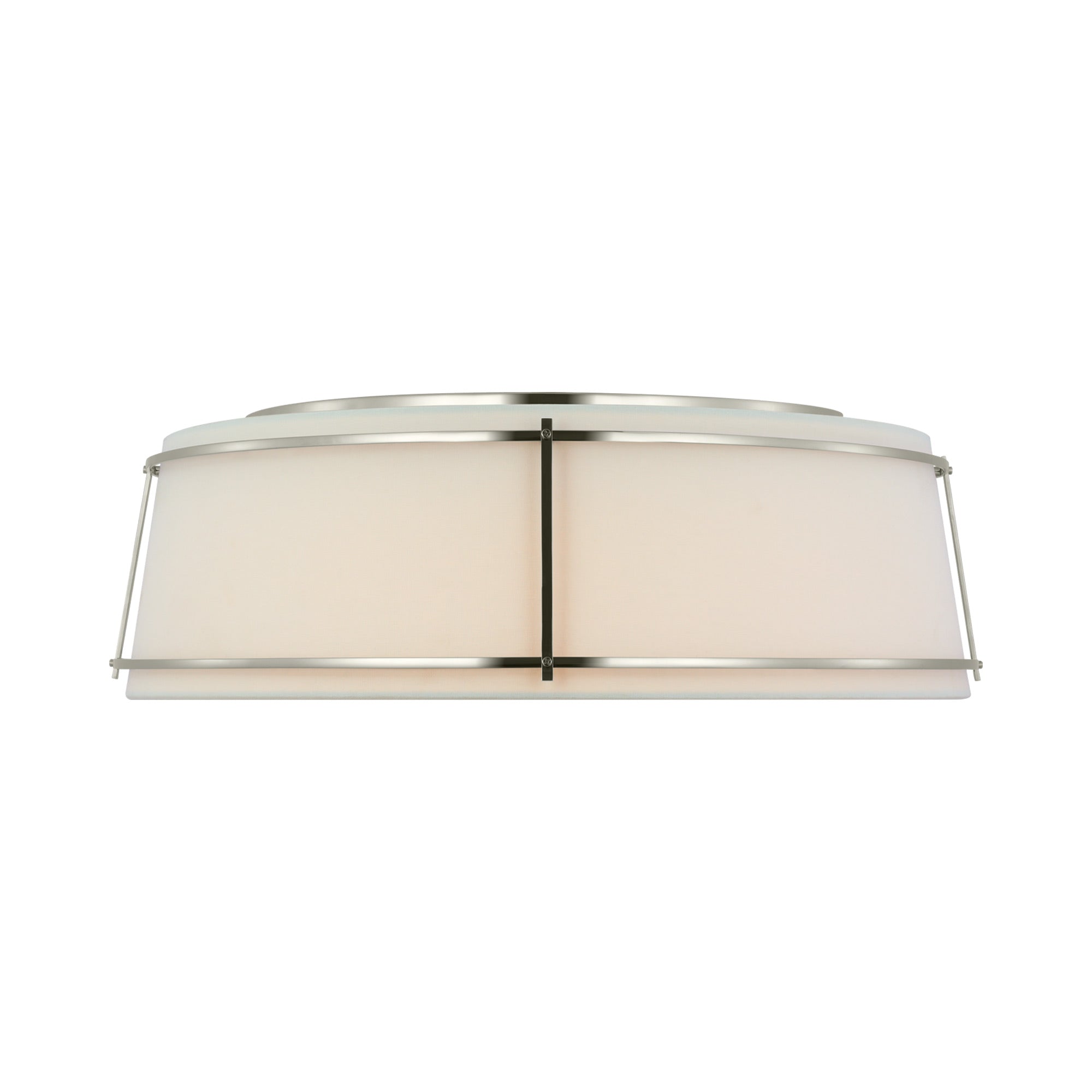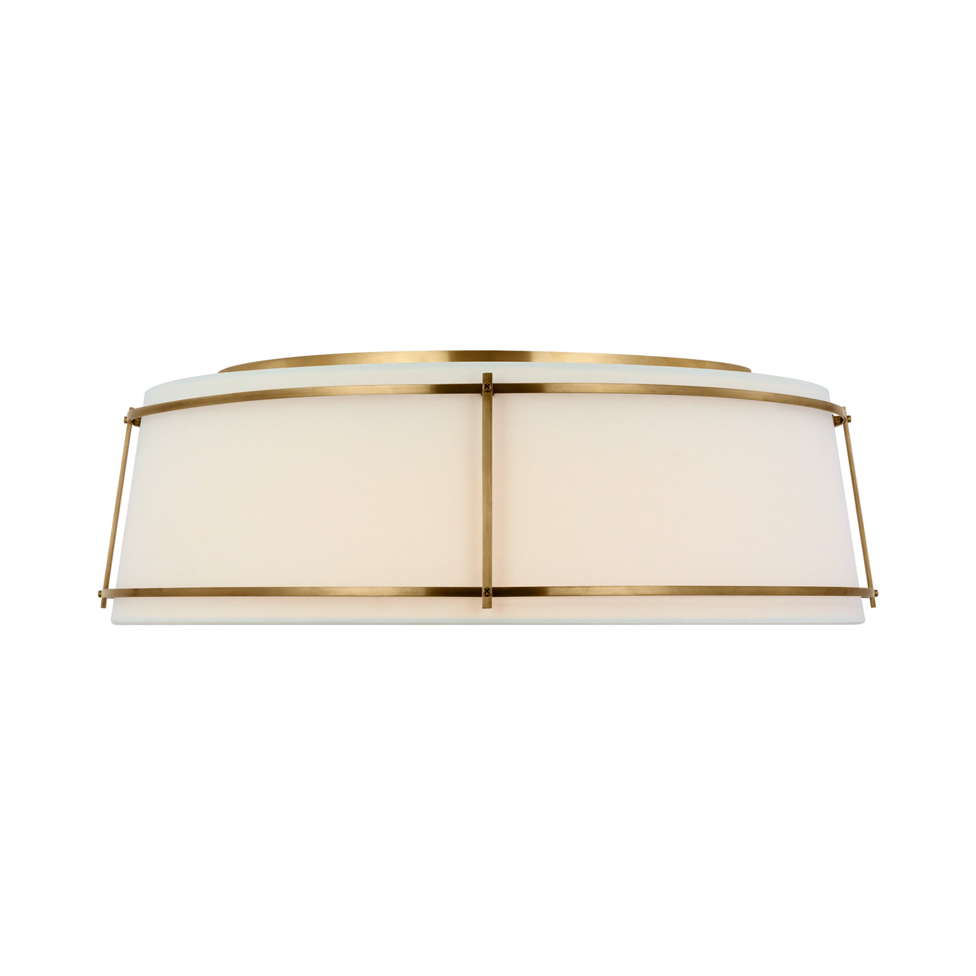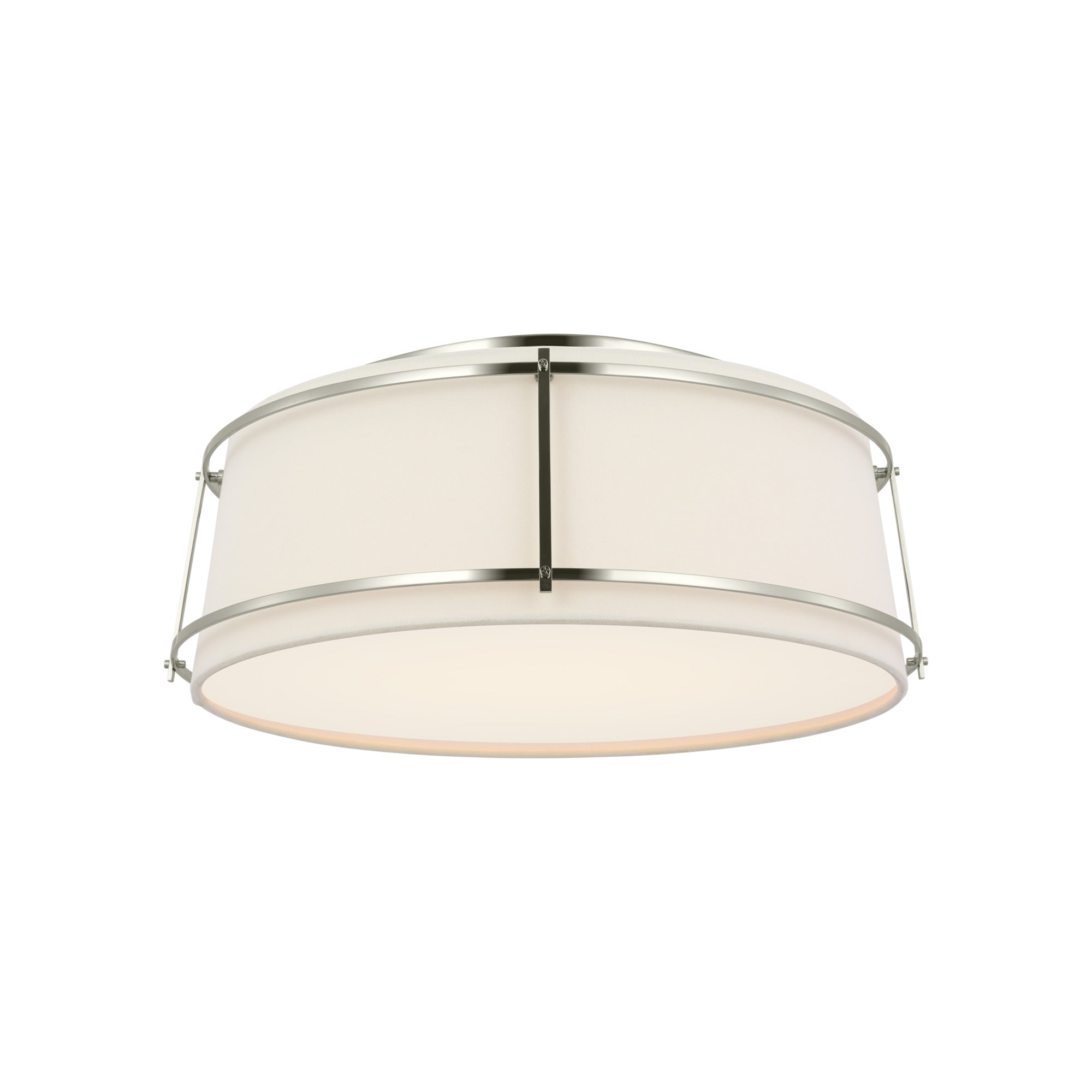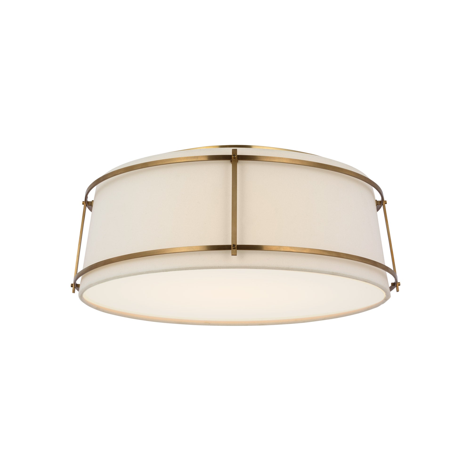 A playful aesthetic brings cheeky personality to kitchens and living areas as the Callaway LED Flush Mount Ceiling Light from Visual Comfort Signature takes a new approach to interior lighting. Basic minimalism pairs a tapered linen and frosted acrylic shade, refined with slender metal openwork framing that makes it stand out to be noticed.