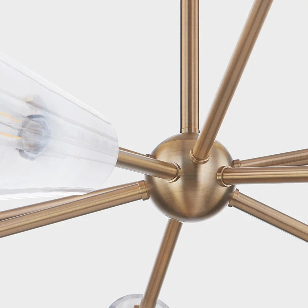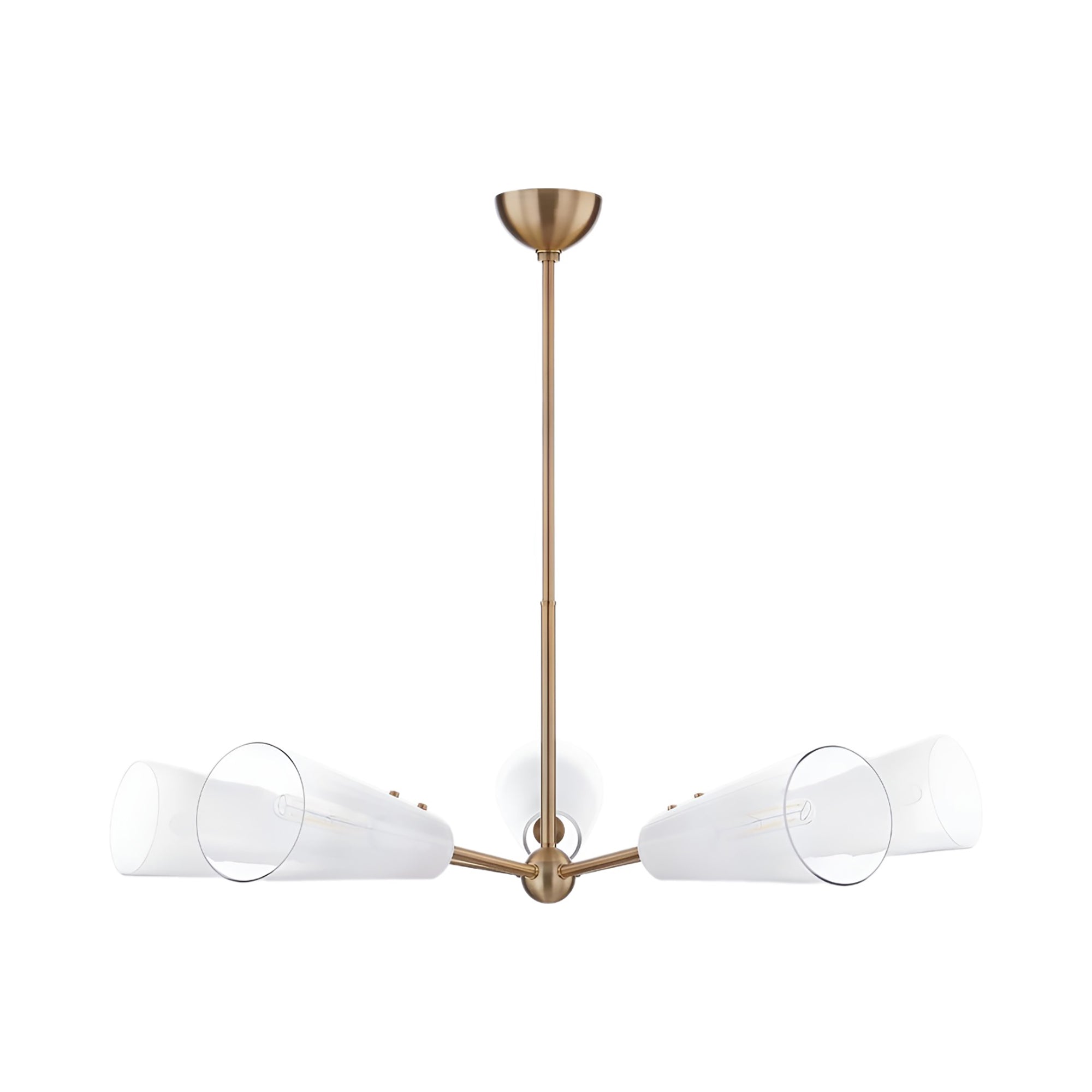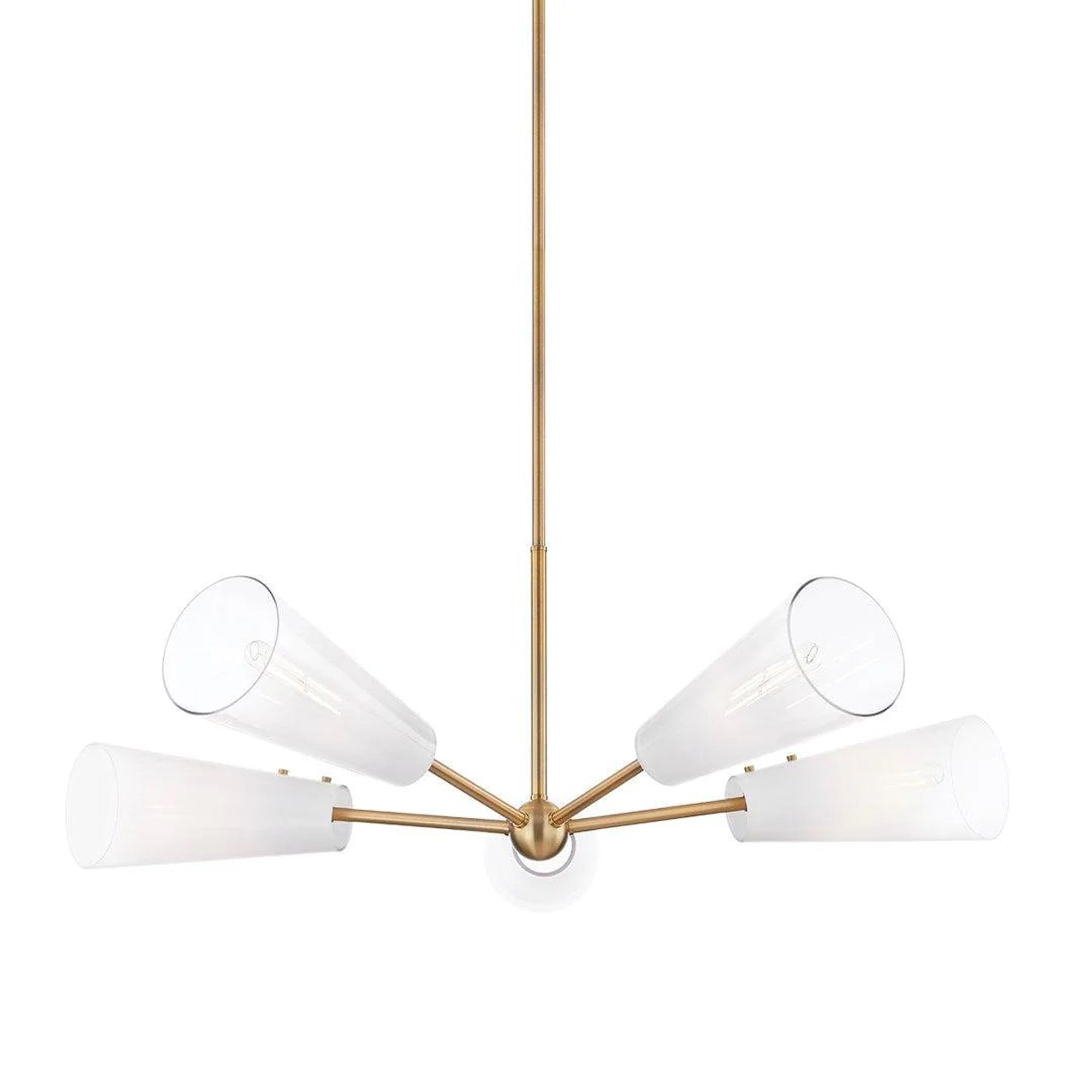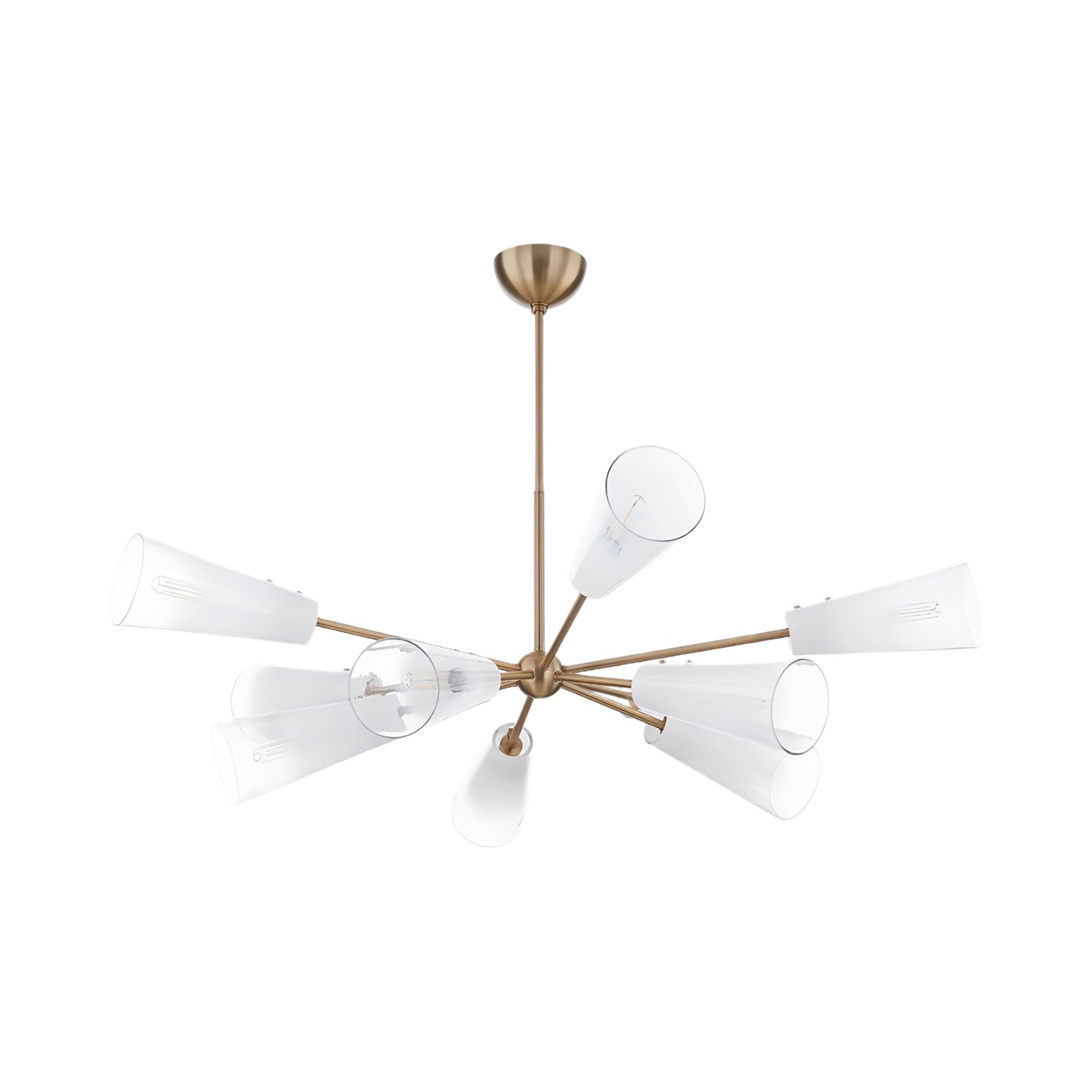 Delicate shapes and linear personality meet in the middle with a distinctive perspective in mind. Metal arms and framing in a decadent patina brass finish adds a starting point to the Camarillo Chandelier from Troy Lighting, a work of low-key art just sophisticated enough to embellish a custom setting. Conical glass shades with a hint of ombre impact dance with dazzling light, dramatizing a foyer, dining ensemble, or living room.