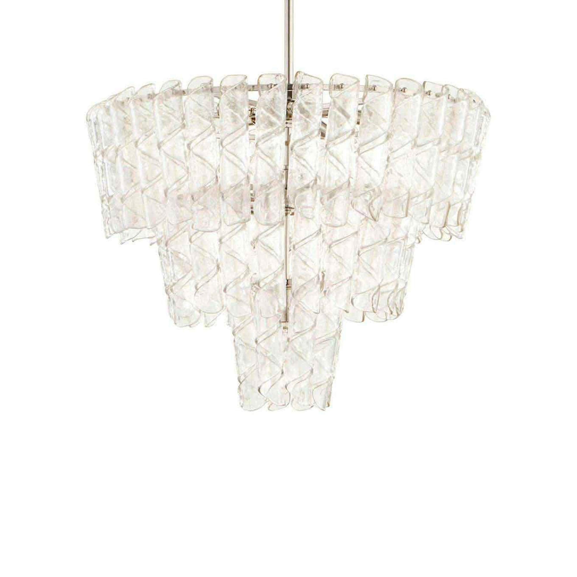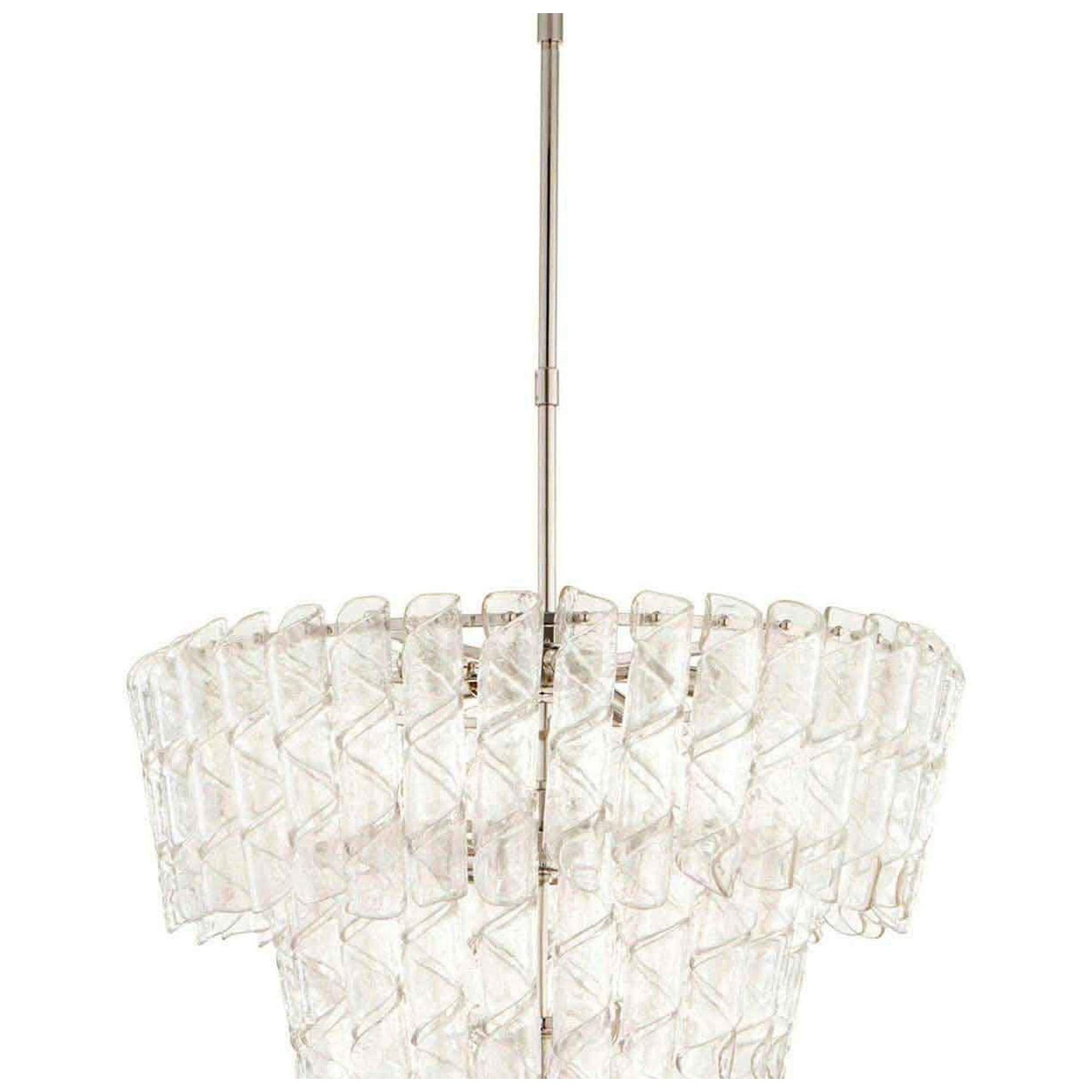 Inspired by a classic Italian dessert, this eight-light glass chandelier is a stunning centerpiece in any room. Featuring an iron frame in a graceful, gleaming polished nickel finish, the chandelier offers stunning opulence in a dining area or entry. Shaded in clear glass tubes with wavy details, a layered effect is created with a larger tier set above a smaller tier. Emphasize a sophisticated decor aesthetic with this gorgeous chandelier design.