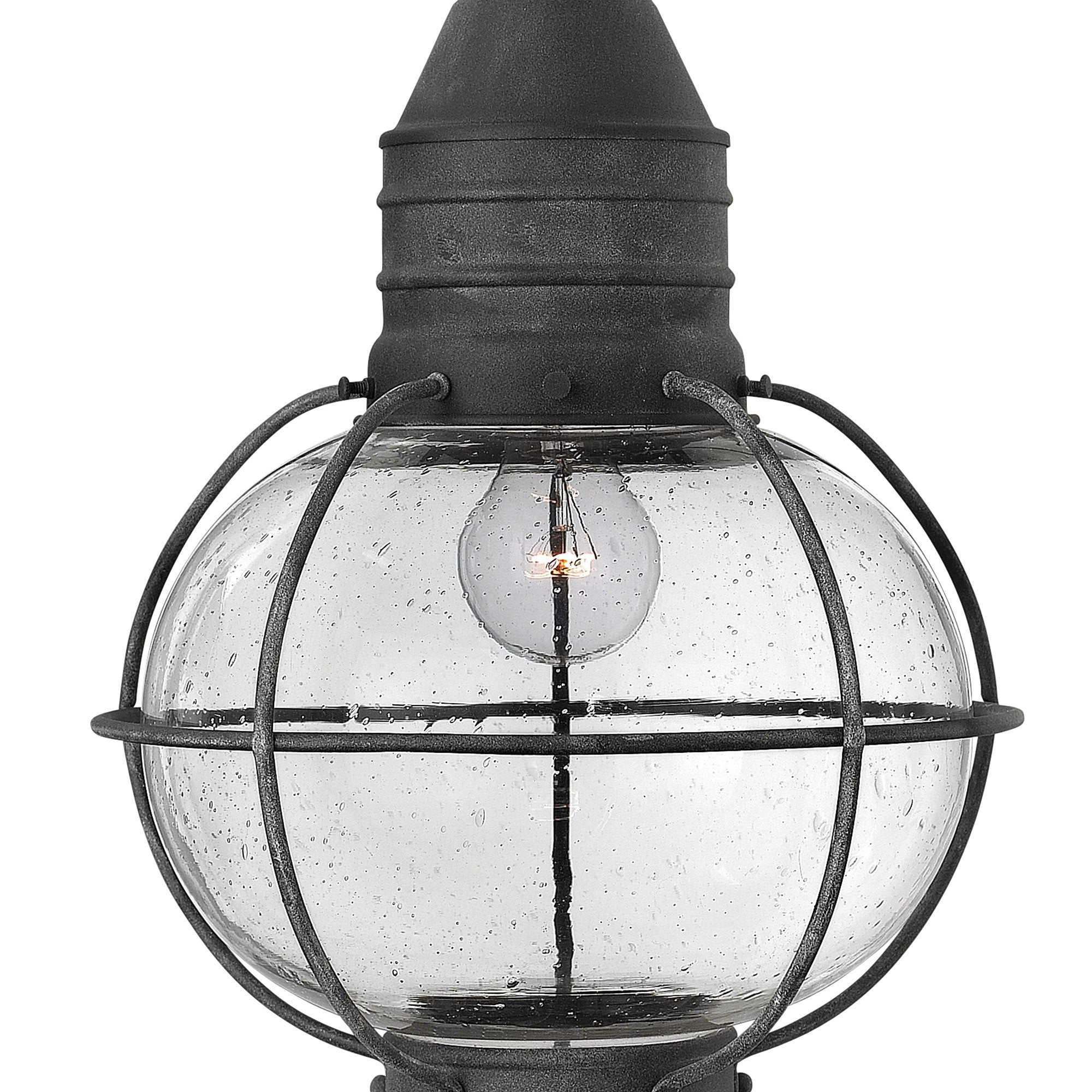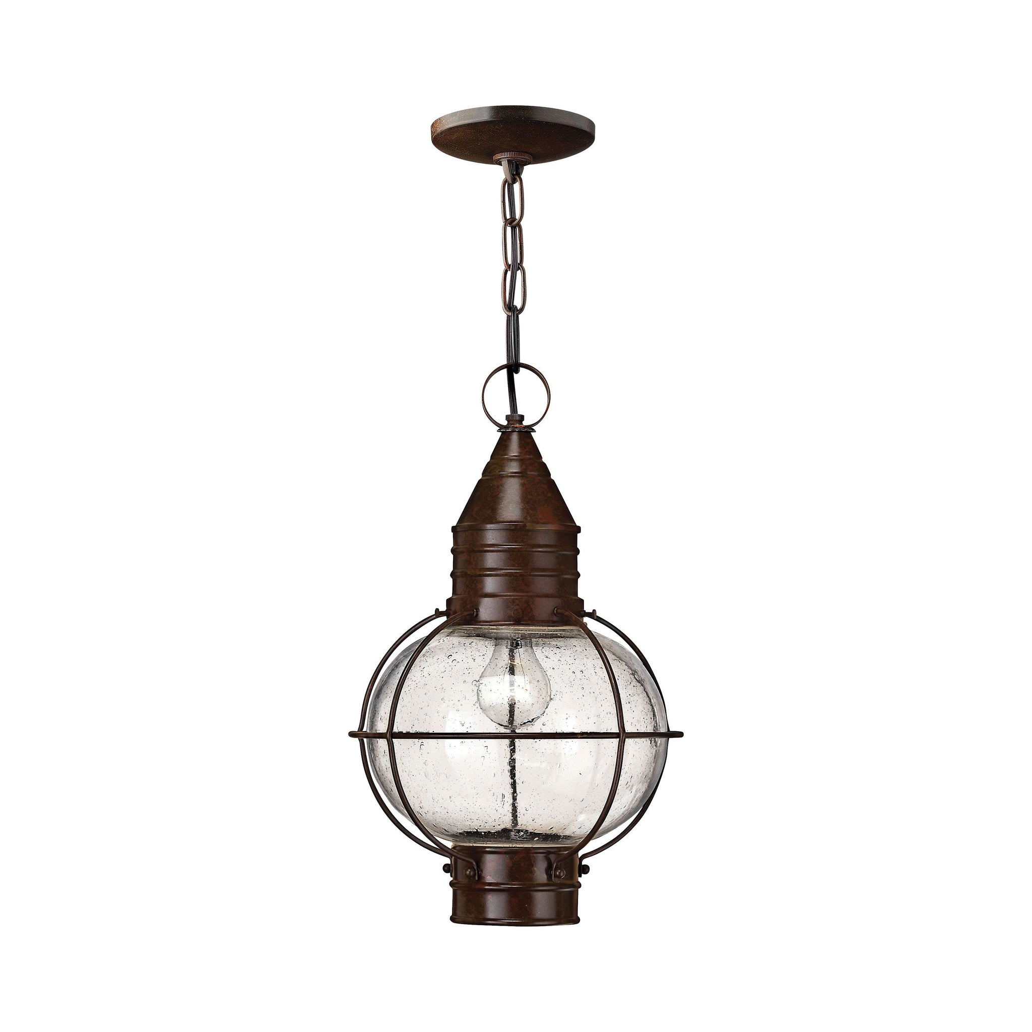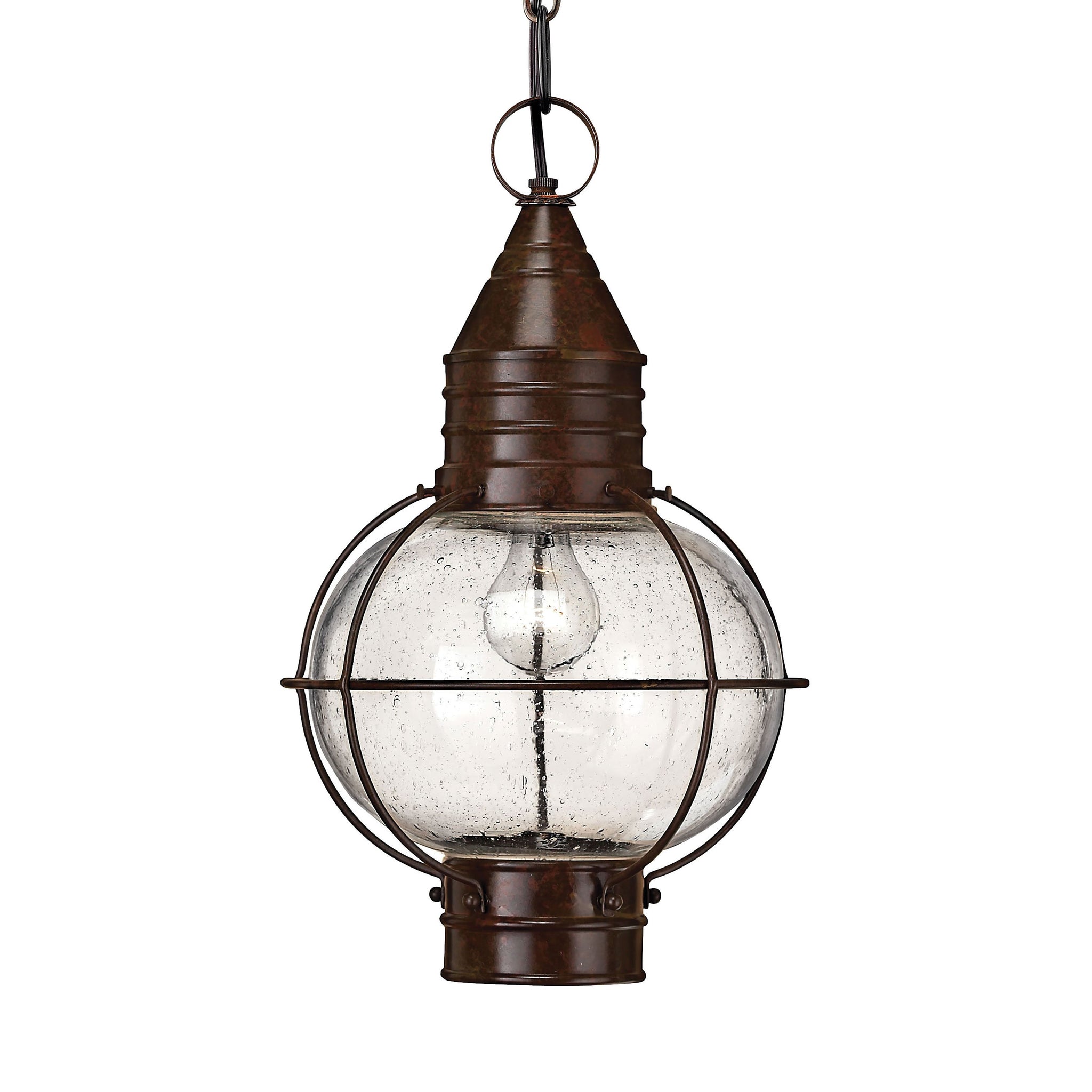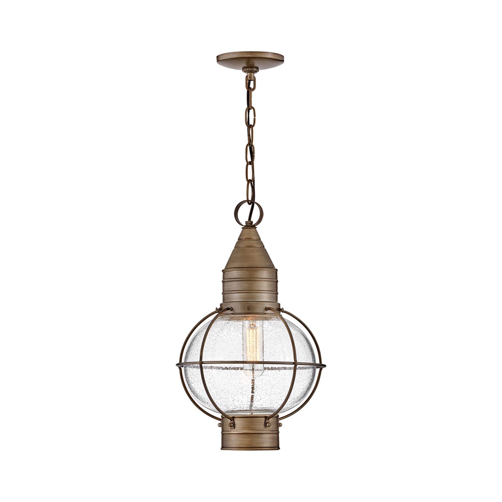Cape Cod Outdoor Pendant Light's classic onion lantern design conveys New England style. The solid aluminum construction and clear seedy glass add vintage appeal.